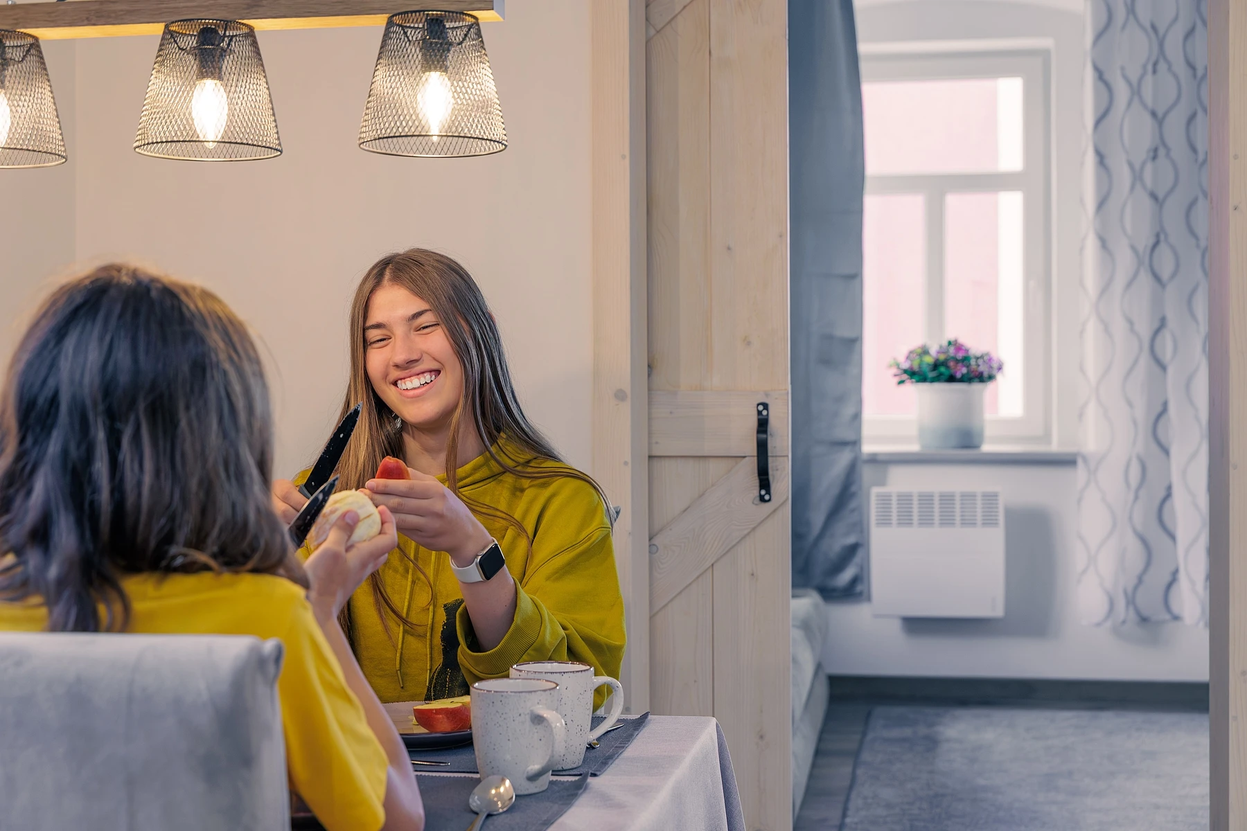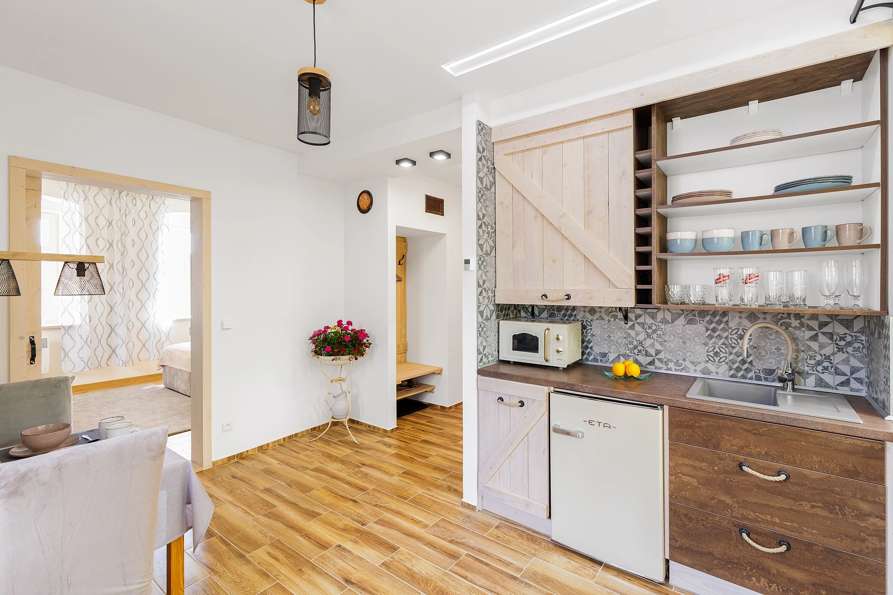 Součástí apartmánu je ložnice s dvoulůžkem (180 × 200 cm) a k dispozici je také rozkládací pohovka. Kuchyňská část je plně vybavená a zahrnuje kuchyňskou linku s dřezem, lednici s malým mrazákem, rychlovarnou konvici, elektrický vařič, myčku na nádobí a jídelní stůl se židlemi.