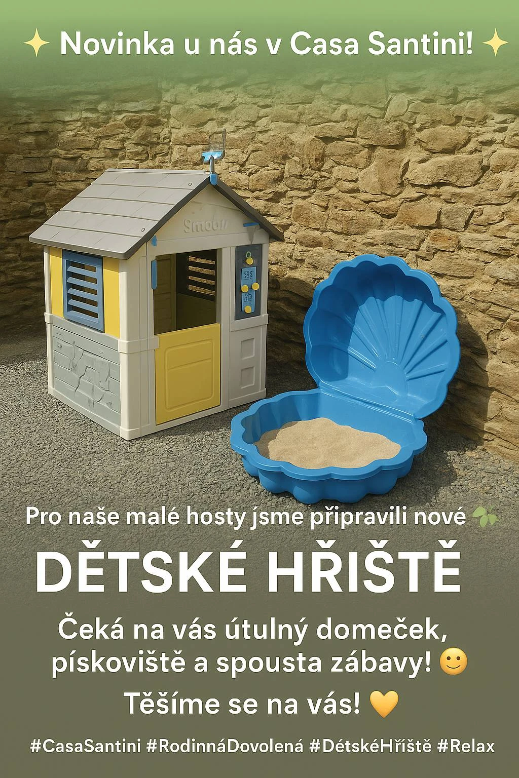 Venkovní terasa je vybavena posezením pro 12 osob, grilem a ohništěm, což poskytuje ideální zázemí pro letní večery a grilování. Pro zábavu je k dispozici TV se širokým výběrem programů. Celkově je Casa Santini dobře vybavena pro pohodlný a funkční pobyt.