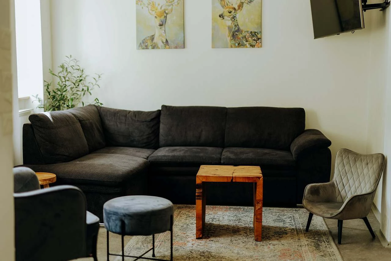 - Společenské místnosti: Dva menší prostory s rozkládacím gaučem, vhodné pro odpočinek nebo přespání.