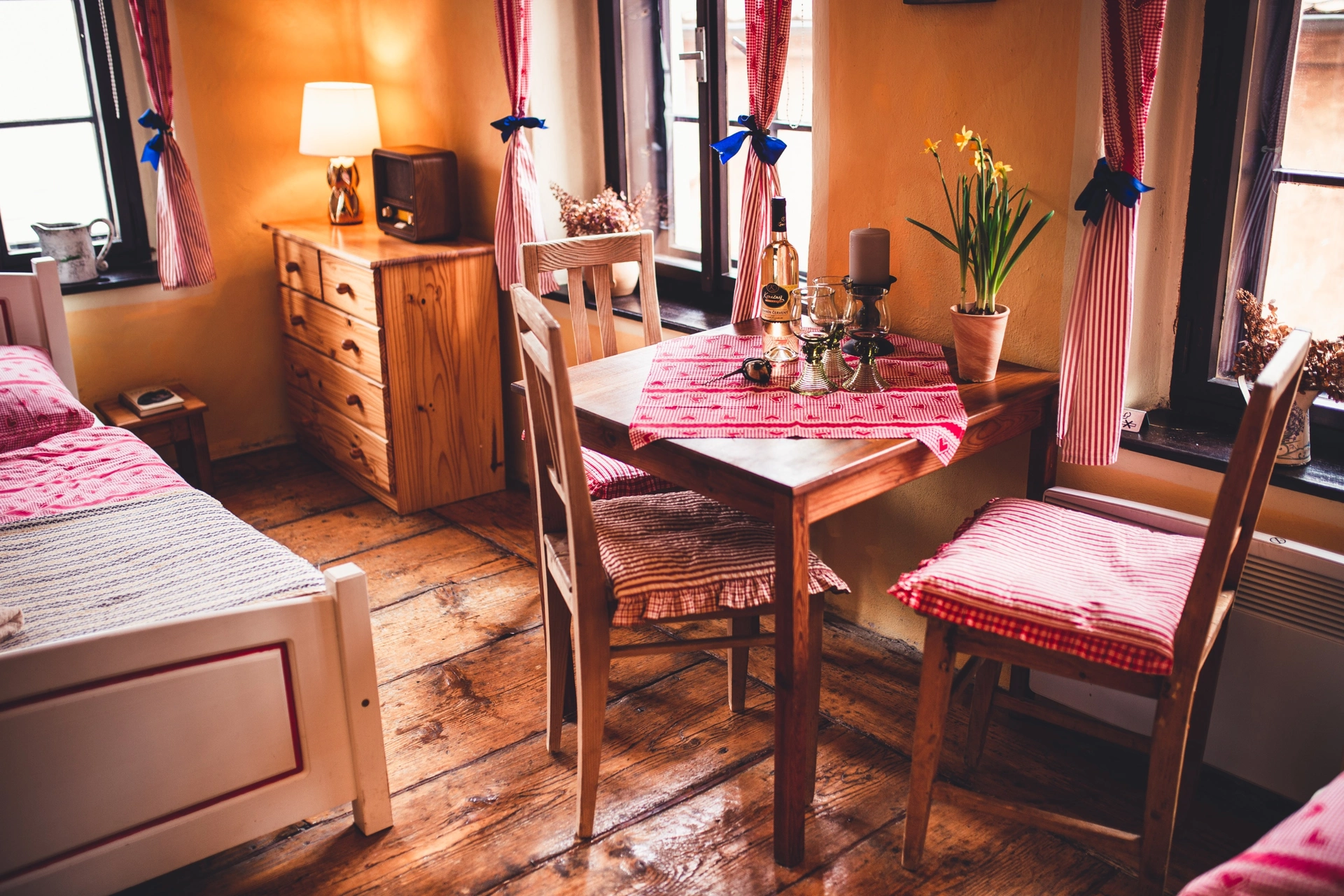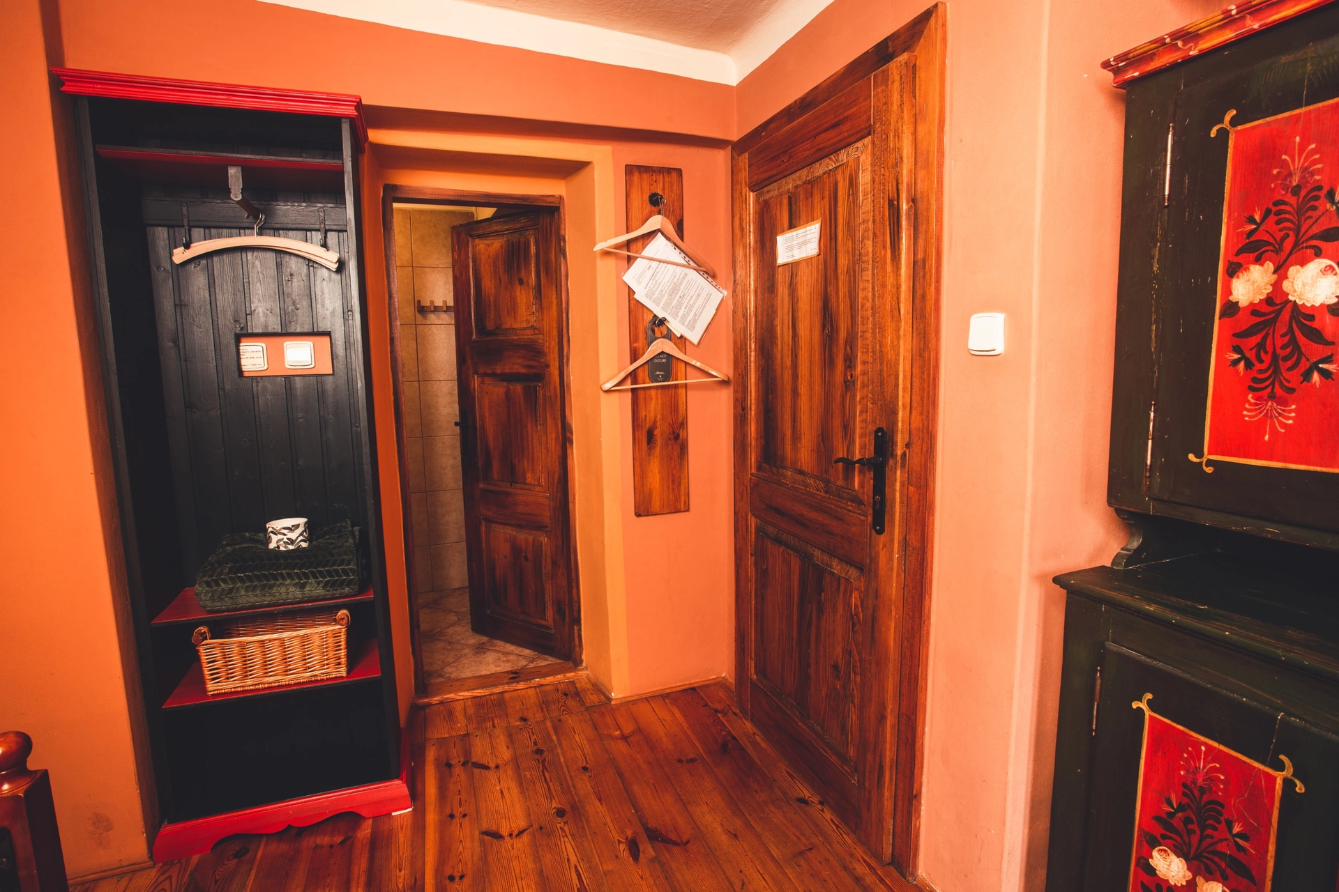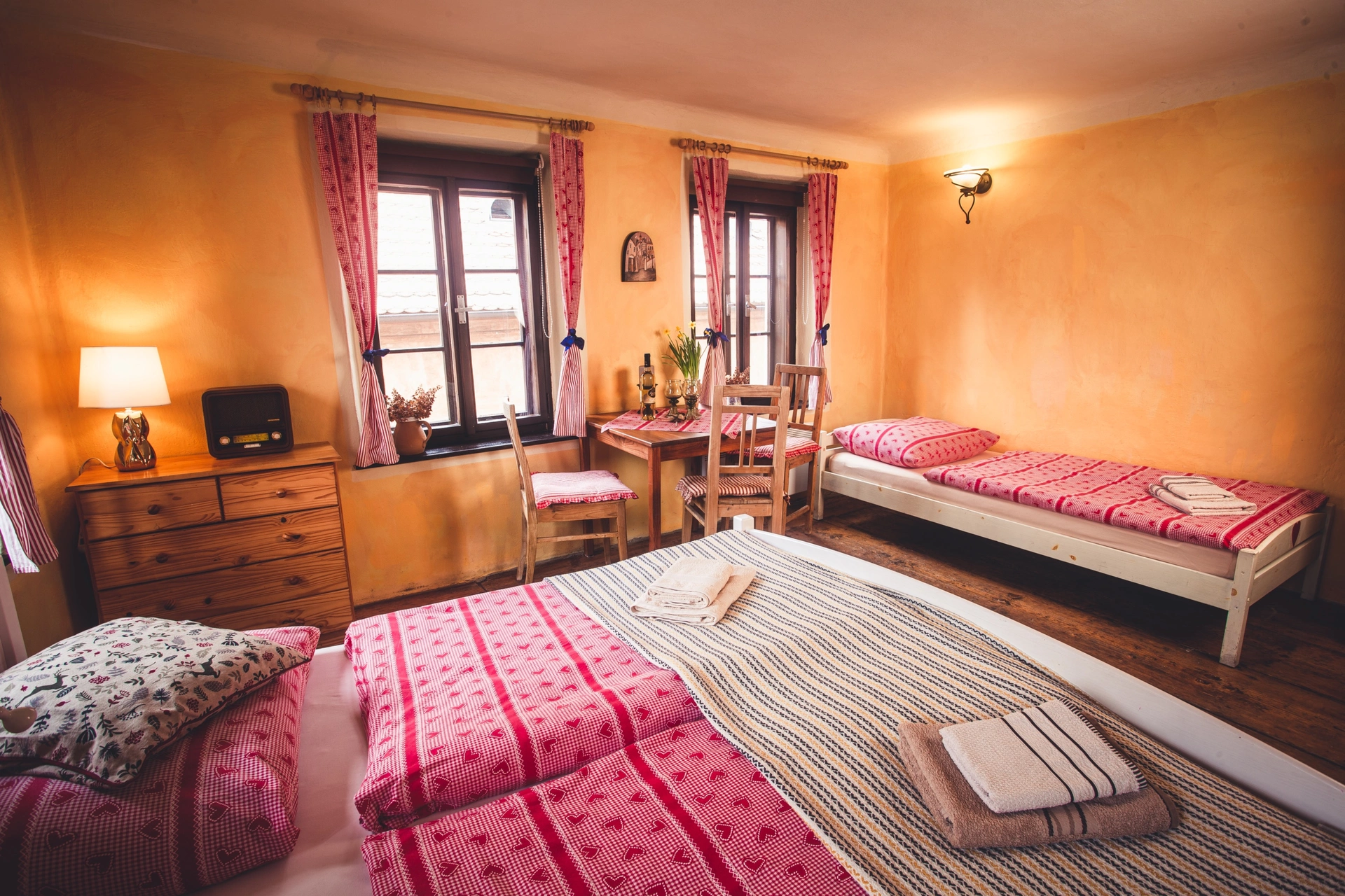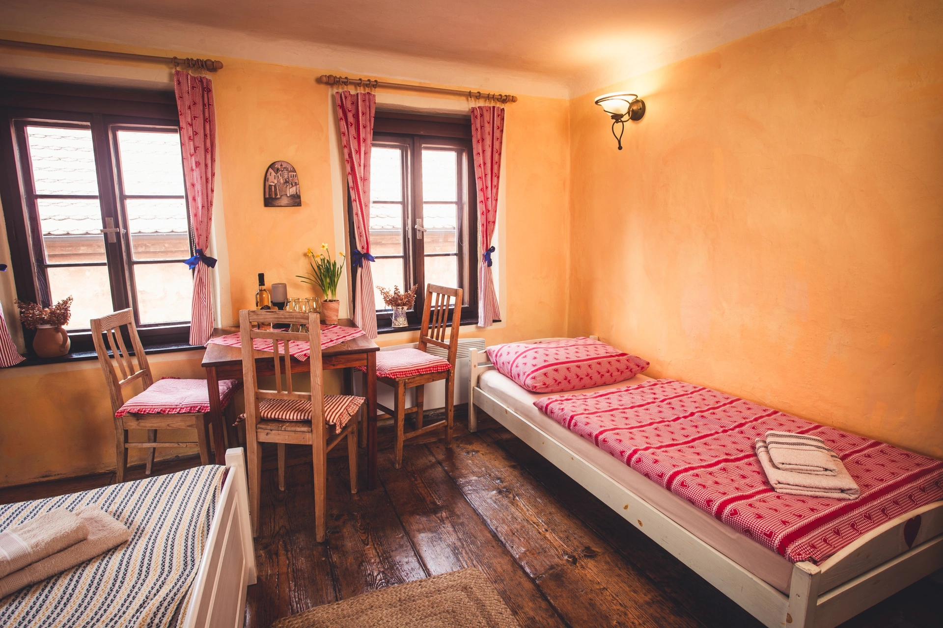- Pokoj Pekař: čtyřlůžkový pokoj s manželskou postelí a dvěma jednolůžkovými postelemi