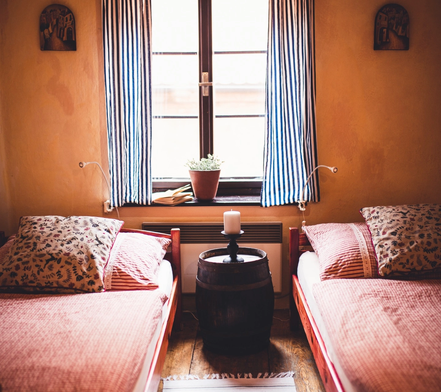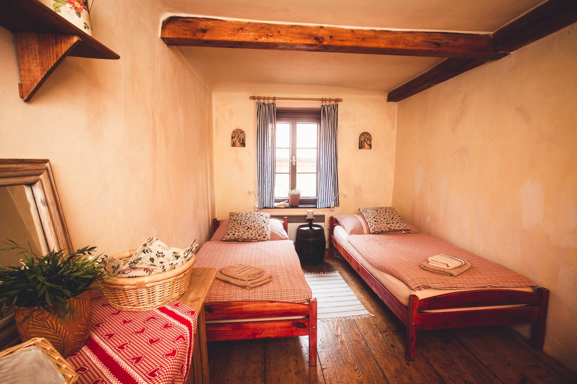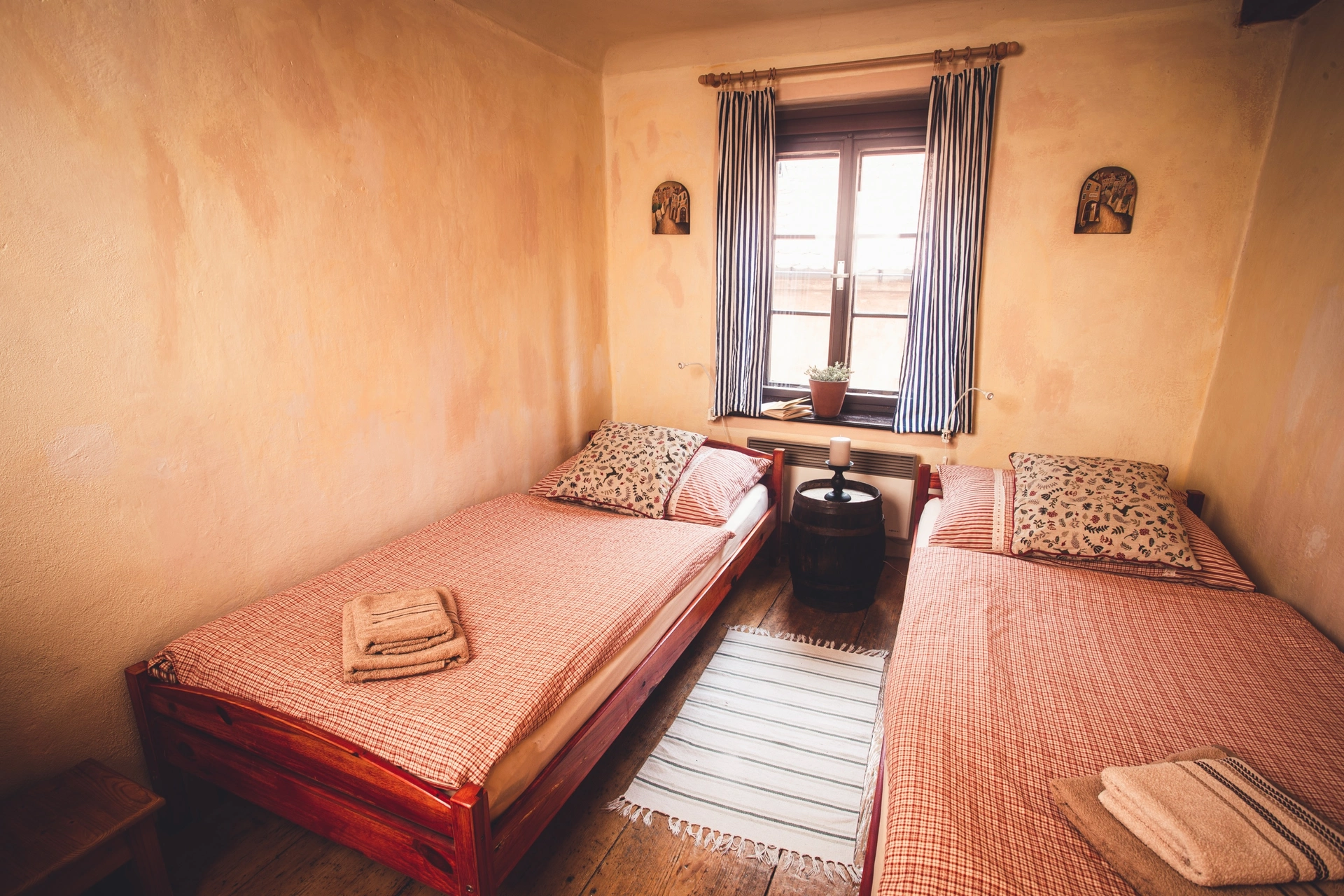 - Pokoj Zámečník: dvoulůžkový pokoj se dvěma jednolůžkovými postelemi