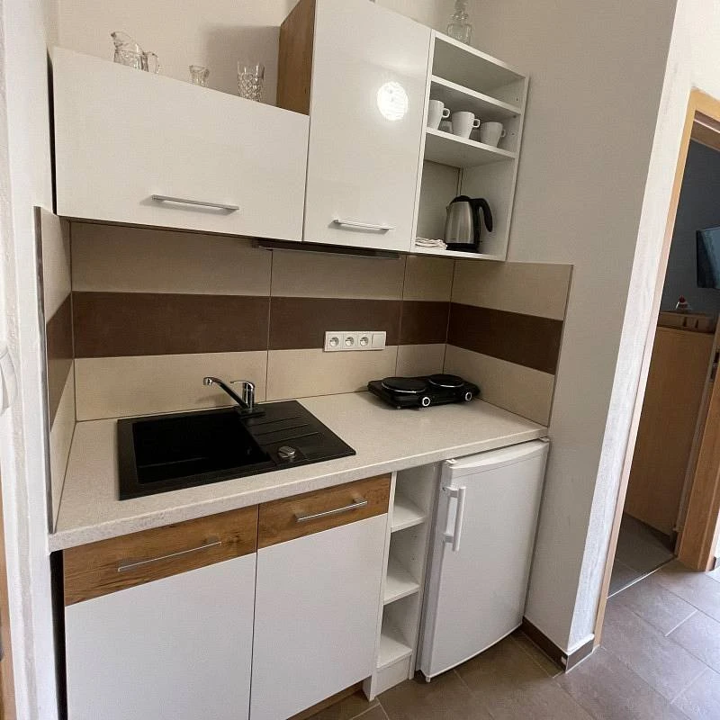 V některých apartmánech je vybavený kuchyňský kout nebo samostatná kuchyně. Hosté v pokojích bez kuchyňského koutu mohou využít společnou kuchyňku na patře.