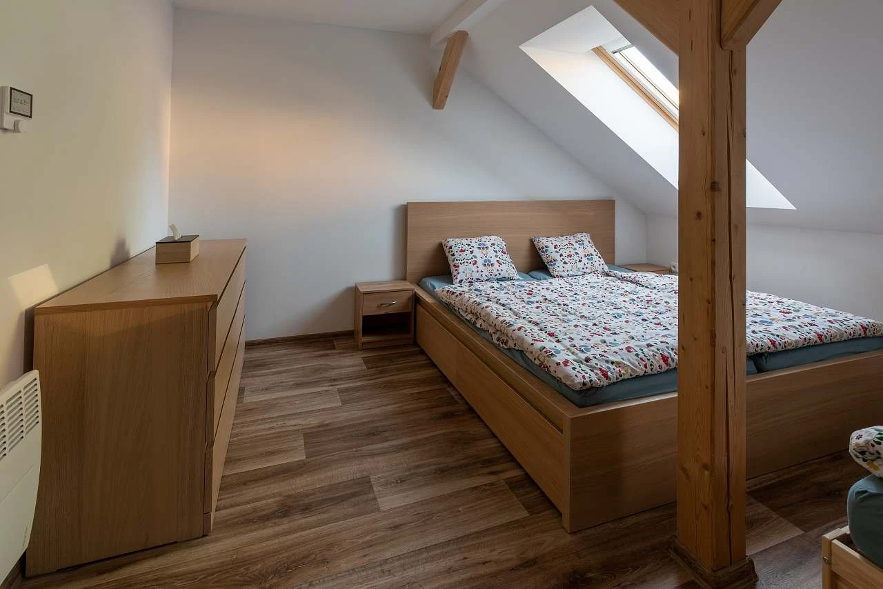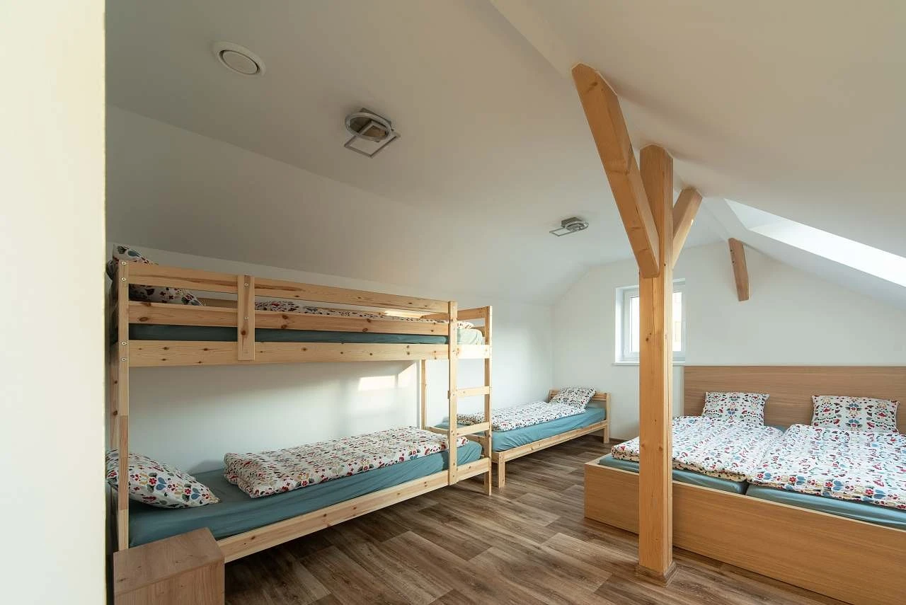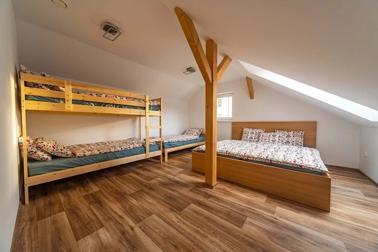 K dispozici jsou dva podkrovní pokoje – jeden s 5 lůžky, druhý s 4 lůžky. V přízemí je rozkládací pohovka. Objekt má samostatné WC v přízemí i v horním patře.