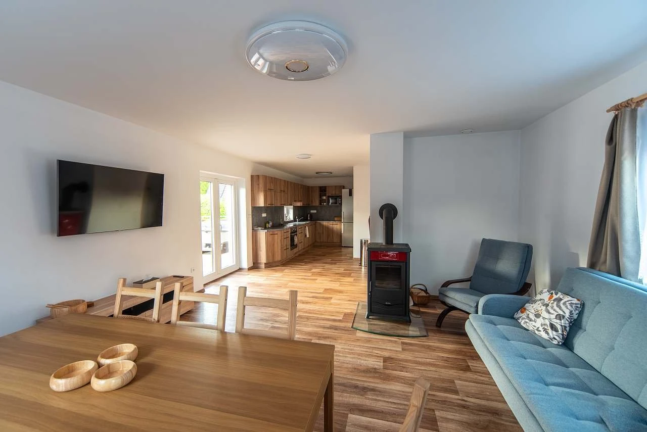 - Obývací pokoj: sedací souprava, jídelní stůl pro 10 osob, chytrá TV