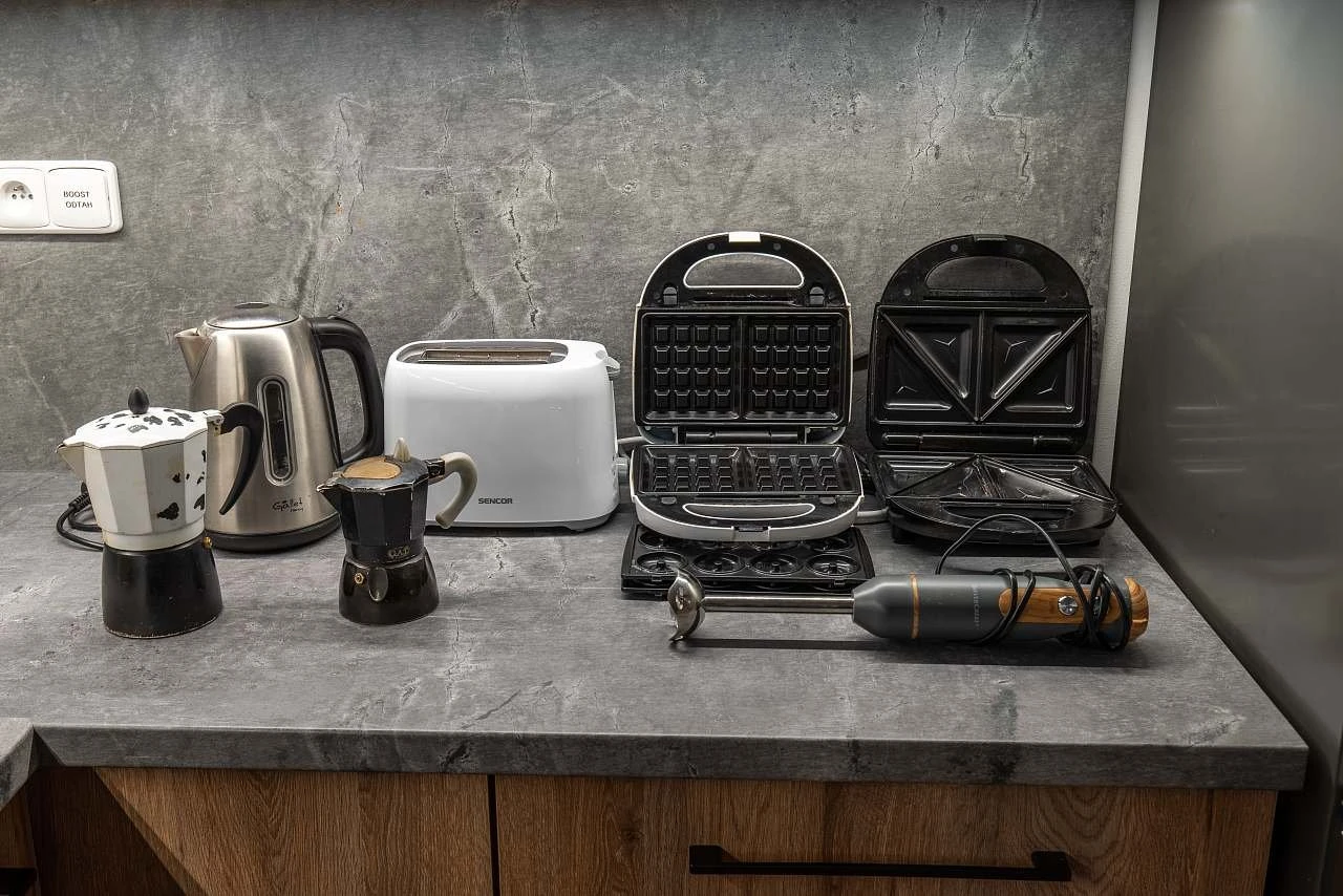 - Kuchyň: myčka nádobí, trouba, varná deska, mikrovlnná trouba, lednice s mrazákem, toustovač, topinkovač, tyčový mixér, šlehač, vaflovač