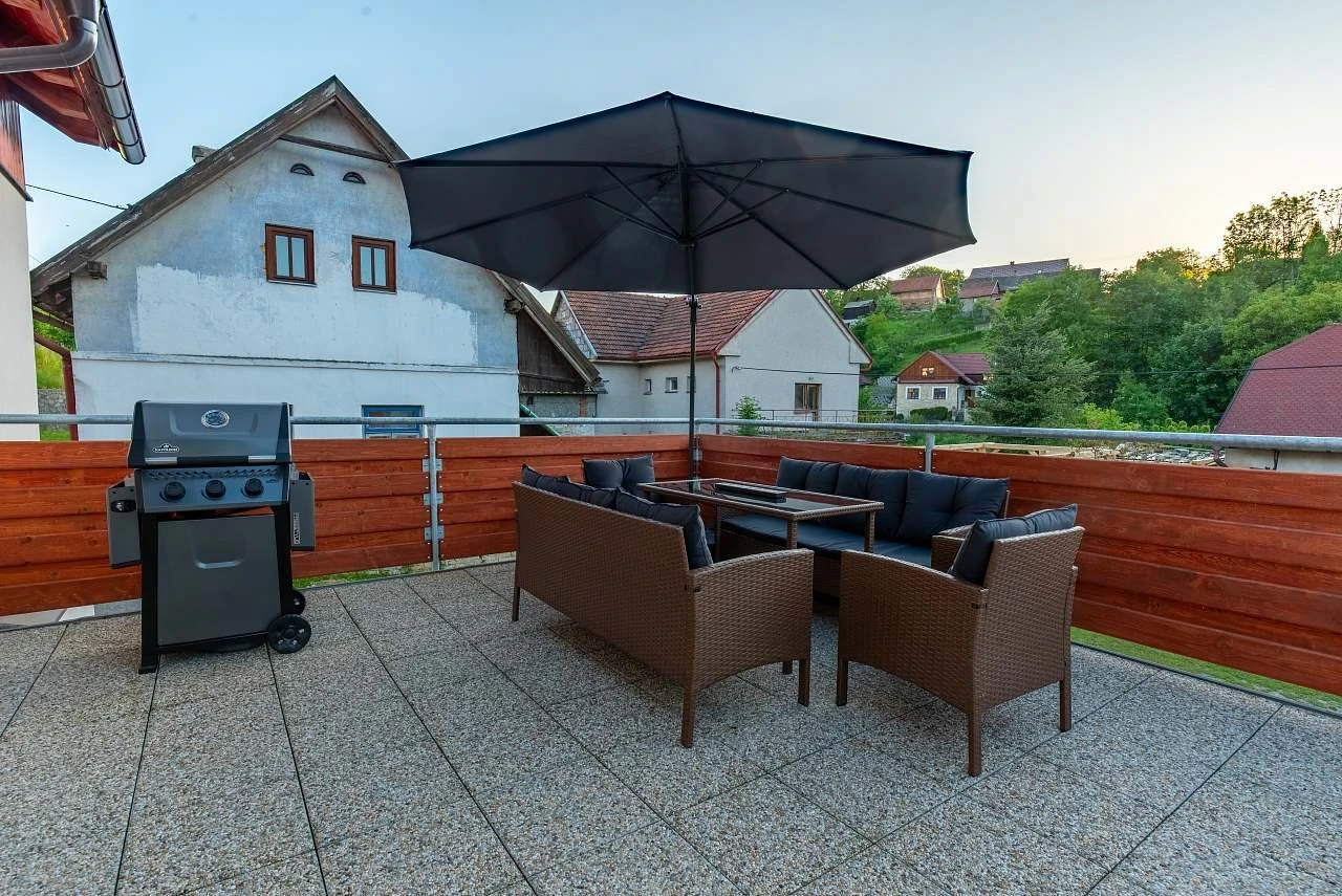 Chalupa nabízí plně vybavenou kuchyň v přízemí, propojenou s obývacím pokojem, krbovými kamny, jídelním stolem pro 10 osob a sedací soupravou. V přízemí se nachází koupelna se sprchovým koutem a finskou saunou. Na terase je vířivka, slunečník, plynový gril značky Napoleon s příslušenstvím a sedací souprava pro 10 osob. V garáži pod terasou je parkování pro jedno auto a zamykatelná místnost pro kola, lyže a další vybavení.