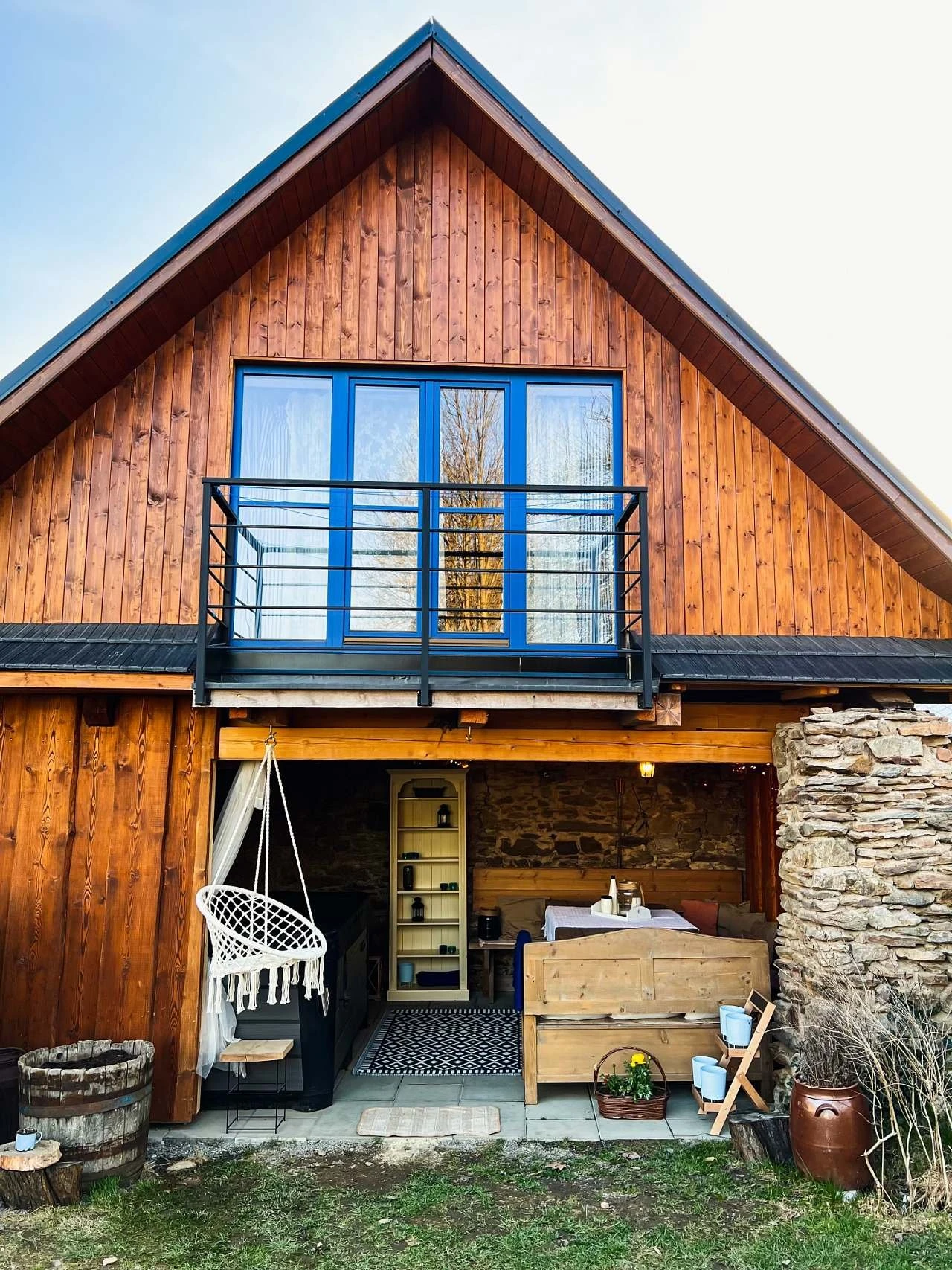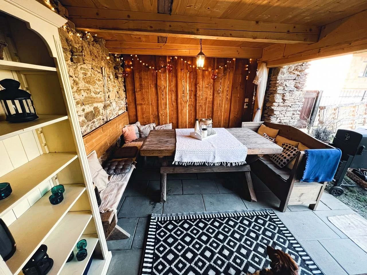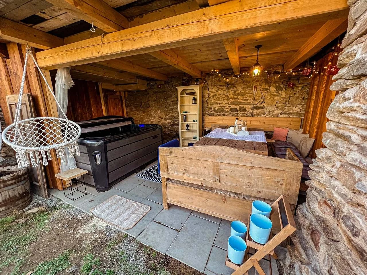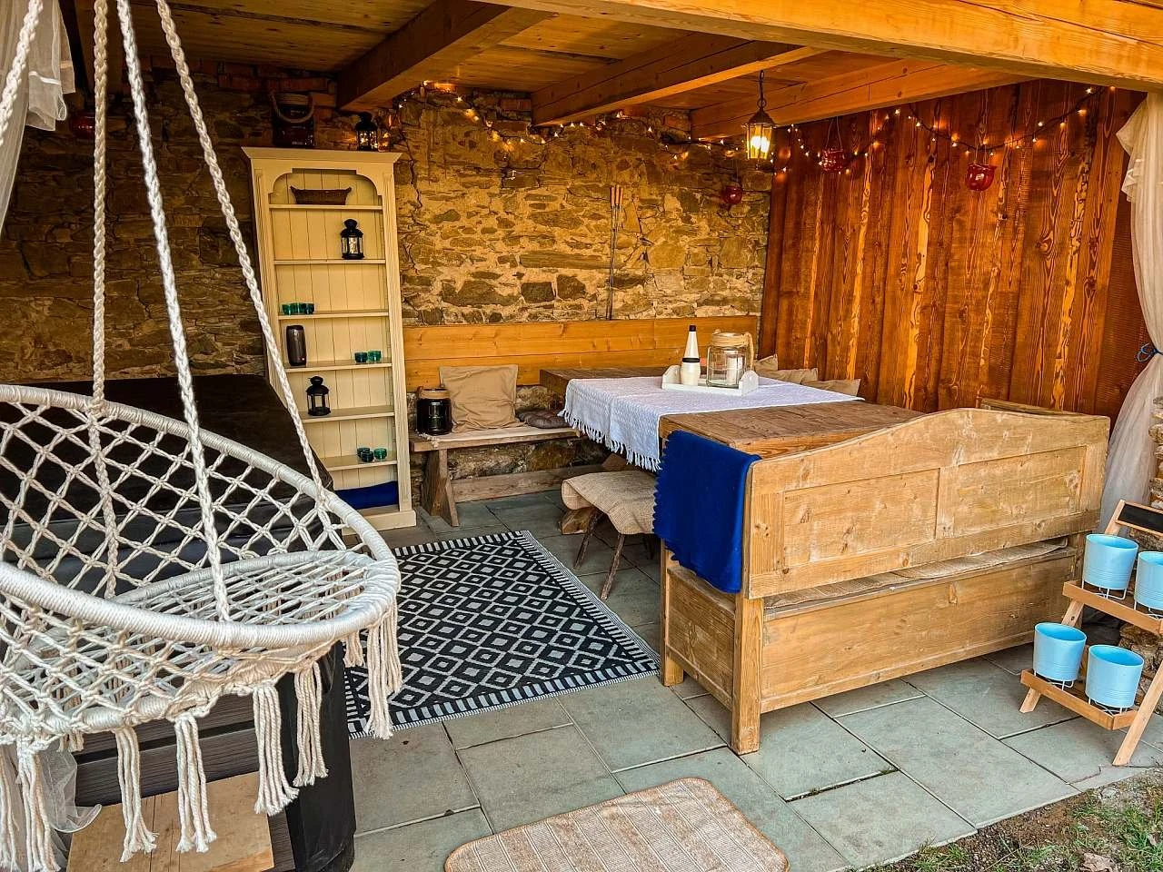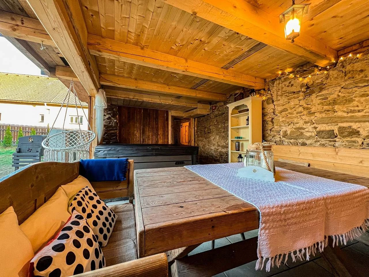 Venkovní vybavení: terasa, vířivka, zahradní nábytek, ohniště, gril.