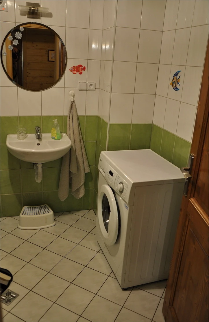 K dispozici jsou dvě koupelny – jedna se sprchovým koutem, pračkou a toaletou, druhá s vanou, plus samostatná toaleta na konci chodby. V přízemí se nachází technická místnost s bojlerem.