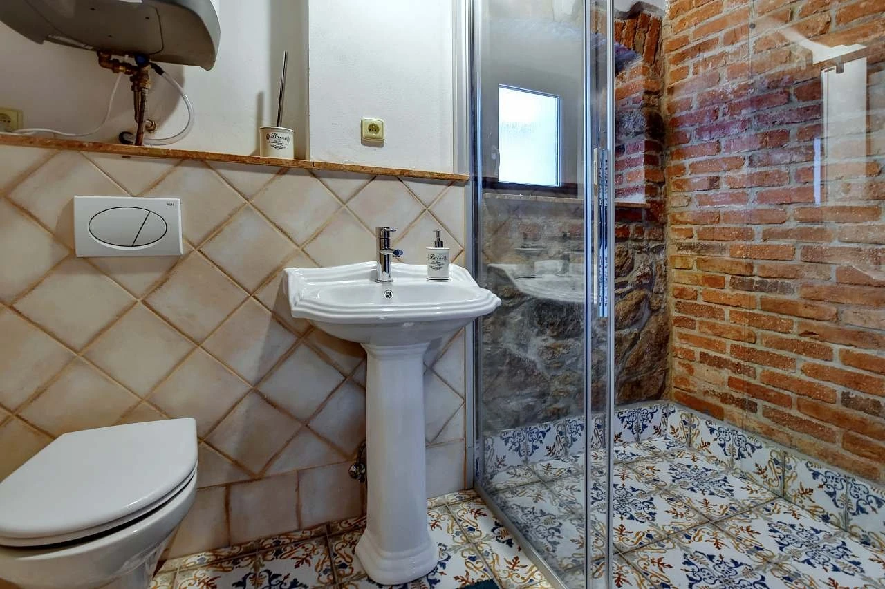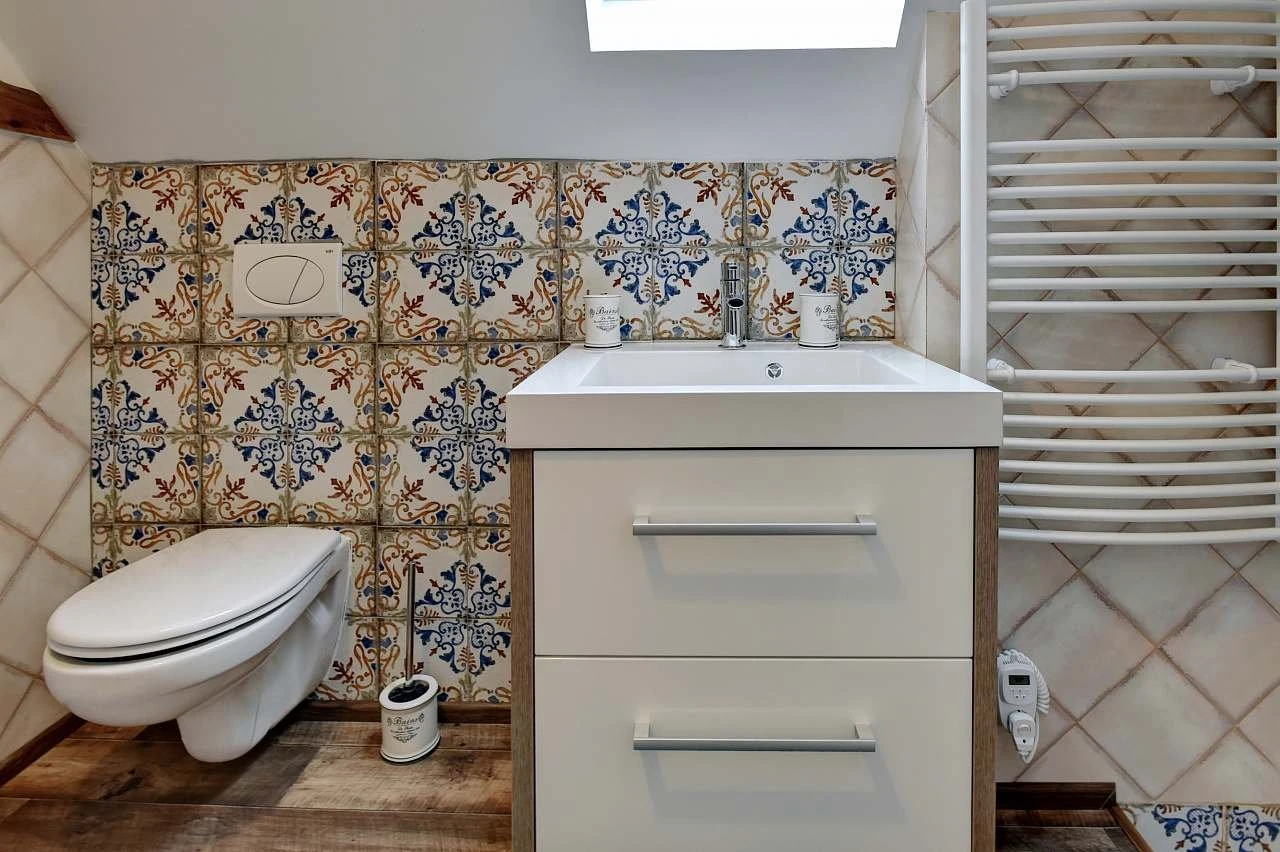 V objektu jsou 2 koupelny se sprchovým koutem a WC, každá na jednom patře. Vytápění je zajištěno kombinací dřevěných kamen ve společenských místnostech a elektrického vytápění (podlahové topení a panely v ložnicích).