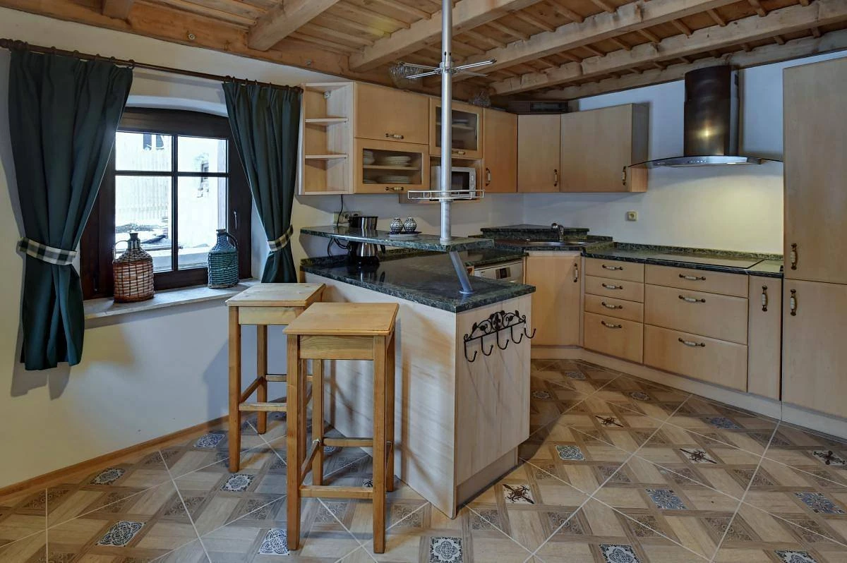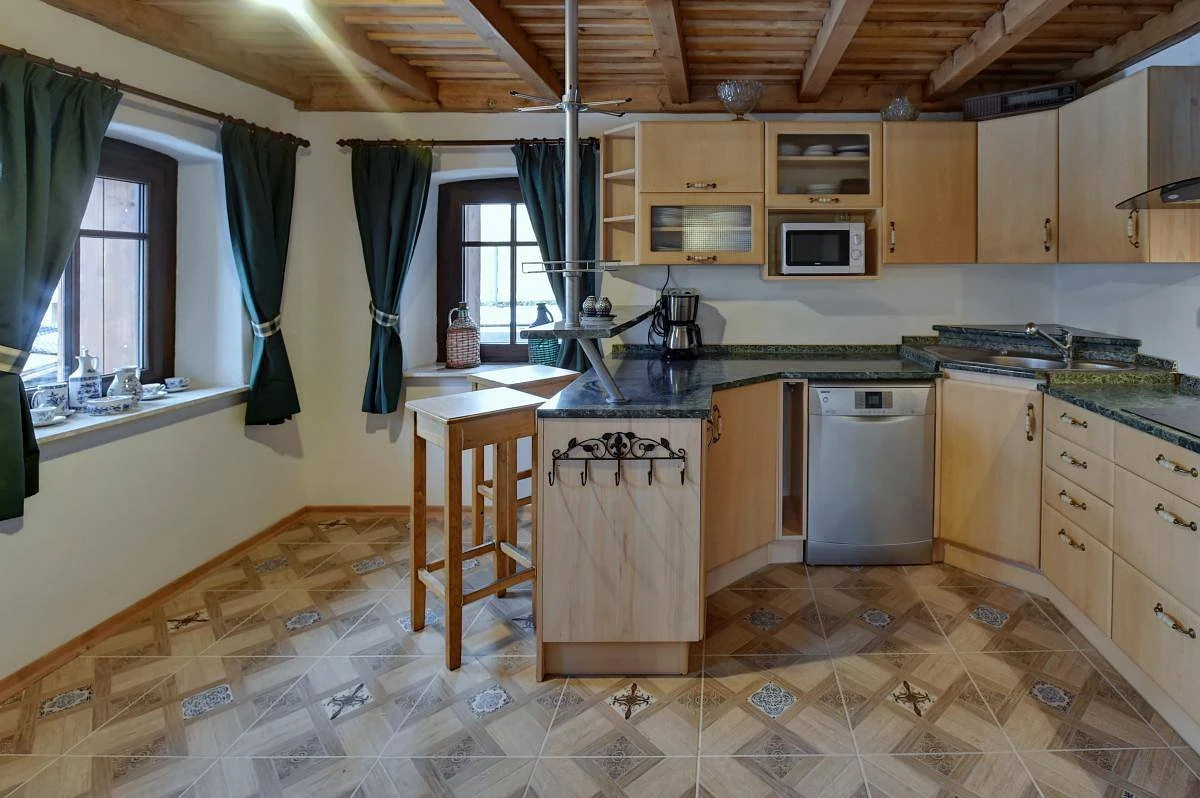 Kuchyň je plně vybavená: myčka na nádobí, lednice, mikrovlnná trouba, rychlovarná konvice, kávovar, sklokeramická deska a kompletní nádobí.