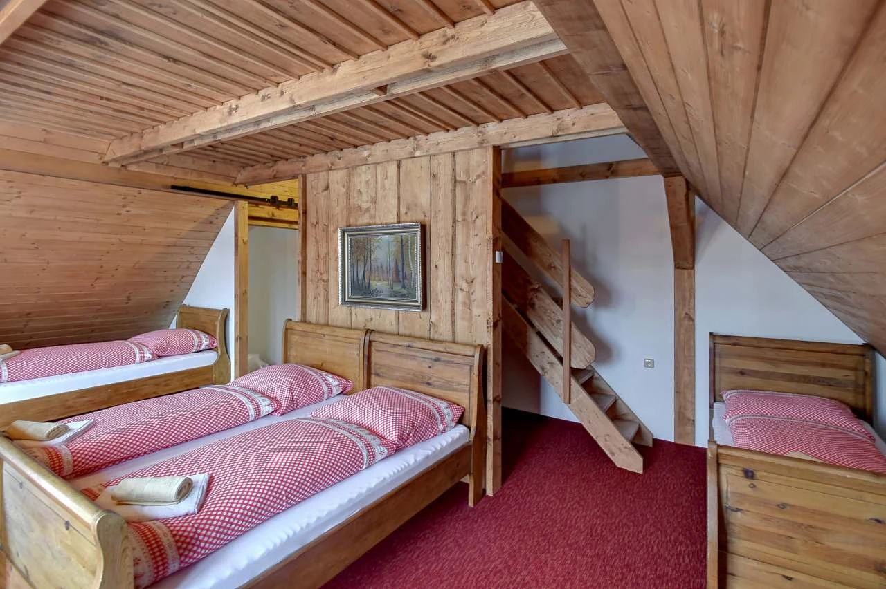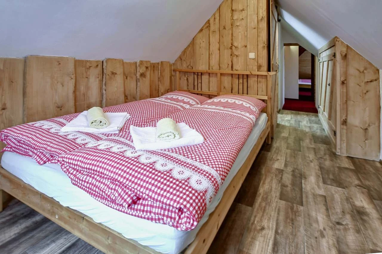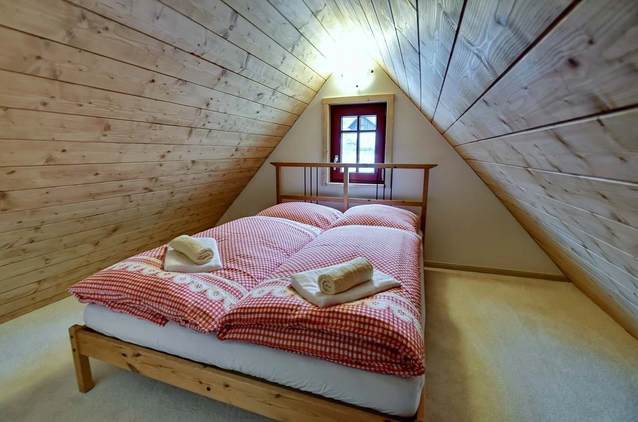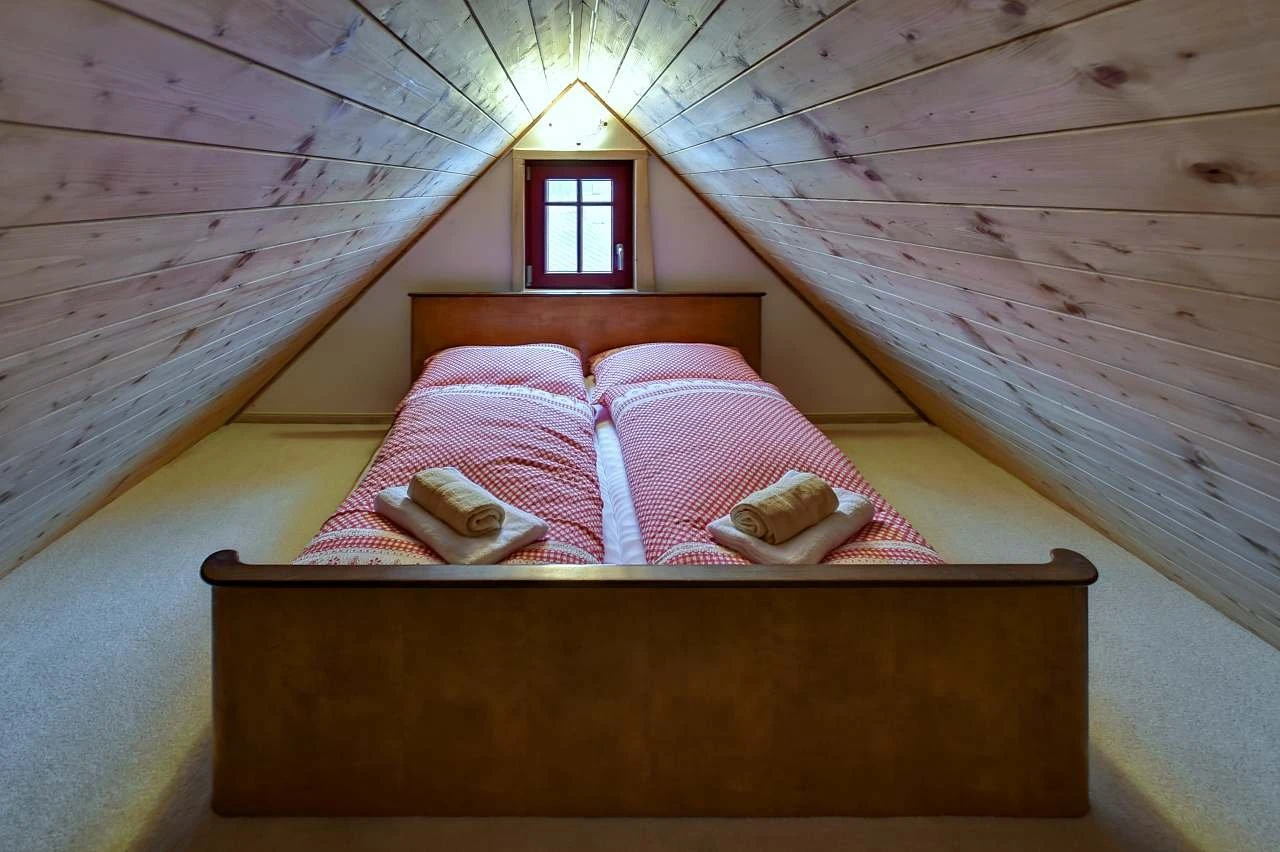 Chalupa nabízí ubytování ve 3 uzavřených ložnicích v 1. patře. Dispozičně je jeden pokoj se 4 lůžky a podkrovním spaním pro 2 osoby, druhý pokoj má 4 lůžka a podkroví s 2 lůžky, a třetí pokoj je vybaven manželskou postelí. Povlečení, osušky a ručníky jsou zahrnuty v ceně.