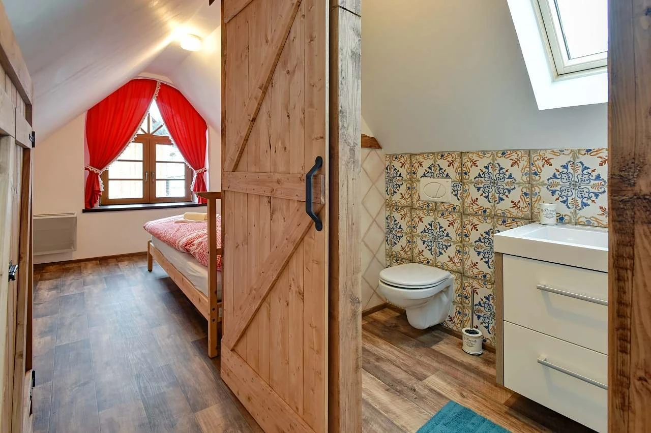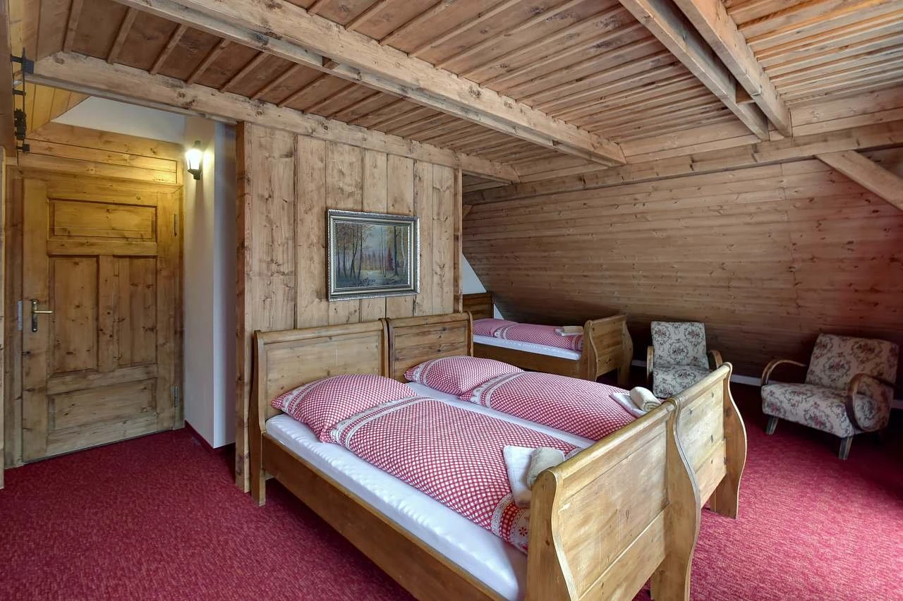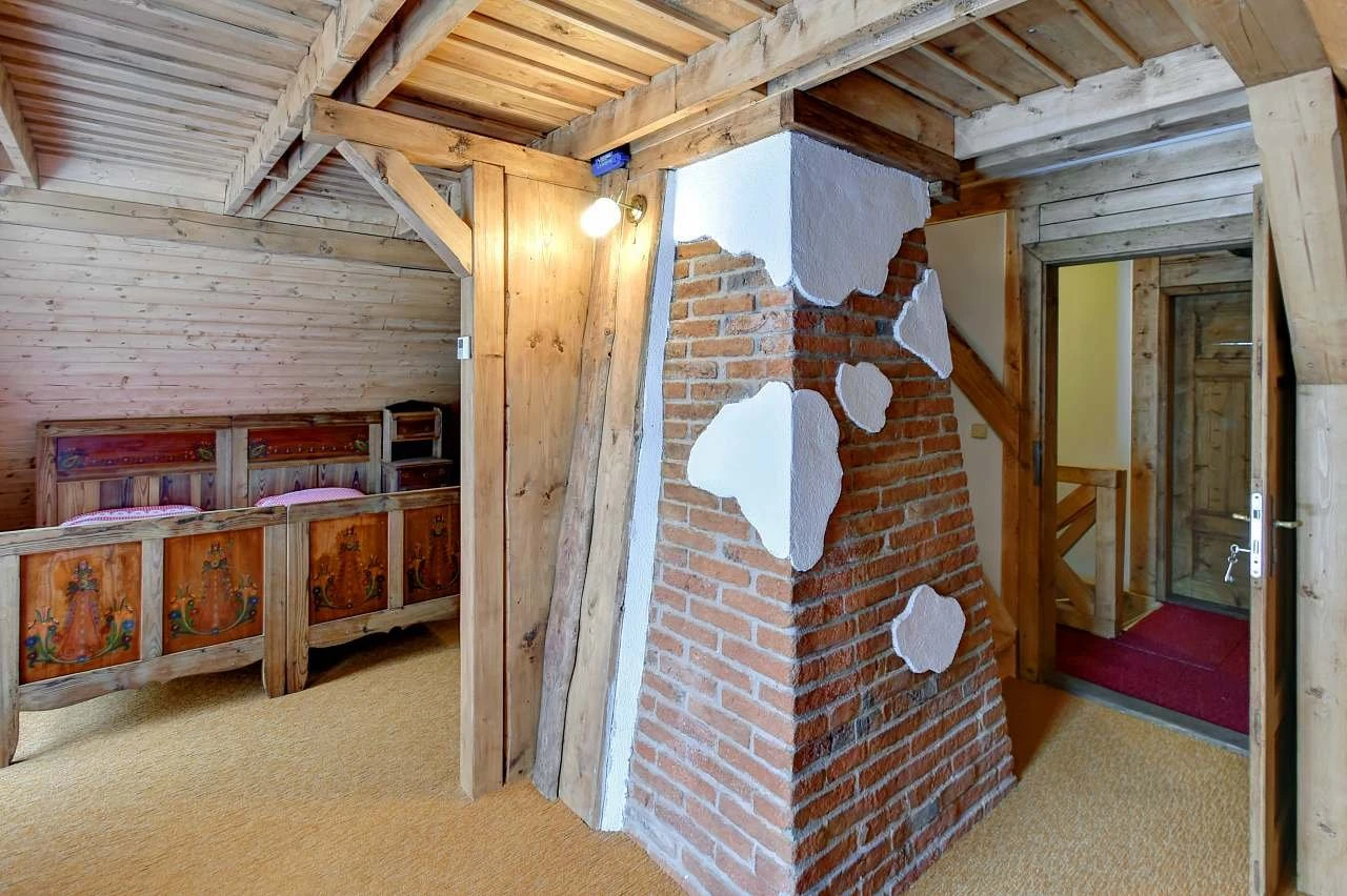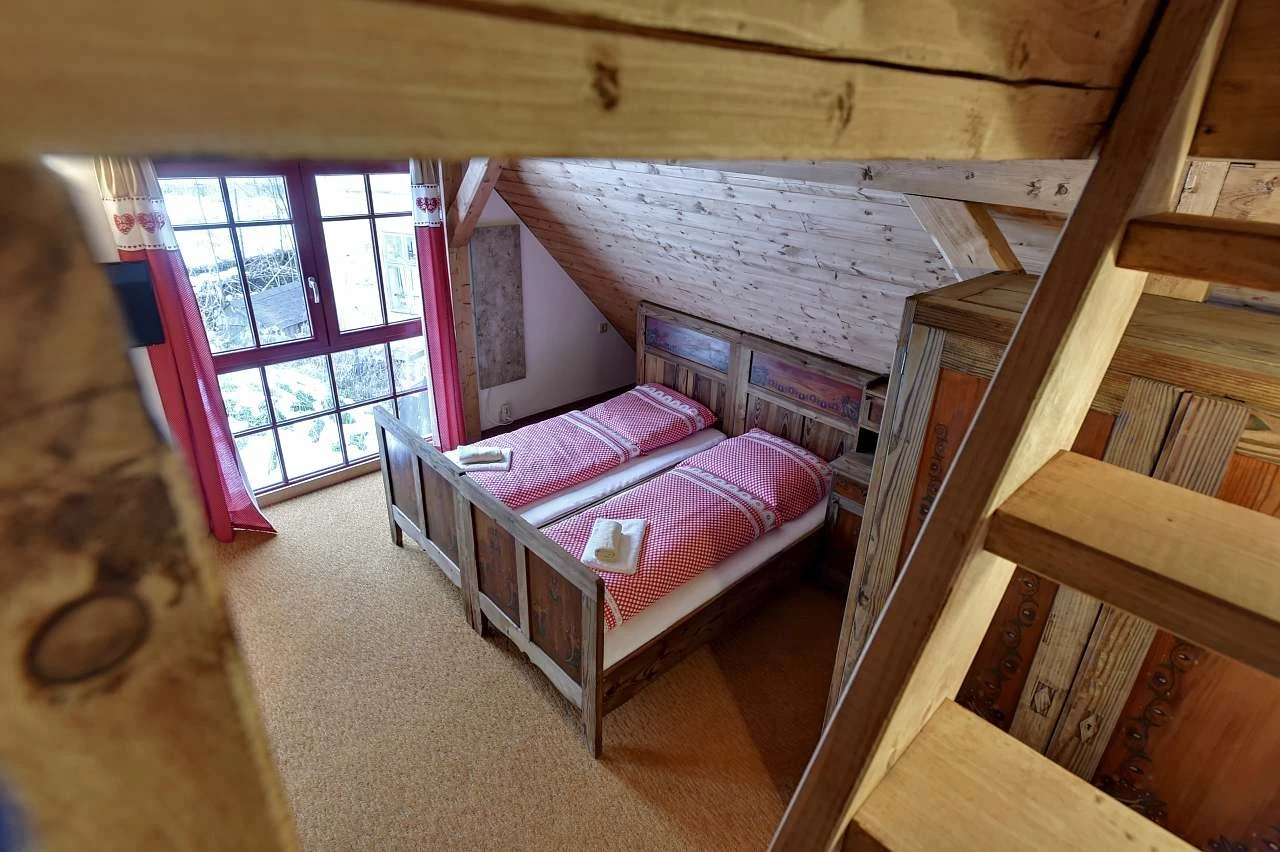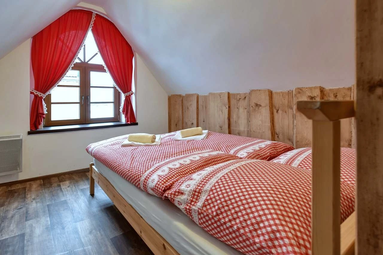 Chalupa nabízí ubytování ve 3 uzavřených ložnicích v 1. patře. Dispozičně je jeden pokoj se 4 lůžky a podkrovním spaním pro 2 osoby, druhý pokoj má 4 lůžka a podkroví s 2 lůžky, a třetí pokoj je vybaven manželskou postelí. Povlečení, osušky a ručníky jsou zahrnuty v ceně.
