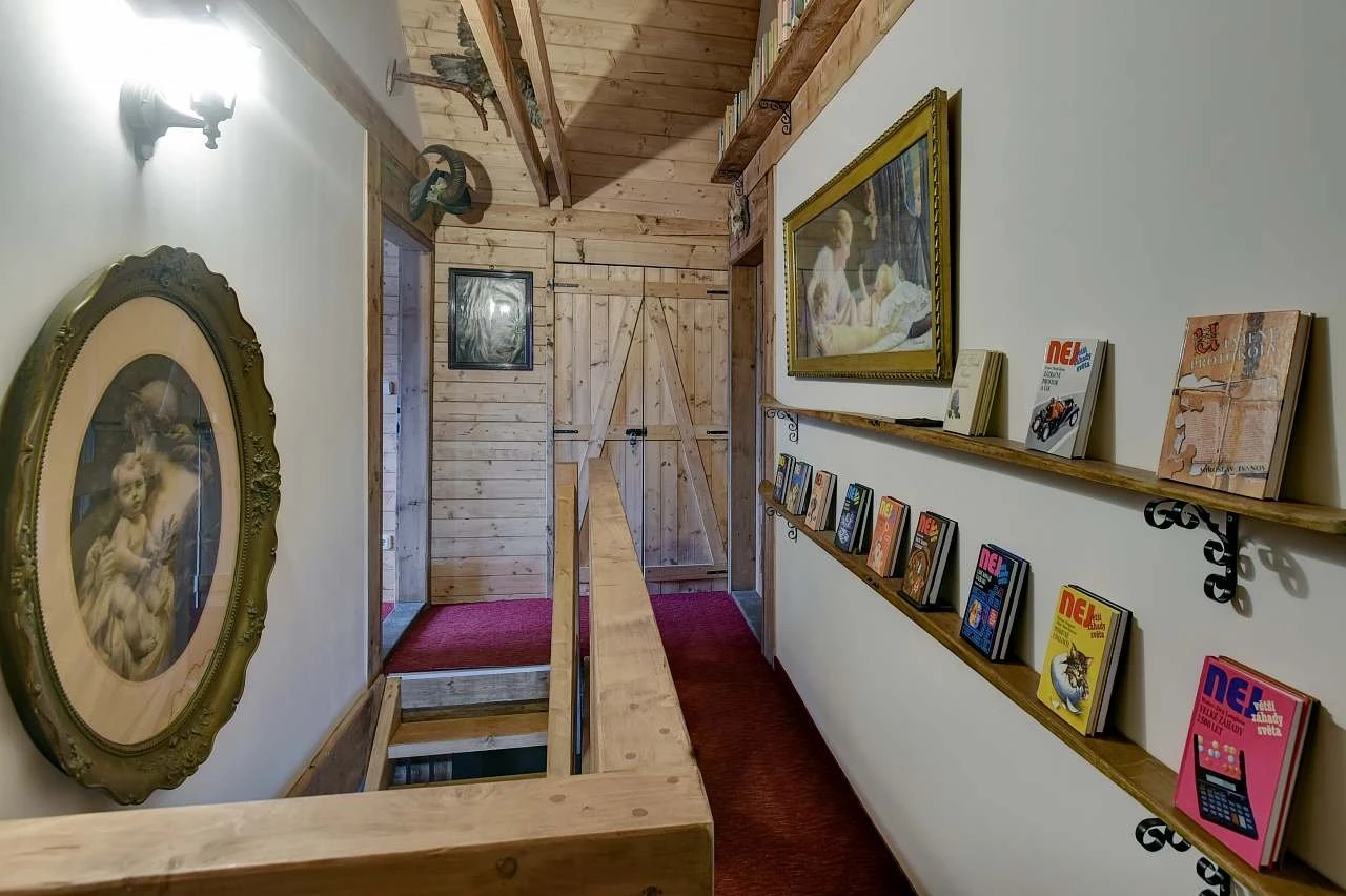 Společenské prostory zahrnují hlavní místnost s posezením u velkého stolu pro 9 osob a vedlejší jídelnu se stolem pro 4 osoby a rozkládací pohovkou pro jednu osobu s dítětem. V obou ložnicích je televize. Součástí chalupy je Finská sauna.