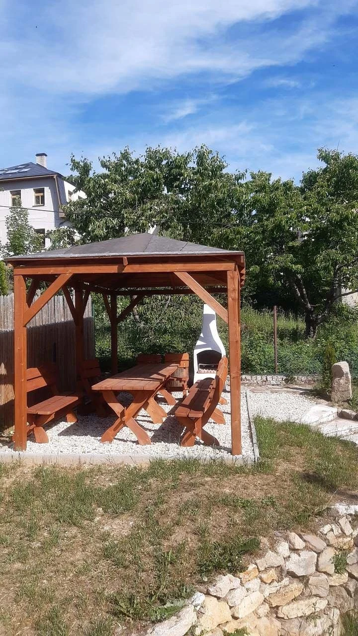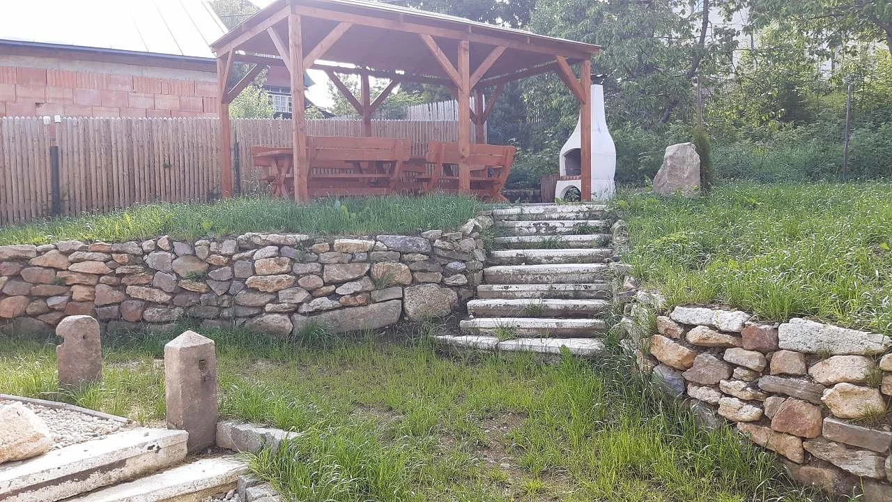 Venkovní vybavení zahrnuje koupací káď (nutná rezervace), venkovní krb, zahradní nábytek, gril, houpačku, trampolínu a prolézačky.