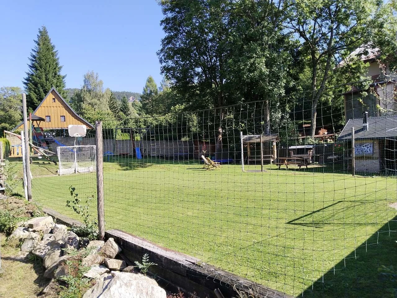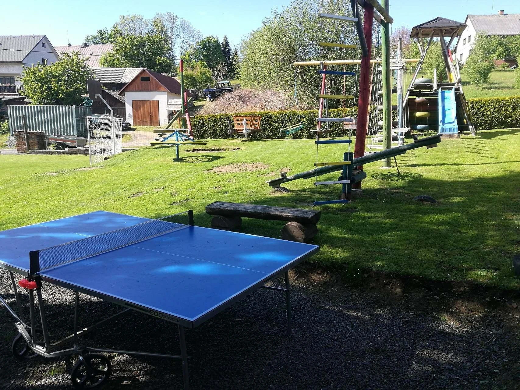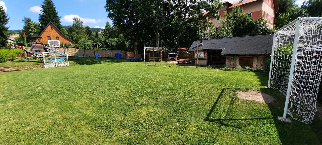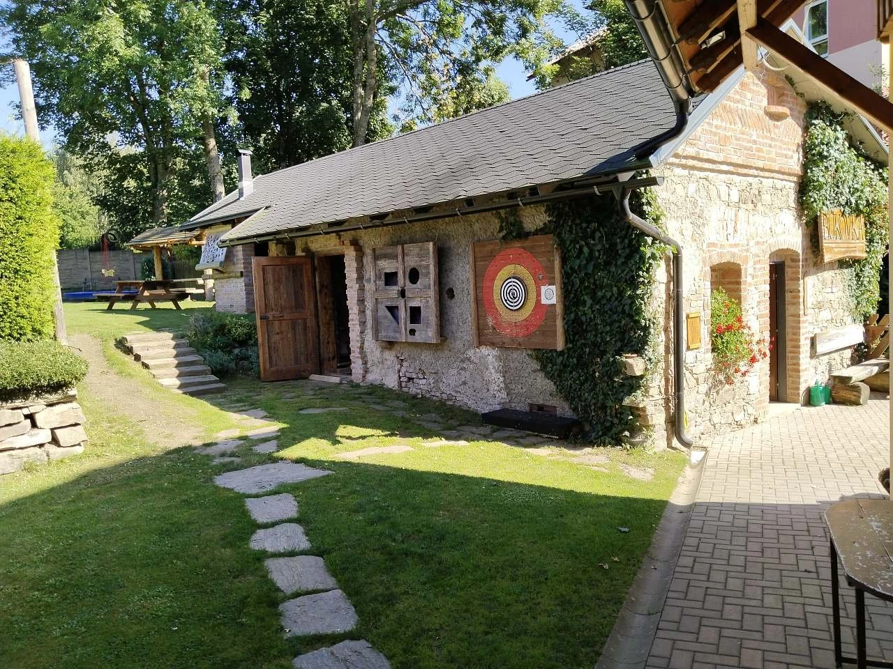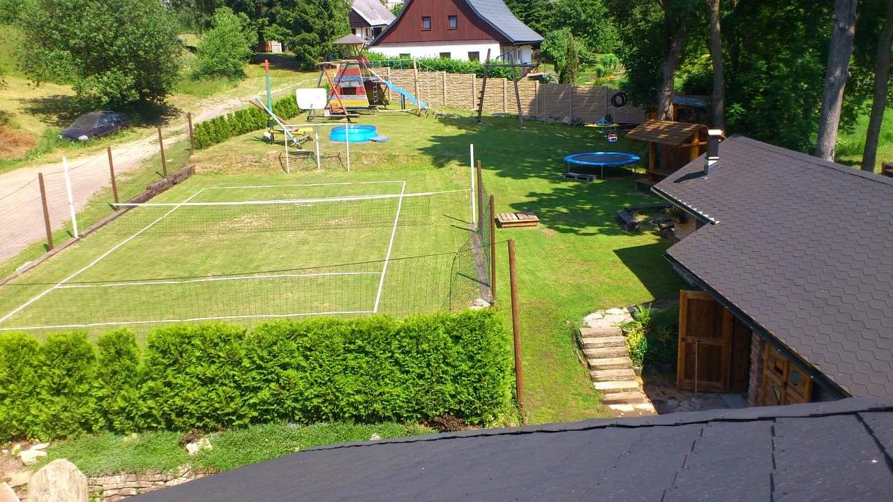 Součástí areálu je víceúčelové hřiště na volejbal/nohejbal, stolní tenis, petanque, ruské kuželky, velký terč na šípky a zastřešená pergola s topeništěm. Pergola je vybavena kuchyňskou linkou s pitnou vodou a malou lednicí, venkovní ohništěm a zděným grilem s roštem a jehlou s motorem na kýtu.
