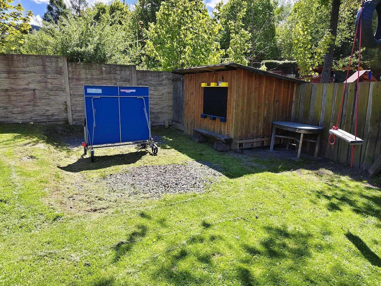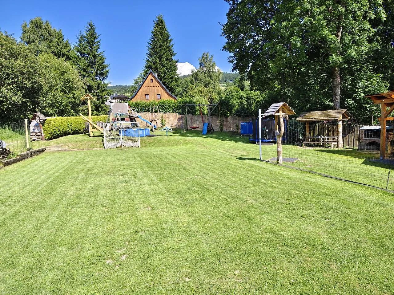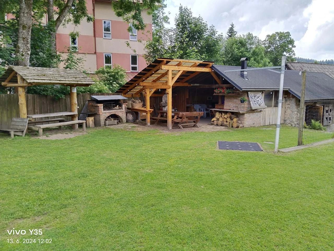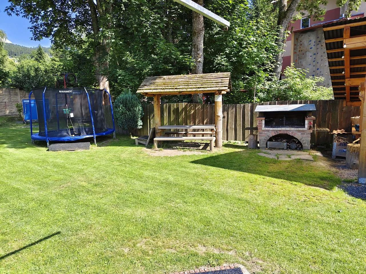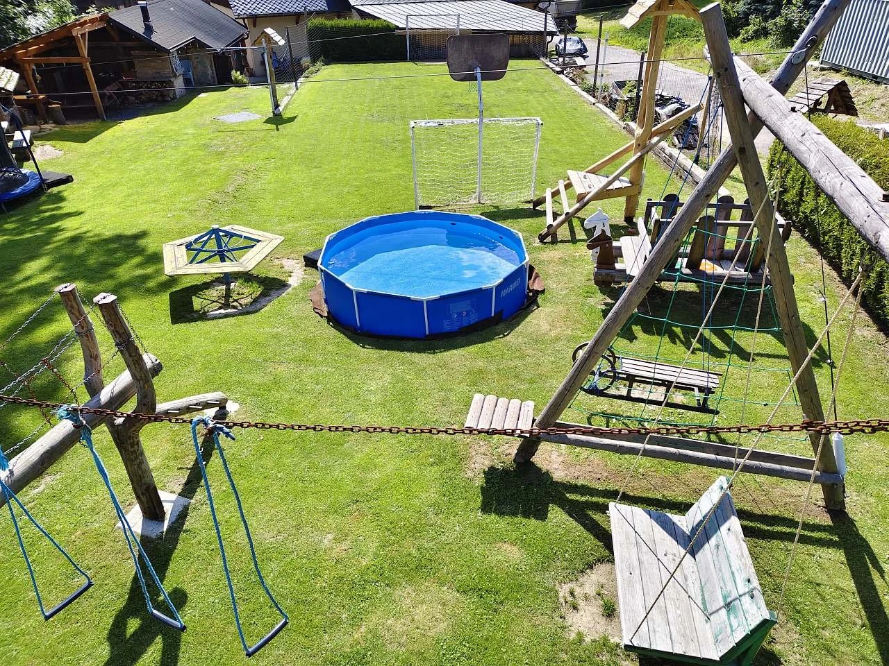 Součástí areálu je víceúčelové hřiště na volejbal/nohejbal, stolní tenis, petanque, ruské kuželky, velký terč na šípky a zastřešená pergola s topeništěm. Pergola je vybavena kuchyňskou linkou s pitnou vodou a malou lednicí, venkovní ohništěm a zděným grilem s roštem a jehlou s motorem na kýtu.