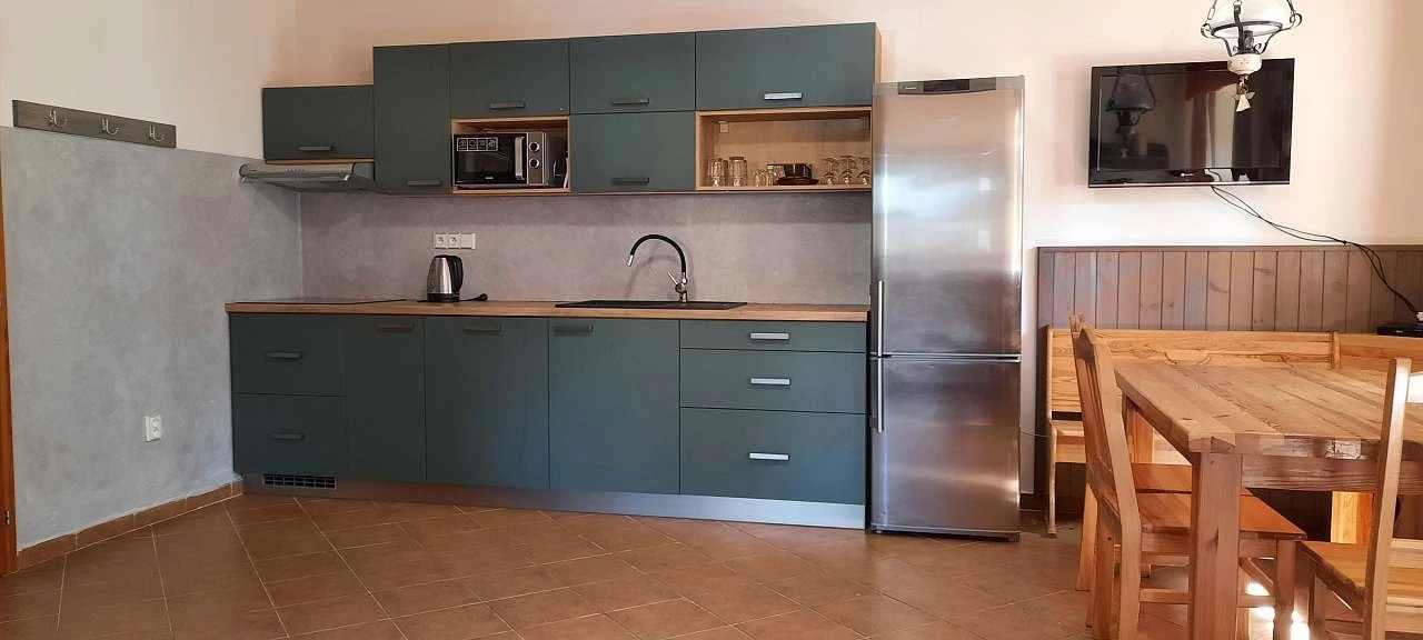 Apartmán se nachází v přízemí, má celkovou rozlohu 57 m² a je určen pro 4 osoby. Disponuje dvěma ložnicemi.Obytná místnost s kuchyňským koutemIndukční varná deskaPečenka / troubaMyčka nádobíVelká ledniceMikrovlnná troubaRychlovarná konviceKompletní nádobí a příboryJídelní koutRozkládací pohovka pro 2 osoby (možnost přistýlky)Krbová kamnaTelevizorWi-Fi připojení k internetuLožniceLožnice 1: manželské dvoulůžko (2 osoby)Ložnice 2: 2 samostatná lůžka (2 osoby)Sociální zařízeníKoupelna se sprchovým koutemSamostatné WCDalší informaceRozloha: 57 m²Počet lůžek: 4Počet ložnic: 2Poschodí: přízemíParkování: anoPůdorys apartmánu: k dispozici