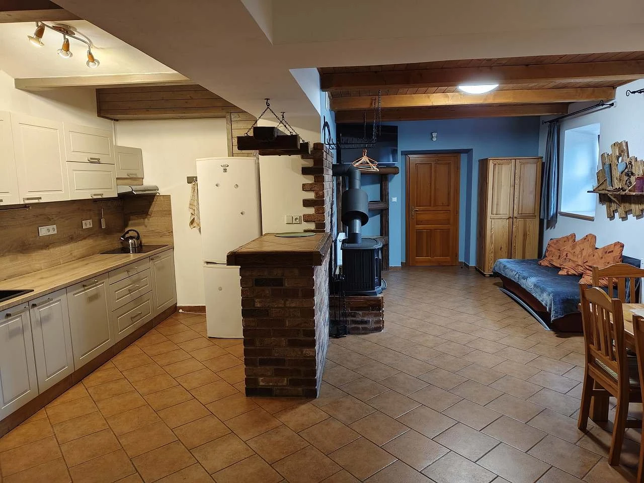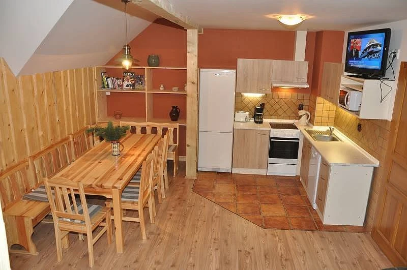 Apartmán se nachází v 1. patře a podkroví, má celkovou rozlohu 91 m² a je určen pro 11 osob. Disponuje třemi ložnicemi.Obytná místnost s kuchyňským koutemSklokeramický sporákMyčka nádobíVelká ledniceMikrovlnná troubaPřekapávač kávyRychlovarná konviceKompletní nádobí a příboryJídelní koutKrbová kamnaTelevizorWi-Fi připojení k internetuLožniceLožnice 1 (1. patro): manželské dvoulůžko + 1 lůžko (3 osoby)Ložnice 2 (podkroví): manželské dvoulůžko + 2 lůžka (4 osoby)Ložnice 3 (podkroví): manželské dvoulůžko + 2 lůžka (4 osoby)Sociální zařízeníKoupelna se sprchovým koutem a WCSamostatné WC na chodběDalší informaceRozloha: 91 m²Počet lůžek: 11Počet ložnic: 3Poschodí: 1. patro + podkrovíParkování: anoPůdorys apartmánu: k dispozici