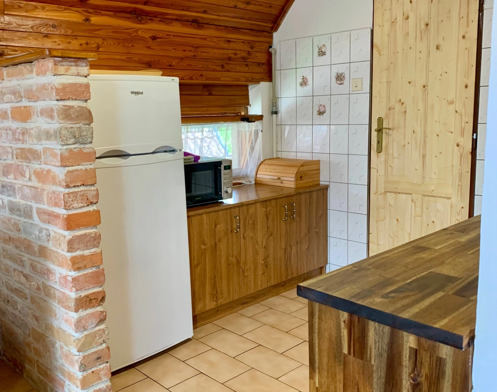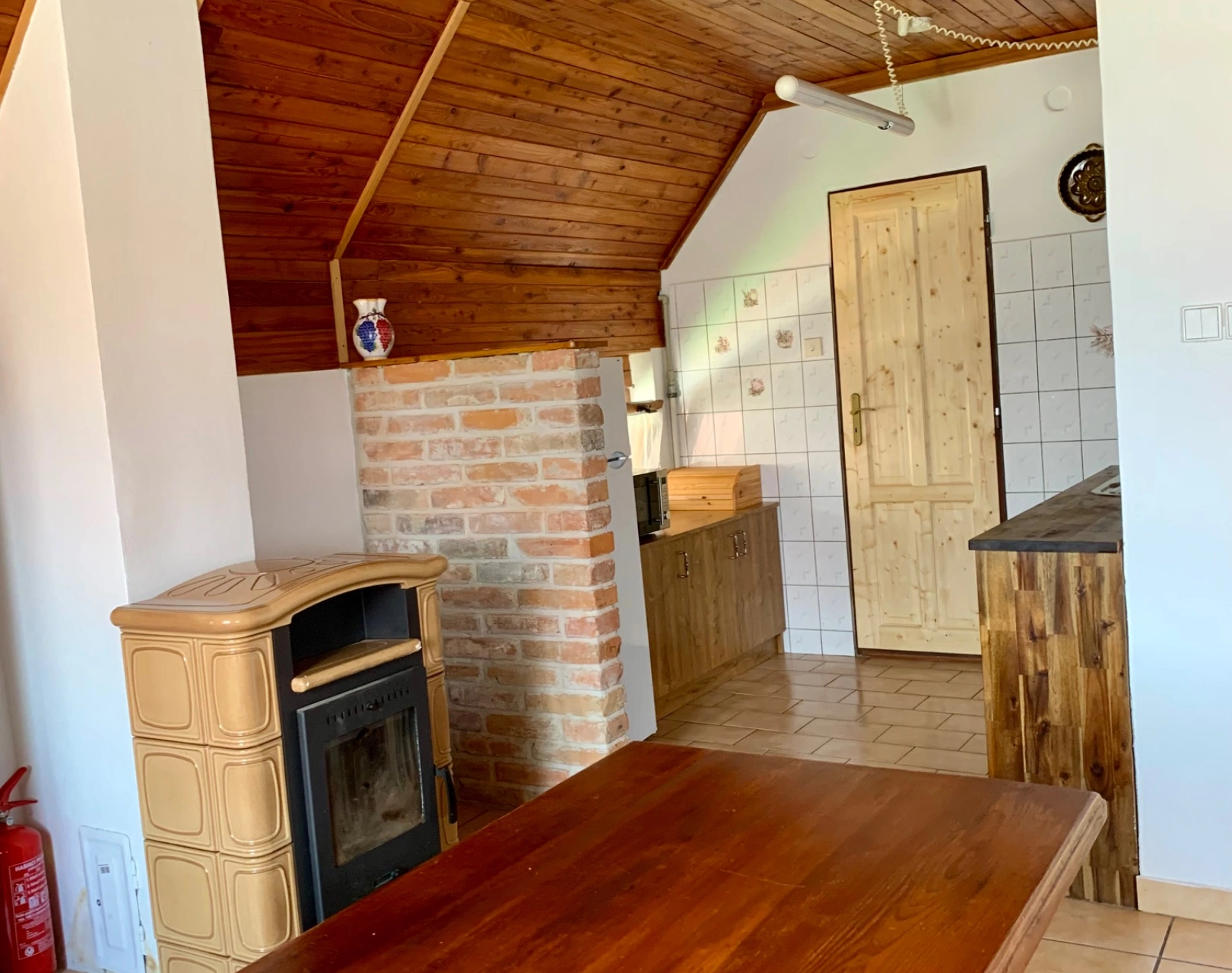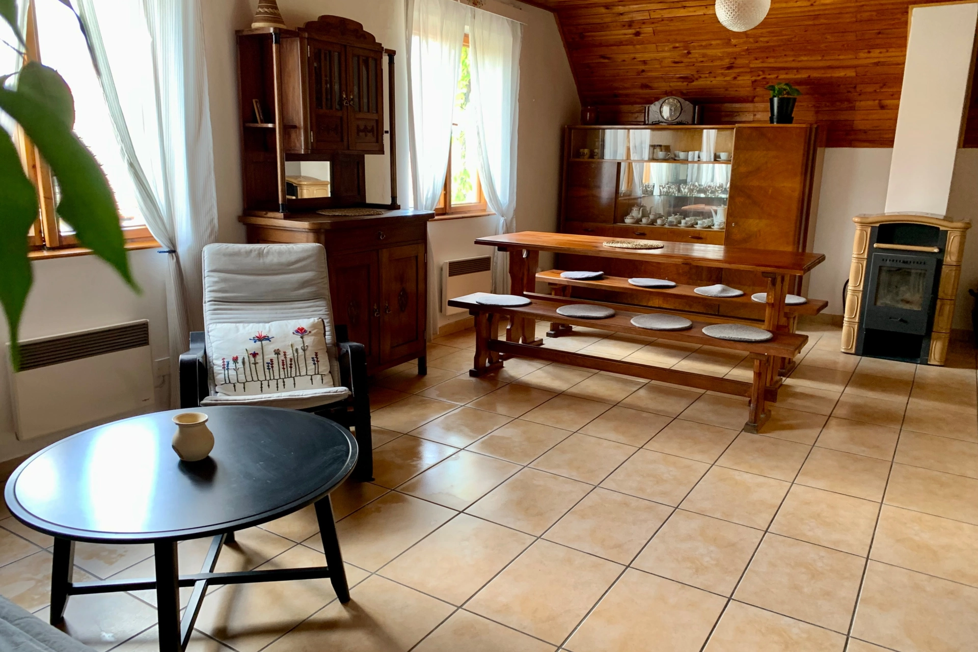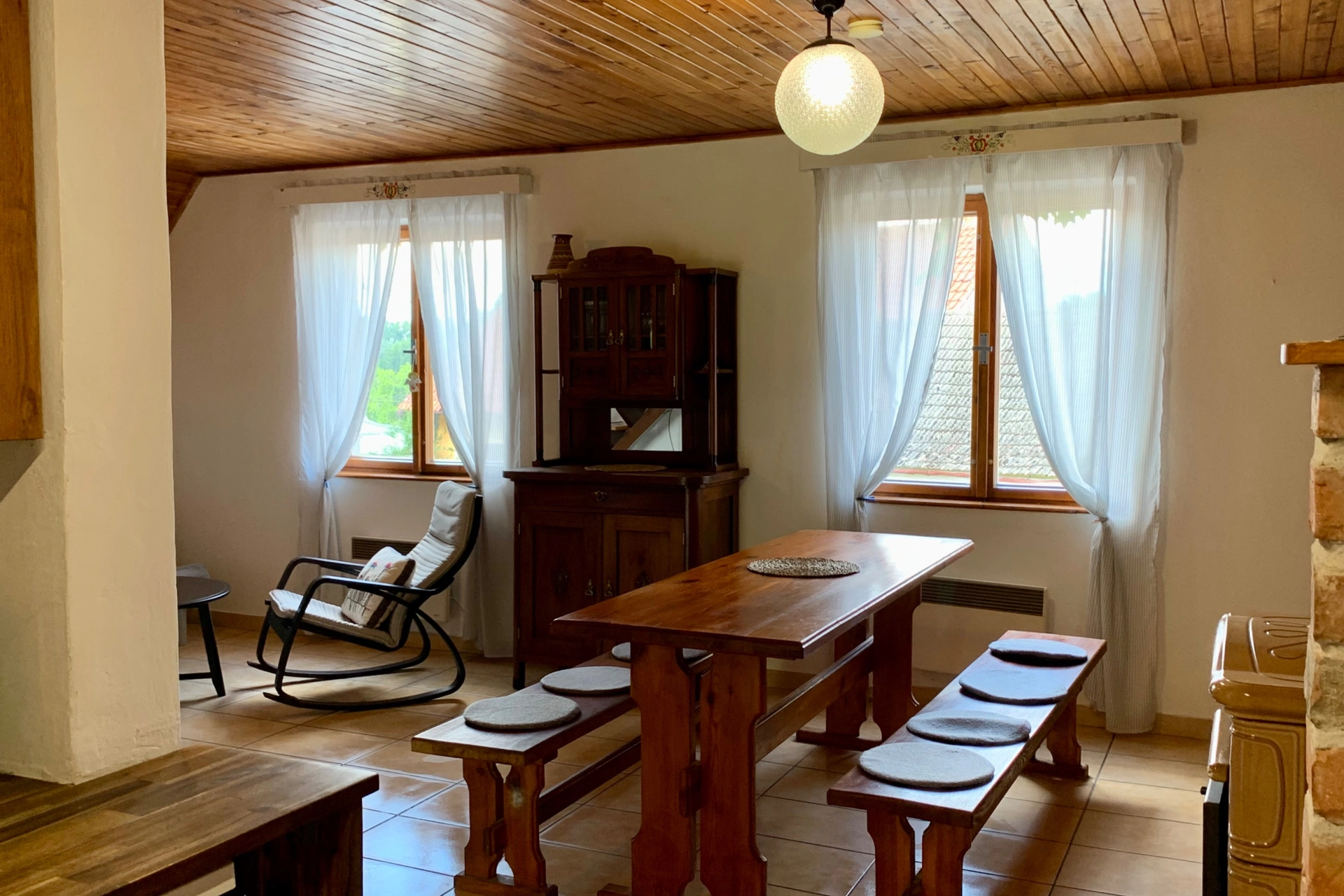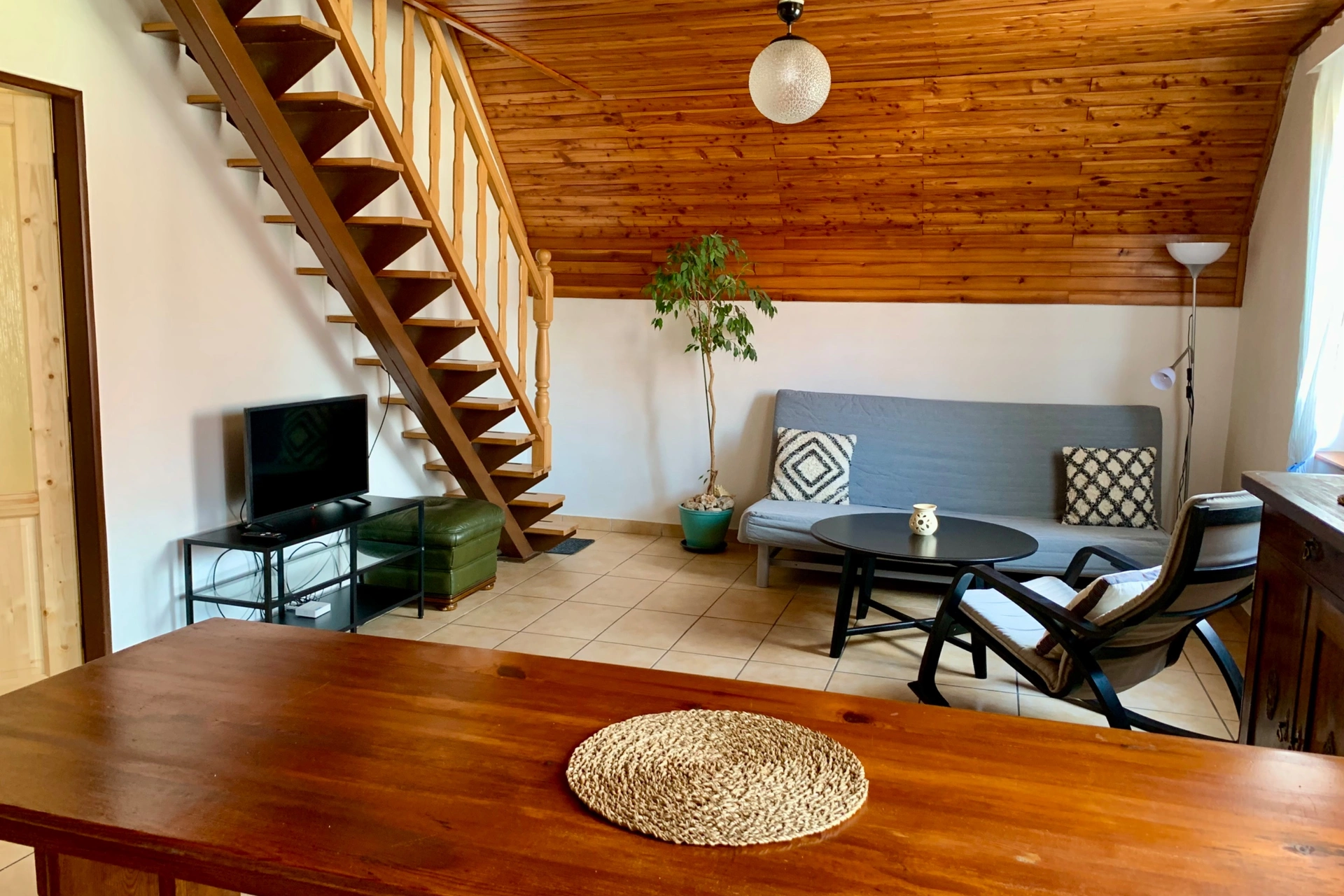 - Obývací prostor (přízemí): krbová kamna, gauč, televize, jídelní sezení