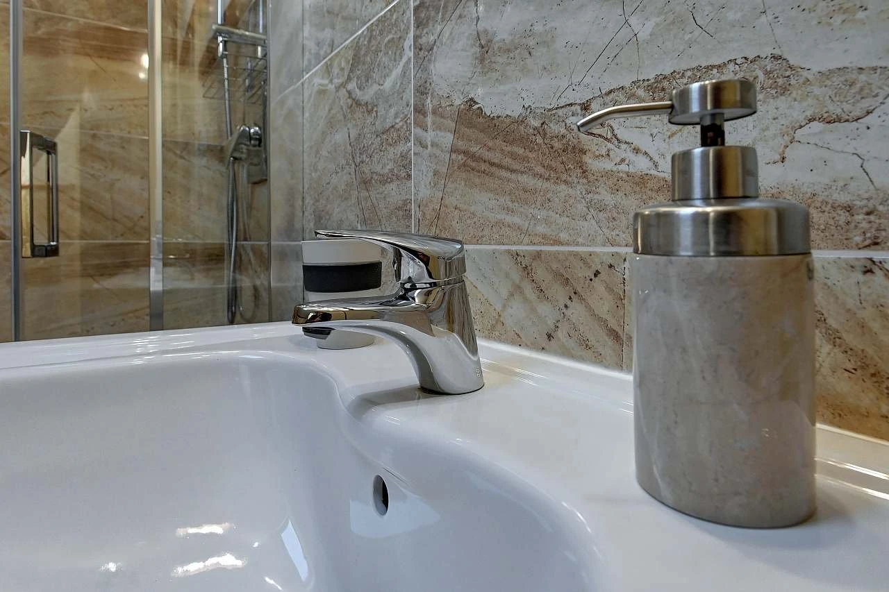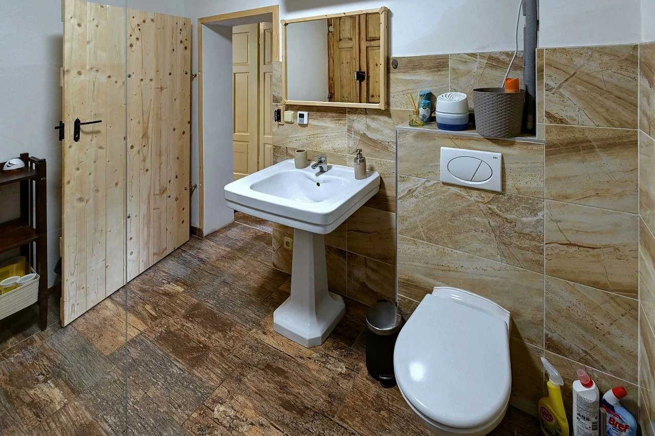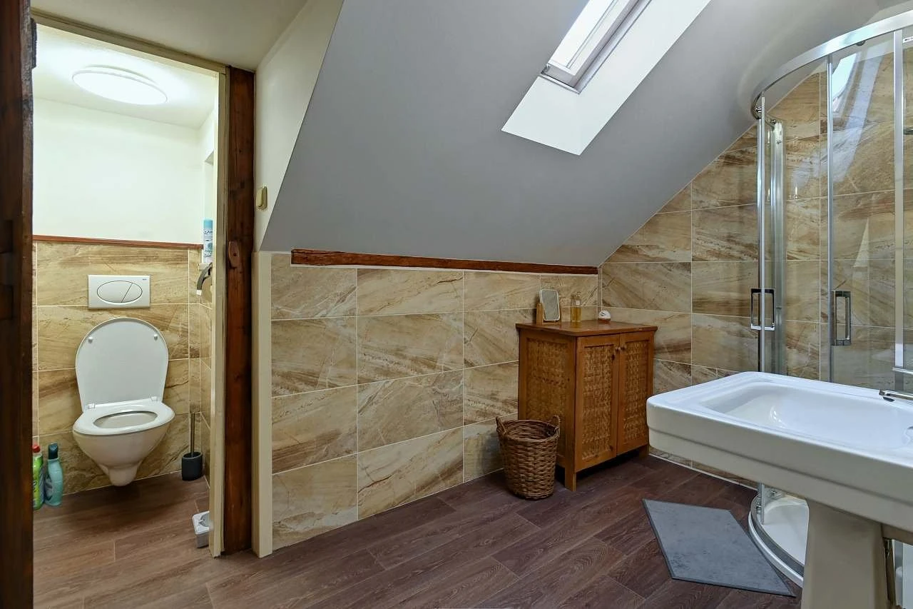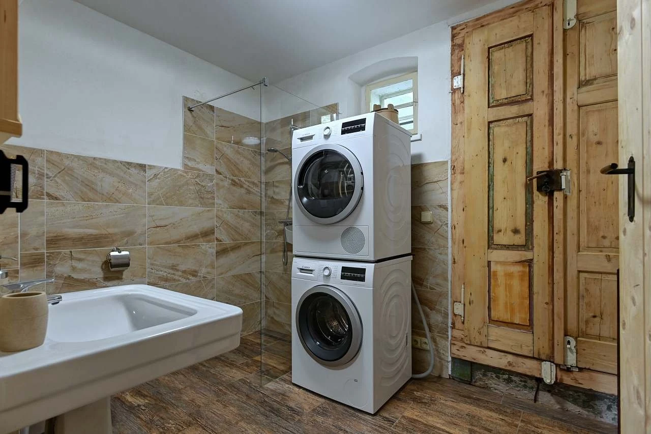 K dispozici jsou dvě koupelny: v přízemí se nachází koupelna se sprchovým koutem, WC, umyvadlem, pračkou a sušičkou, v podkroví je koupelna se sprchovým koutem, WC a umyvadlem.