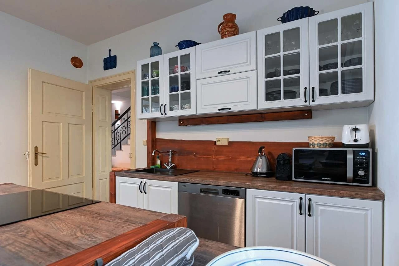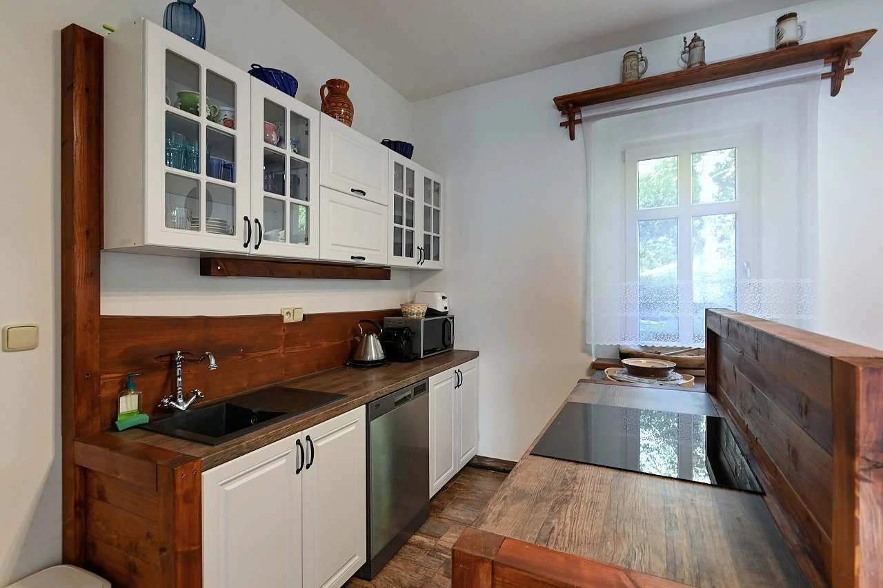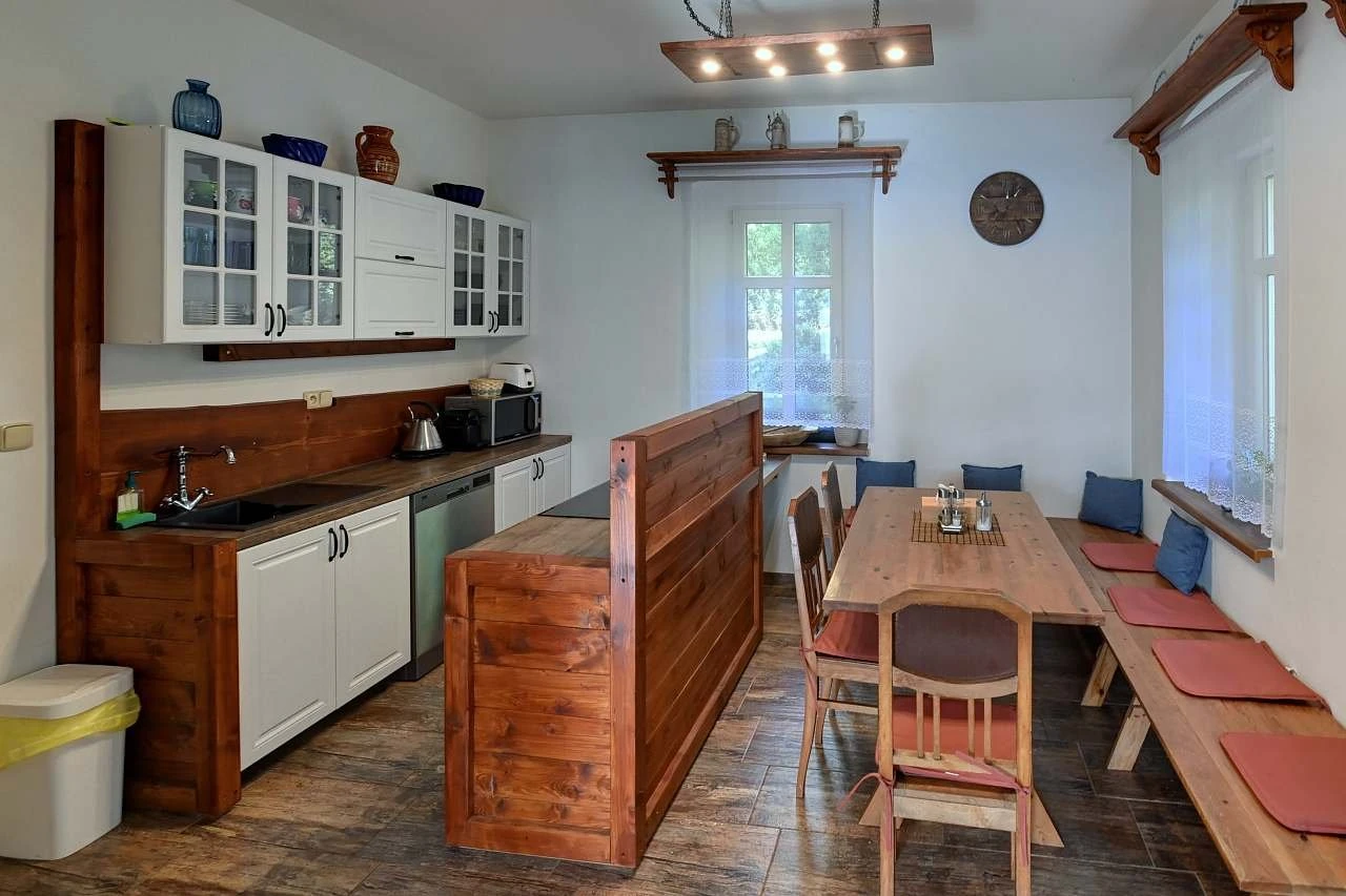 Kuchyně: indukční sporák, mikrovlnná trouba, myčka na nádobí, rychlovarná konvice, toustovač, lednička, kompletní nádobí a potřeby pro vaření, jídelní stůl s lavicí propojený s obývacím pokojem.
