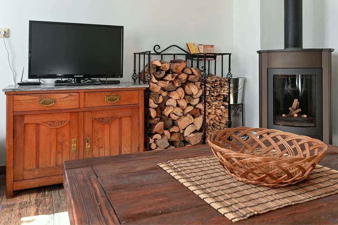Obývací pokoj: velká pohovka, krb / krbová kamna, televizor.