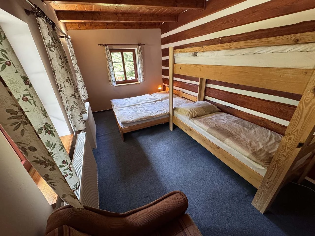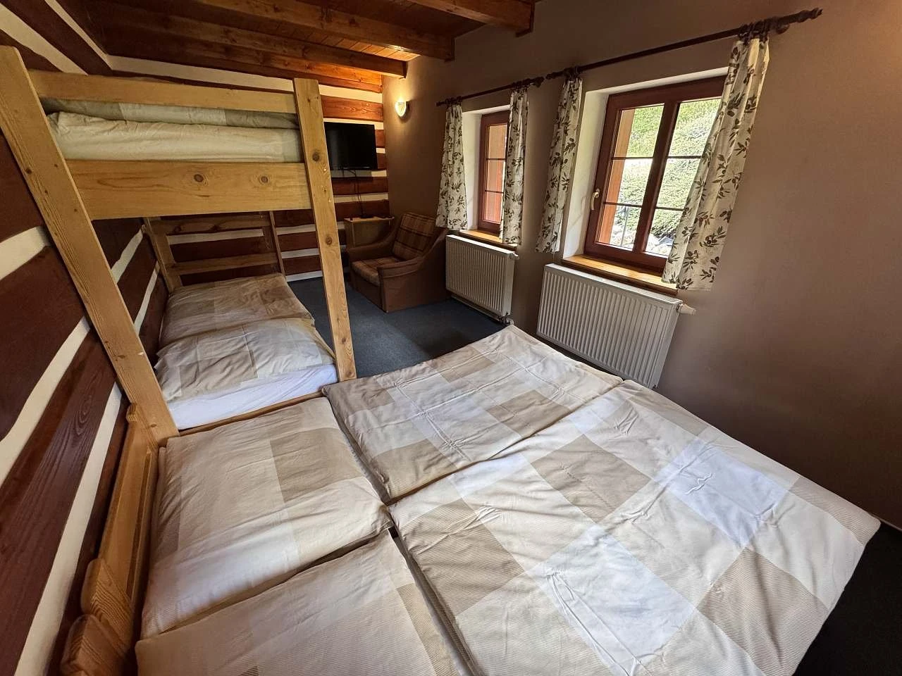 - Apartmán 2: 2 ložnice, 6 pevných lůžek (dvoulůžko + dvoulůžko s palandou), třetí pokoj pro posezení