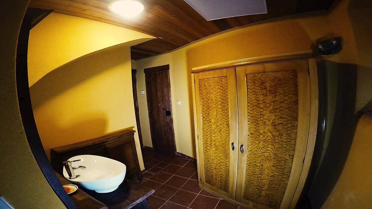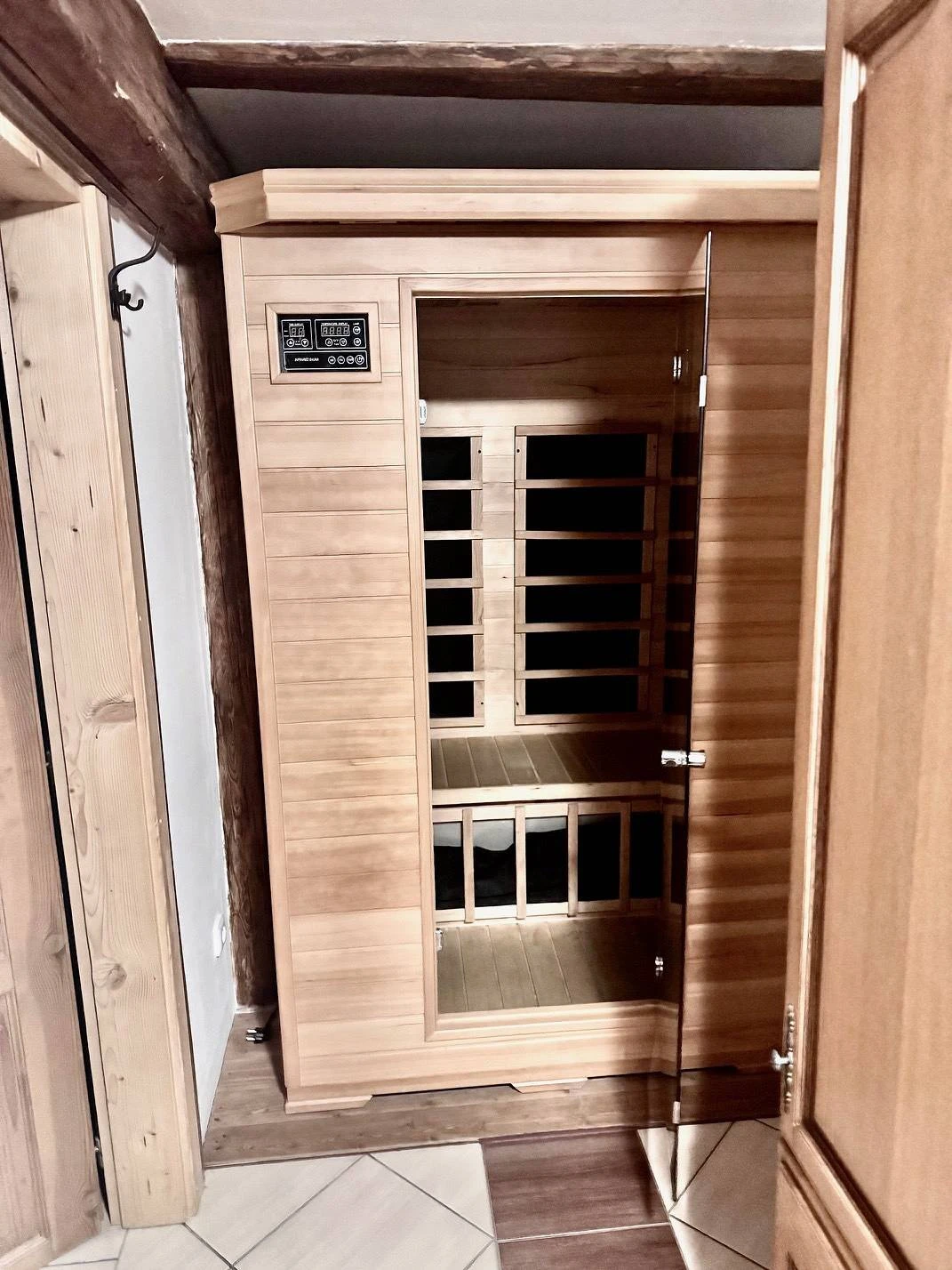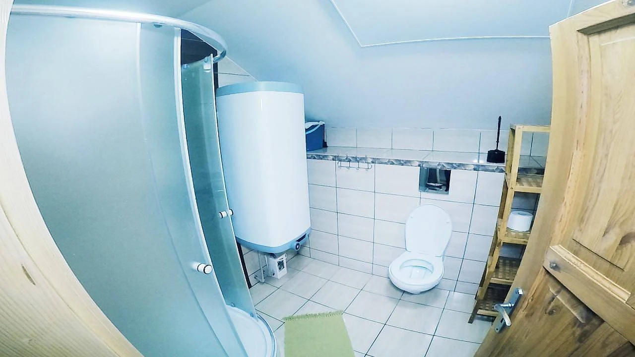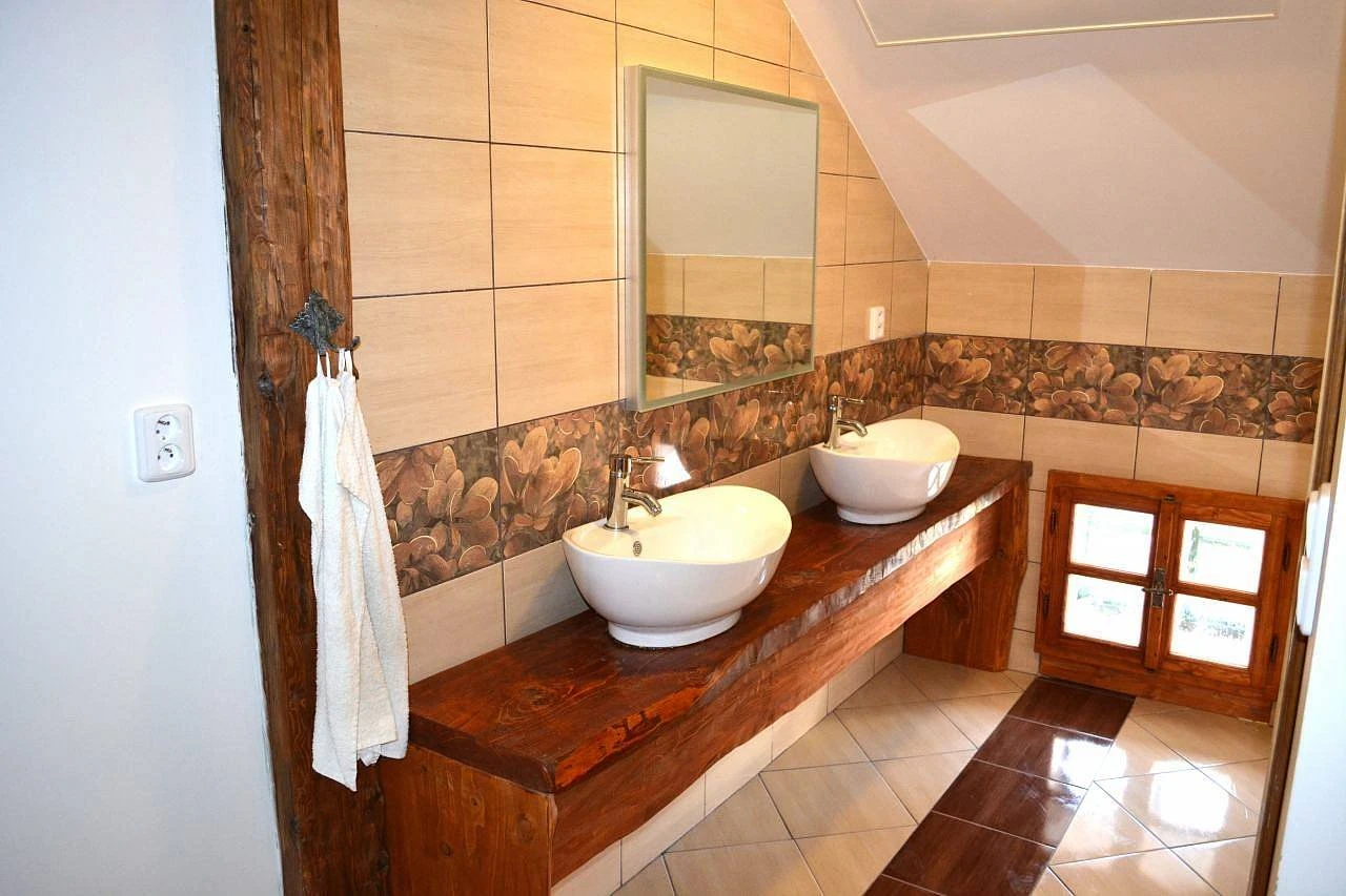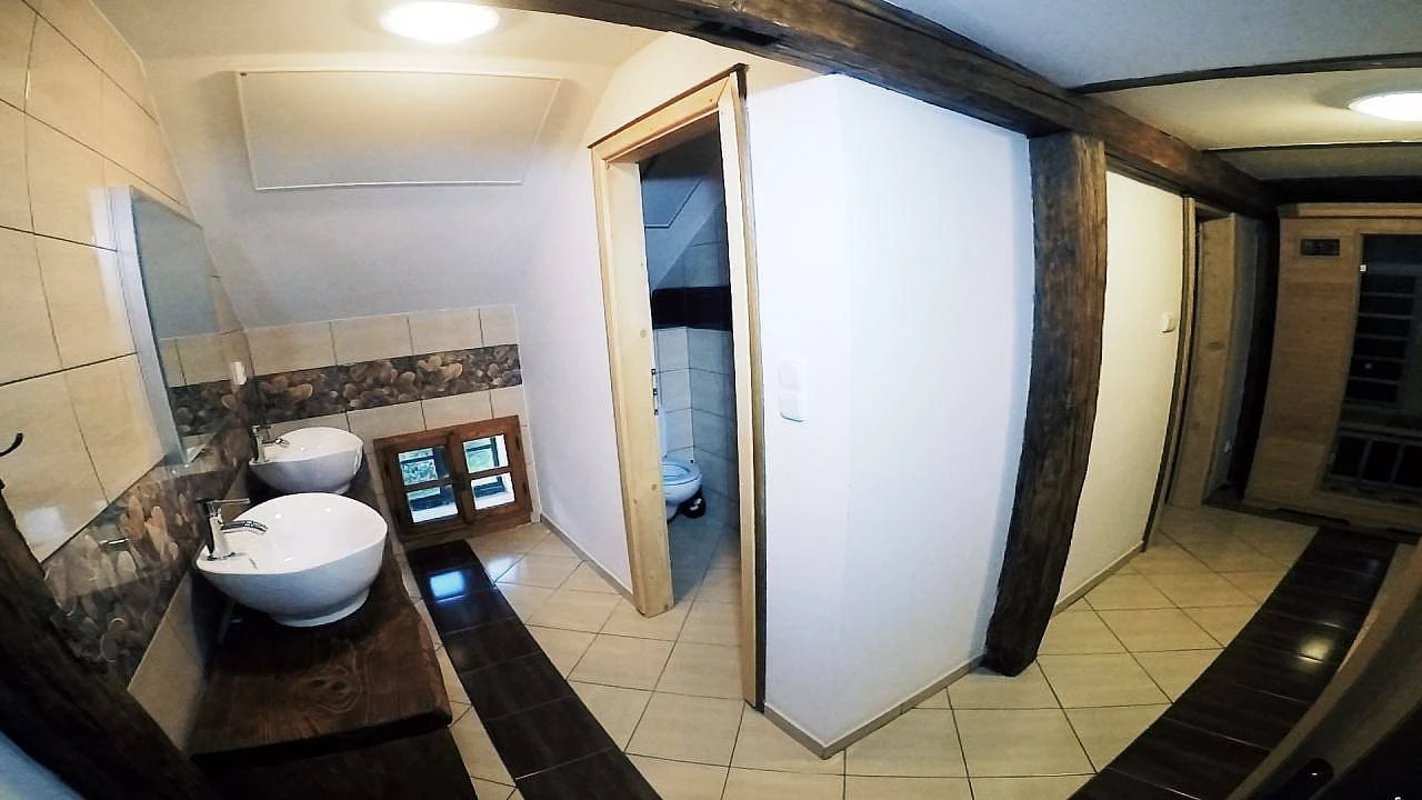Sociální zařízení zahrnuje 3 koupelny se sprchou a WC, 2 samostatné toalety a 4 umyvadla. Chalupa je vybavena elektrickým vytápěním, což umožňuje celoroční provoz.