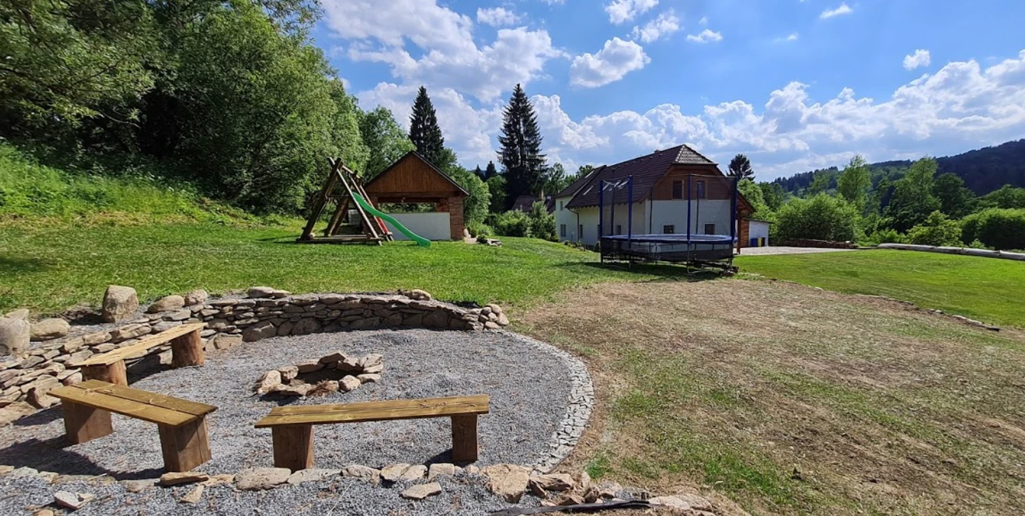 K dispozici je neoplocená zahrada s pergolou, venkovním posezením a možností grilování. Součástí venkovního vybavení je také trampolína a houpačka. U objektu se nachází parkování pro 4–5 osobních automobilů.