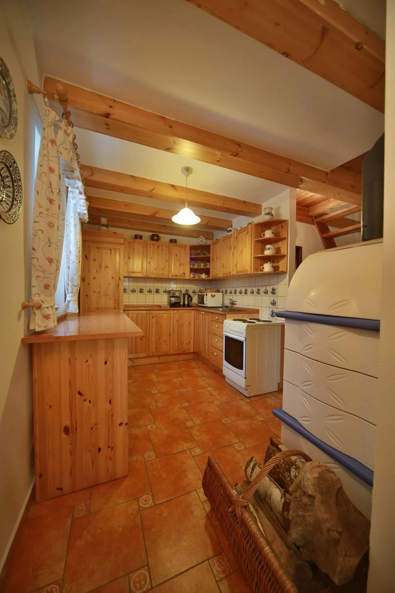 - Kuchyňský kout (elektrický sporák, lednička, mikrovlnná trouba, přístroj na kávu) s posezením