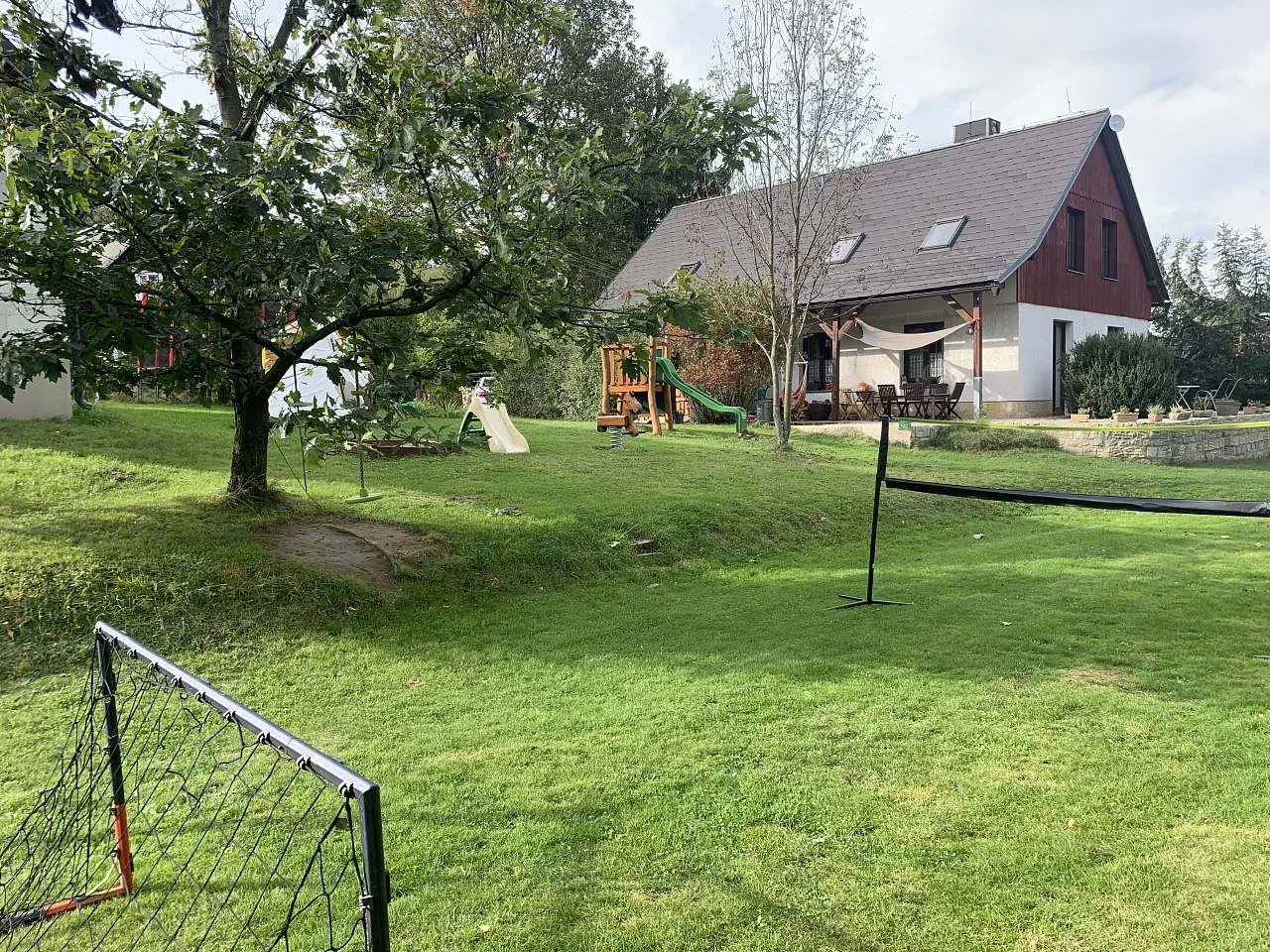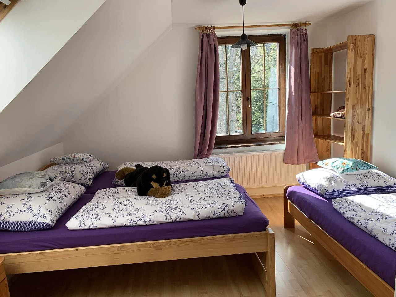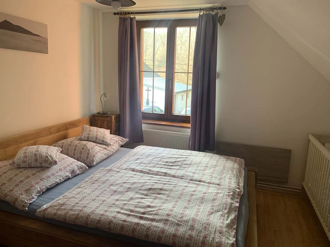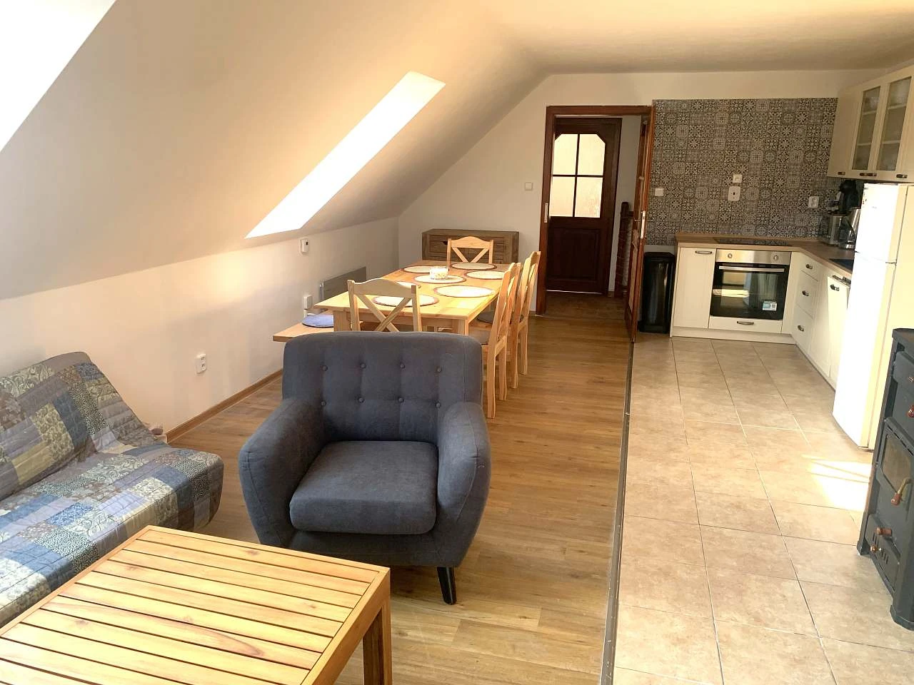 Dispozice: 3+kkRozloha: 110 m²Kapacita: 5 osob + 2 přistýlkyProstoryLožnice 1:1× manželská postel1× dětská postýlkaLožnice 2:3× samostatná postelObývací pokoj:2× gauč (možnost využití jako přistýlky s tenkou matrací)Krbová kamna na dřevoPropojení s dětskou hernouDětská herna:HračkyKoupelna:VanaWCPračka se sušičkouChodba:Bezpečnostní branka na schodyVybavení kuchyňského koutuNová kuchyňská linka (1/2025):Elektrický sporák s troubouMyčka nádobíMikrovlnná troubaLedniceKávovar na překapávanou kávuMlýnek na kávuRychlovarná konviceToustovač/topinkovačTyčový mixerElektrická remoskaZákladní vybavení v ceněTextil:Ložní prádloRučníkyUtěrkyDrogerie:Čistící prostředkyHygienické potřebyPotraviny:KořeníSůlOlejČaj (instantní a mletý)Káva (zrnková, mletá, instantní)CukrVytápěníKrbová kamna na dřevo (hlavní zdroj tepla)Elektrické keramické topné panely s termostaty v každém pokojiDřevo na topení v ceněDřevo na venkovní ohýnky v ceně