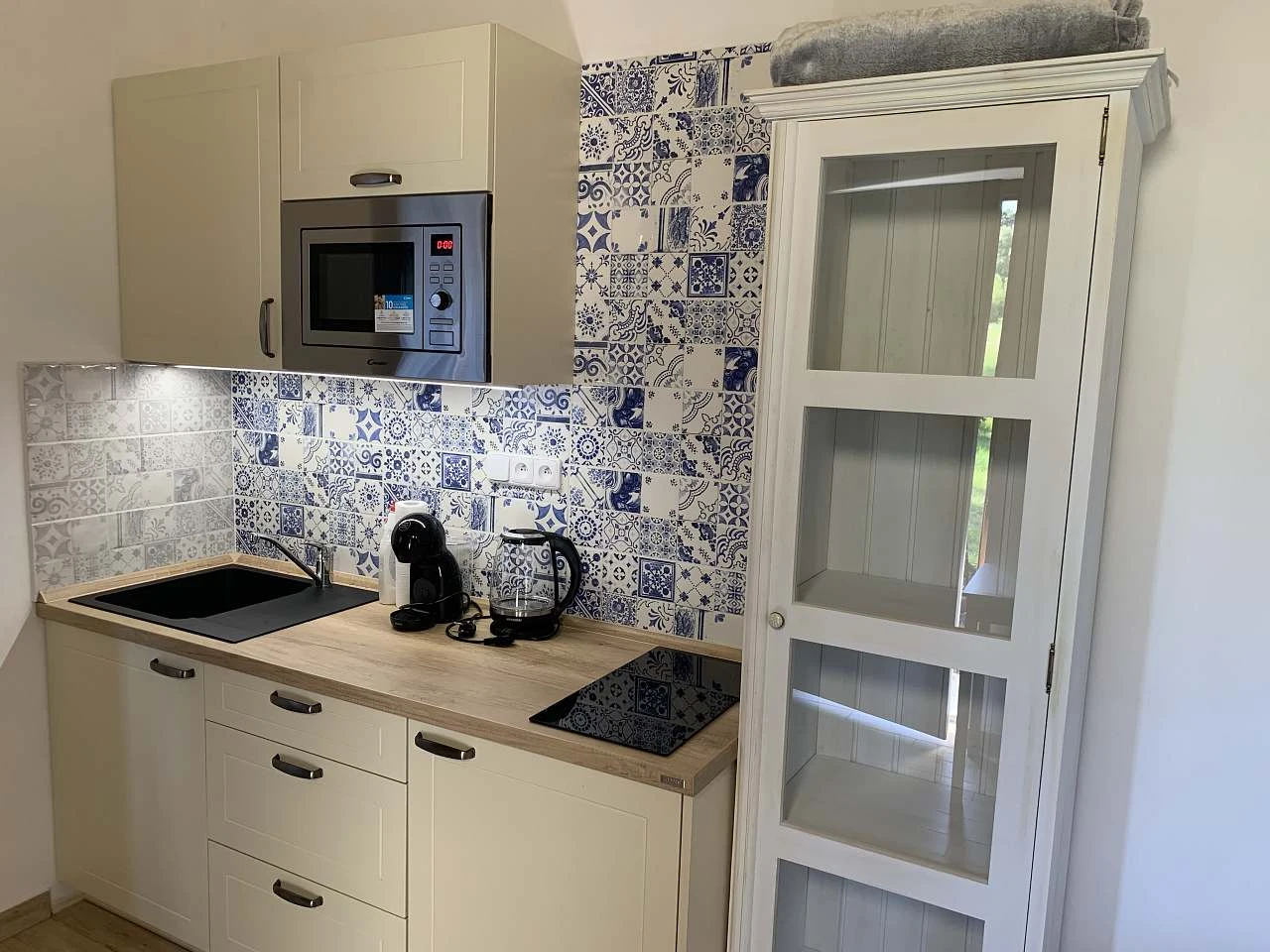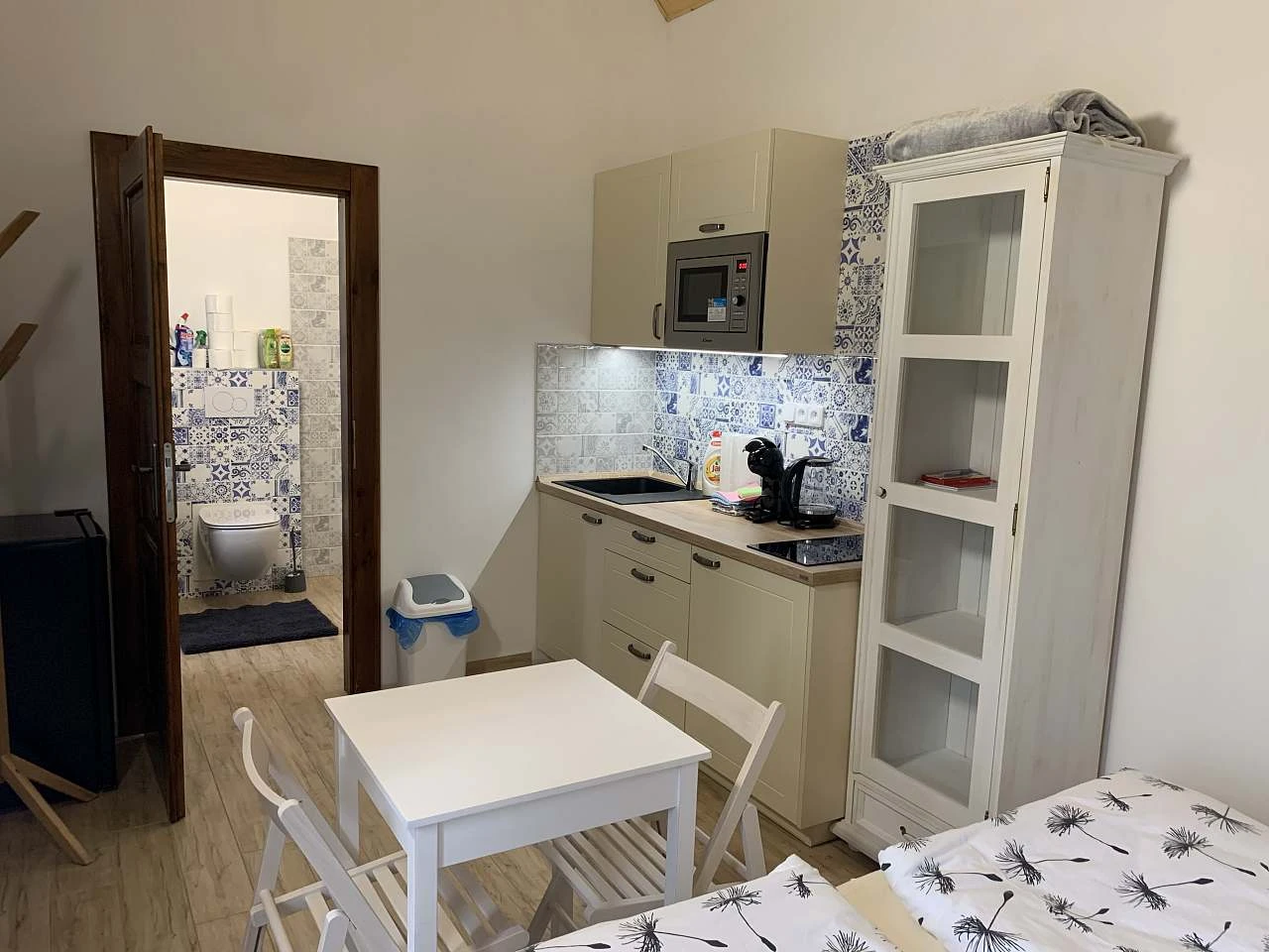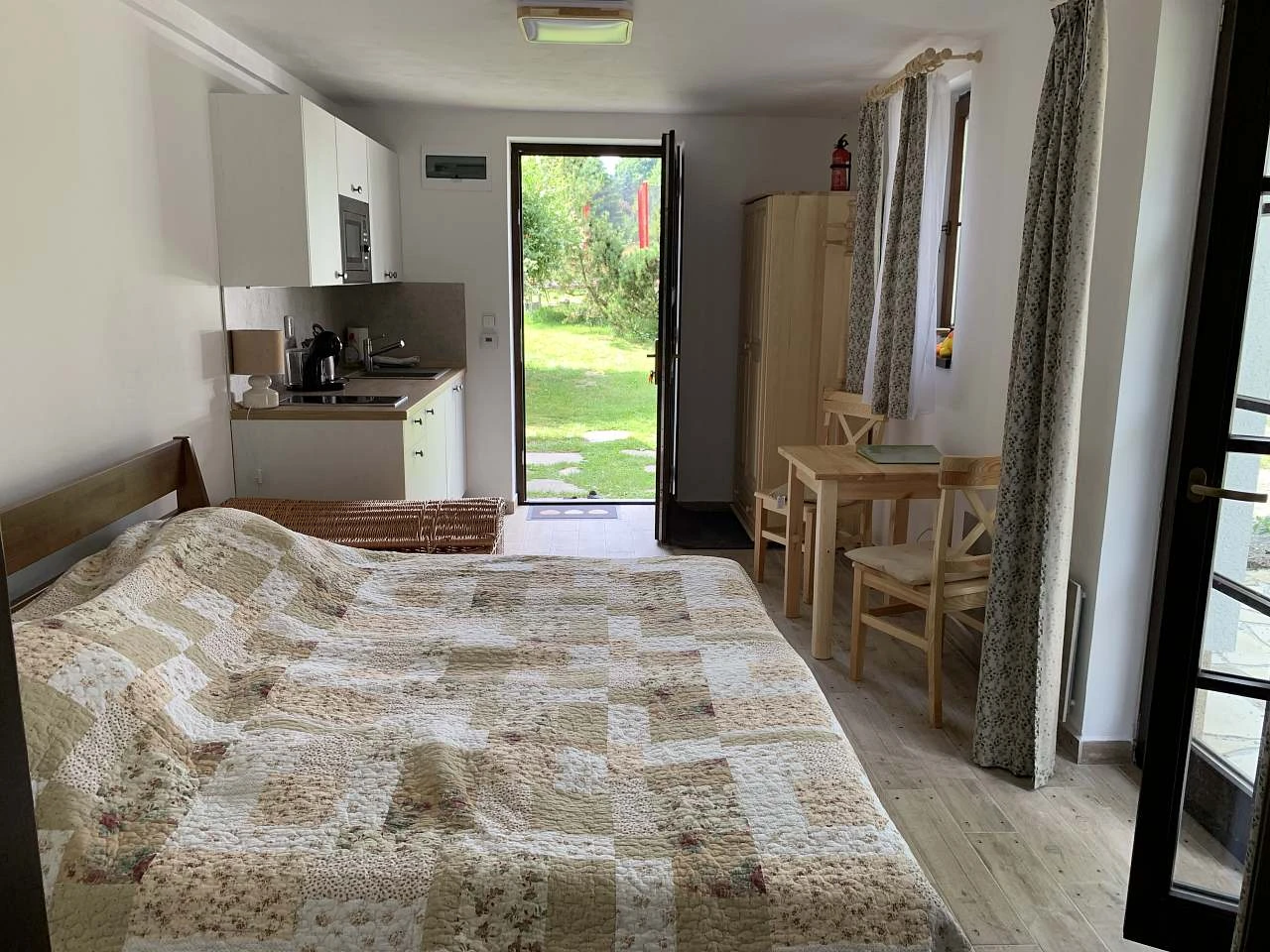 Dispozice: 1+kkRozloha: 23 m²Kapacita: 2 osobyProstoryHlavní místnost:Rozkládací gauč s klasickými matracemiÚložné prostoryPosezeníSamostatný vchodPřímý vstup na terasuKoupelna:Sprchový koutWCTerasa:Venkovní posezeníVybavení kuchyňské linkyElektrická dvojplotýnkaMikrovlnná troubaLedniceKapslový kávovarDripper Hario (konvička a příslušenství pro překapávanou kávu)Rychlovarná konviceTopinkovačElektrická remoskaZákladní vybavení v ceněTextil:Ložní prádloRučníkyUtěrkyDrogerie:Čistící prostředkyHygienické potřebyPotraviny:KořeníSůlOlejČaj (instantní a mletý)Káva (instantní, mletá)CukrUpozorněníMožnost ubytování dítěte v posteli s rodičiOmezený prostor při použití cestovní postýlkyOmezený prostor při použití přistýlky (tenčí matrace na zem)