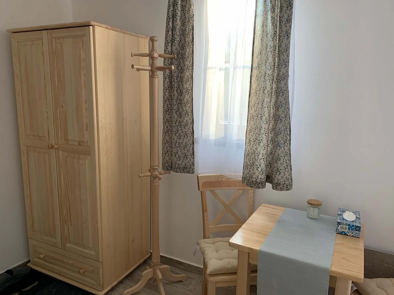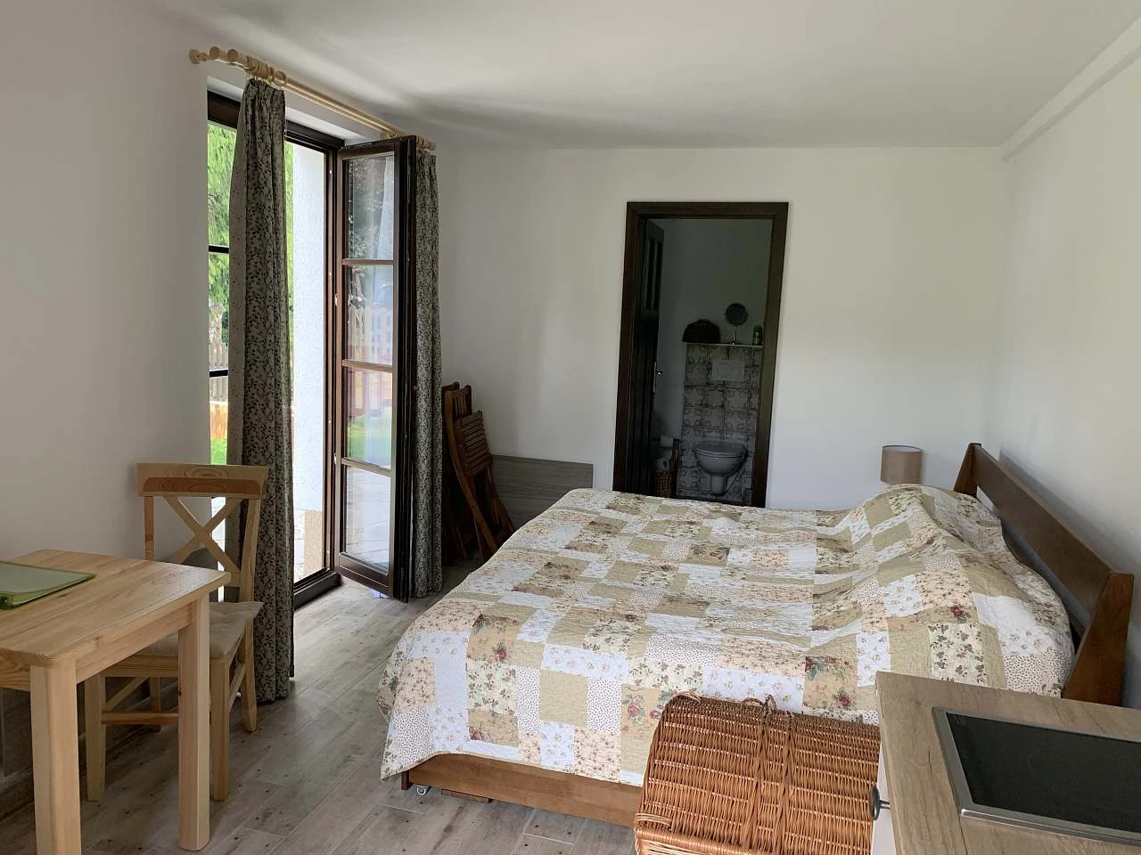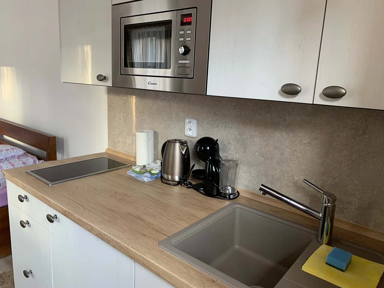 Dispozice: 1+kkRozloha: 23 m²Kapacita: 2 osobyProstoryHlavní místnost:Rozkládací gauč s klasickými matracemiÚložné prostoryPosezeníSamostatný vchodPřímý vstup na terasuKoupelna:Sprchový koutWCTerasa:Venkovní posezeníVybavení kuchyňské linkyElektrická dvojplotýnkaMikrovlnná troubaLedniceKapslový kávovarDripper Hario (konvička a příslušenství pro překapávanou kávu)Rychlovarná konviceTopinkovačElektrická remoskaZákladní vybavení v ceněTextil:Ložní prádloRučníkyUtěrkyDrogerie:Čistící prostředkyHygienické potřebyPotraviny:KořeníSůlOlejČaj (instantní a mletý)Káva (instantní, mletá)CukrUpozorněníMožnost ubytování dítěte v posteli s rodičiOmezený prostor při použití cestovní postýlkyOmezený prostor při použití přistýlky (tenčí matrace na zem)
