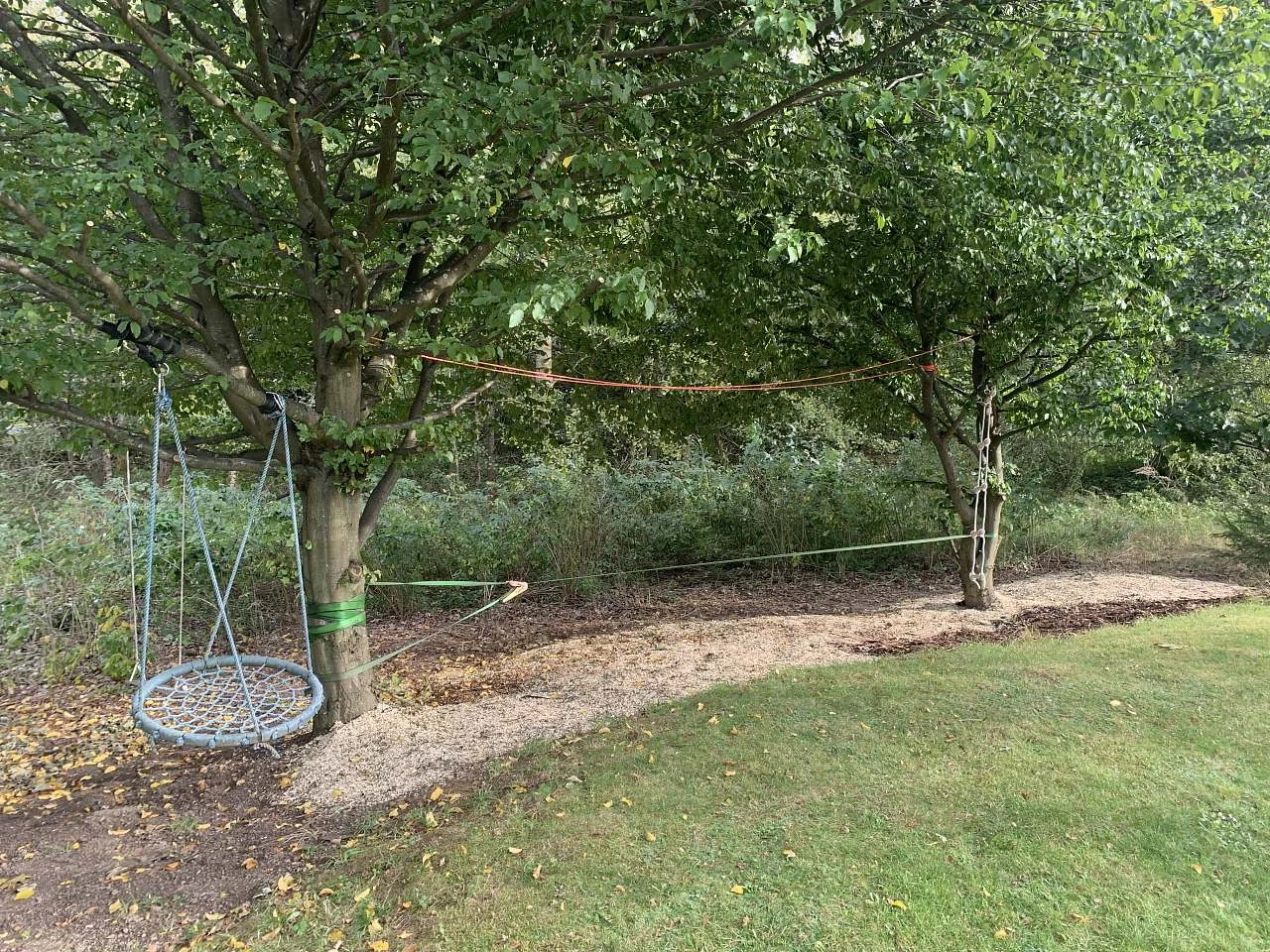 Venkovní vybavení zahrnuje trampolínu, pískoviště, dětskou sestavu, houpačky, venkovní ping-pong, ruské kuželky, travnaté hřiště s fotbalovými brankami, hračky, míče, herní prvky, slackline a v letním období malý nafukovací bazének pro děti.