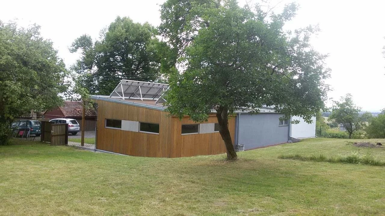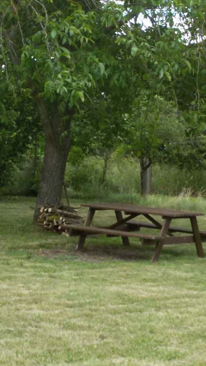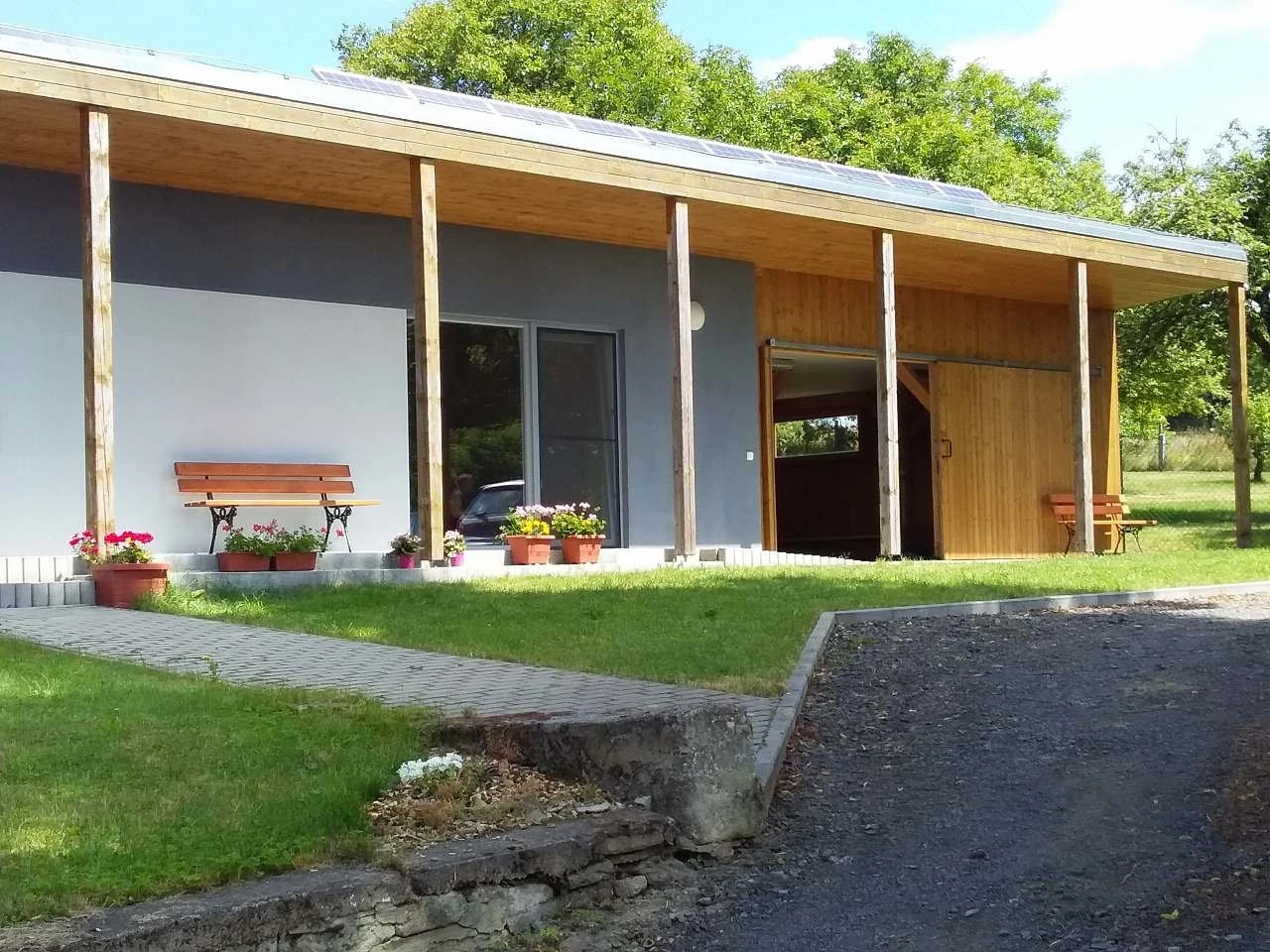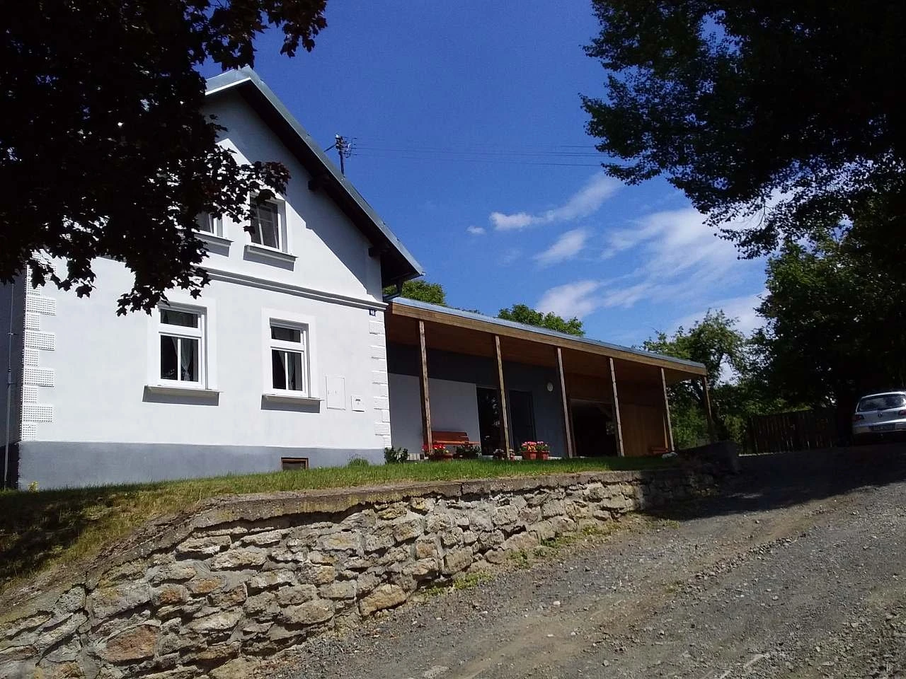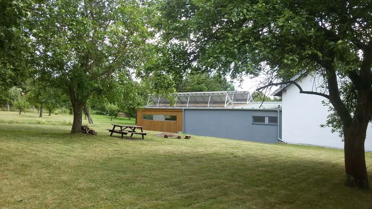 Venkovní prostory zahrnují zahradní nábytek, travnatou plochu, přírodní ohniště a možnost posezení pod vzrostlými stromy. Součástí objektu je uzamykatelná dřevěná přístavba, vhodná k posezení při špatném počasí nebo k uložení kol, s hracím koutkem pro děti a hračkami, kreslícími a psacími potřebami. K zapůjčení je i pétanque.