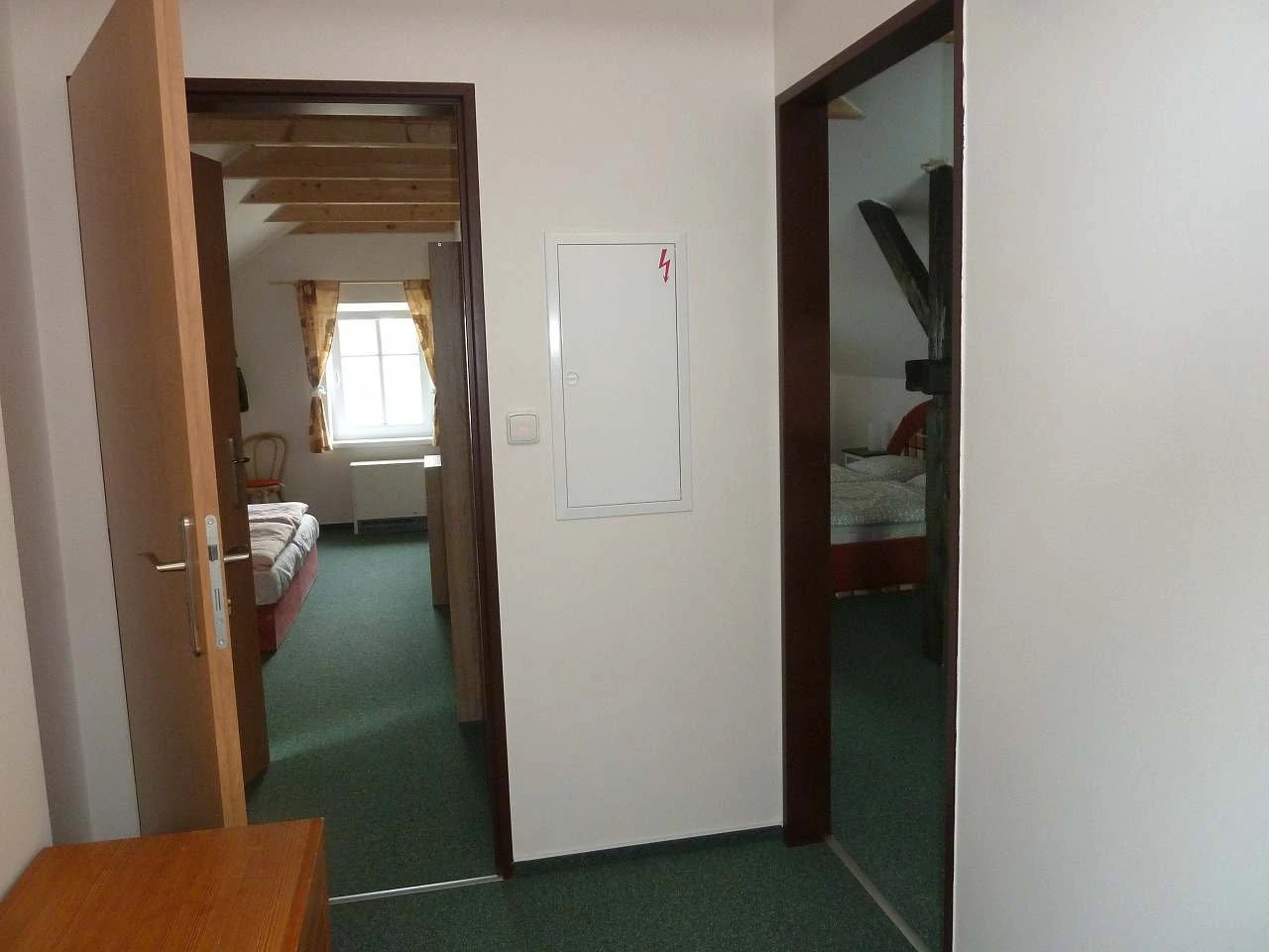 V ložnicích jsou postele s čistě povlečenými polštáři a dekami, noční stolky s lampičkami, police na odkládání svršků, odkládací stolky a židle. Chalupa má 5 pokojů s vlastními koupelnami, včetně bezbariérové koupelny u šestilůžkového pokoje.