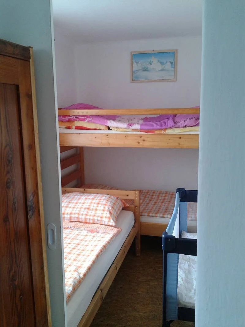 Dispozice zahrnuje jednu menší ložnici, ve které se nachází 1 samostatná postel, 1 patrová postel a 1 přistýlka, s možností dalšího spaní pro dítě na rozkládací sedačce (180 cm). Ložnice je oddělena od obývací části posuvnou stěnou a je vybavena úložnými prostory. Sociální zařízení tvoří koupelna se sprchovým koutem, WC a umyvadlem.