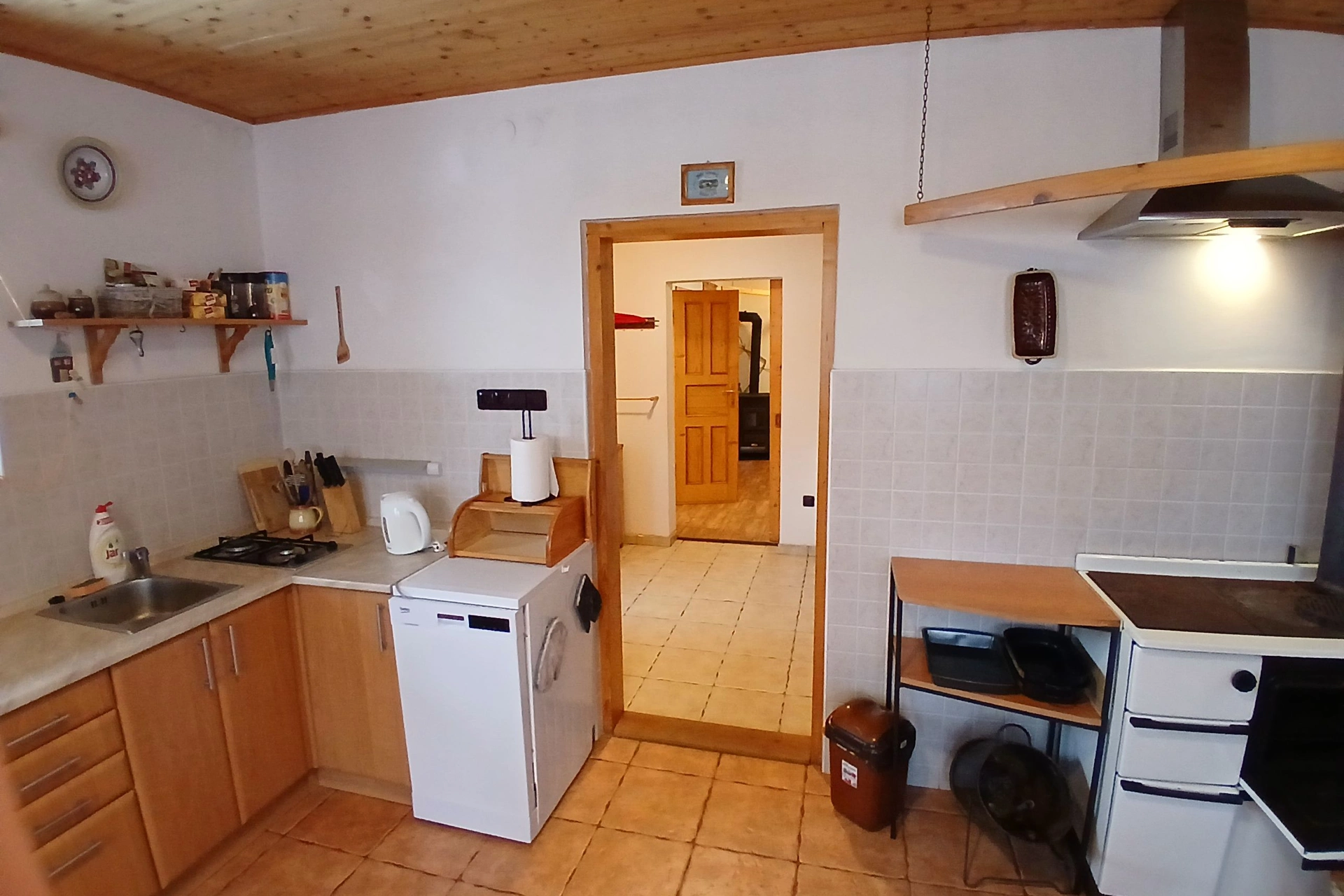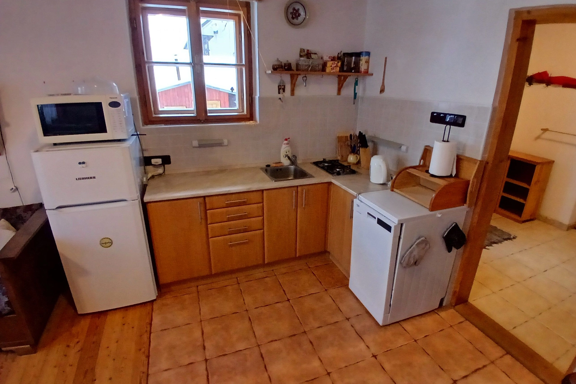 Plynový sporák, elektrická trouba, mikrovlnná trouba, lednice s mrazákem, myčka nádobí, rychlovarná konvice, jídelní stůl