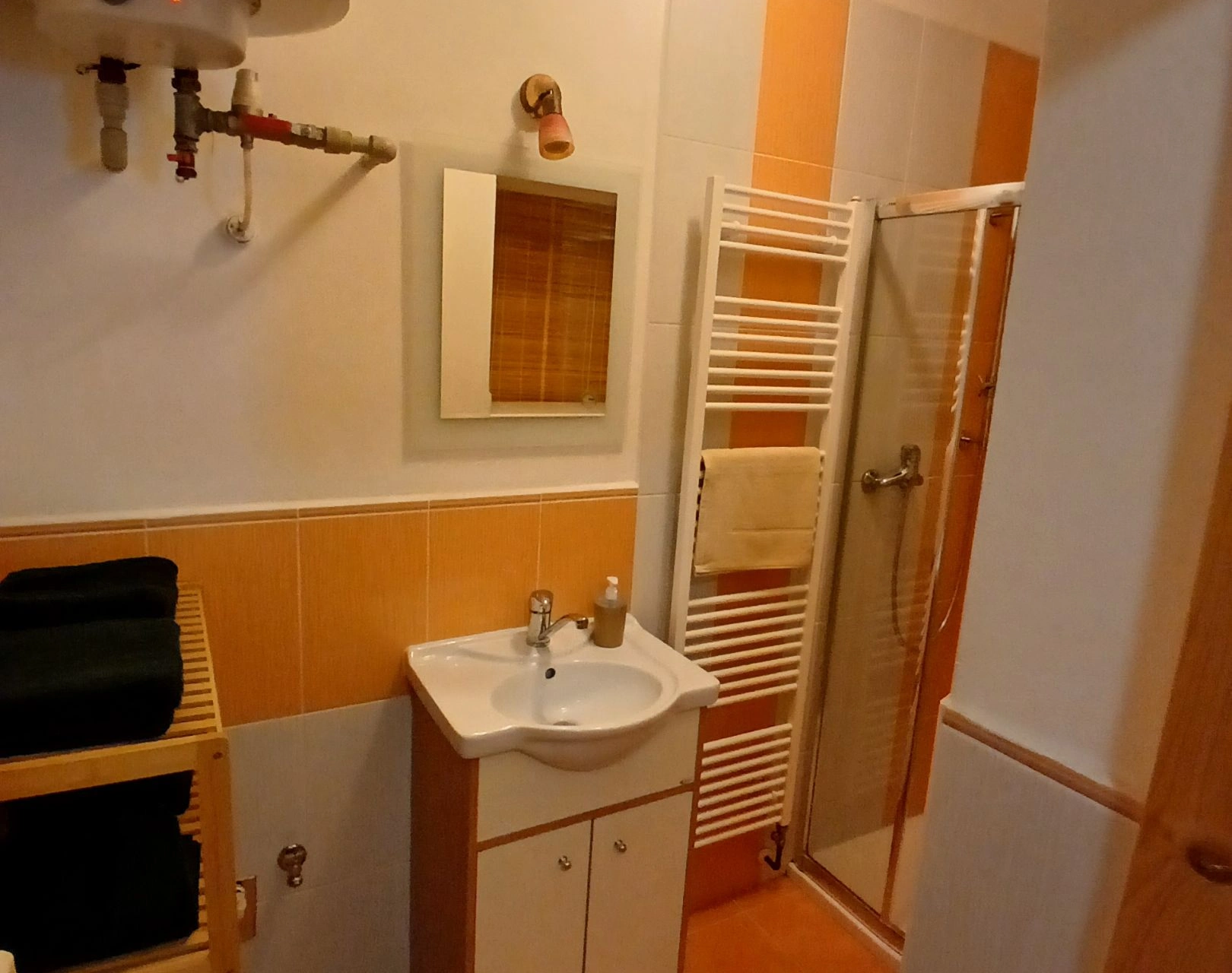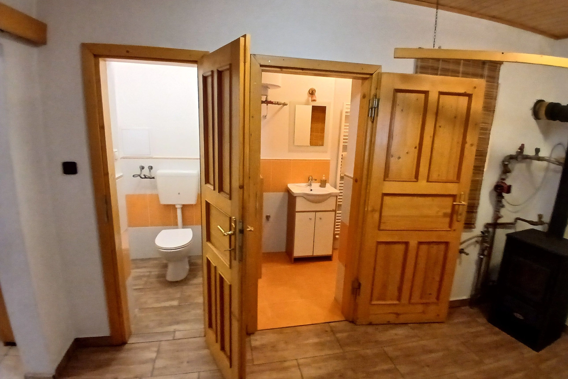 - Koupelna: sprchový kout, umyvadlo, sušák na prádlo, fén