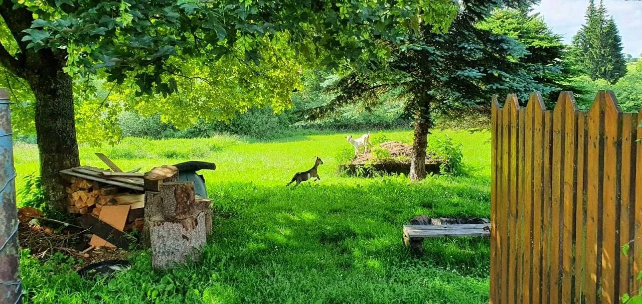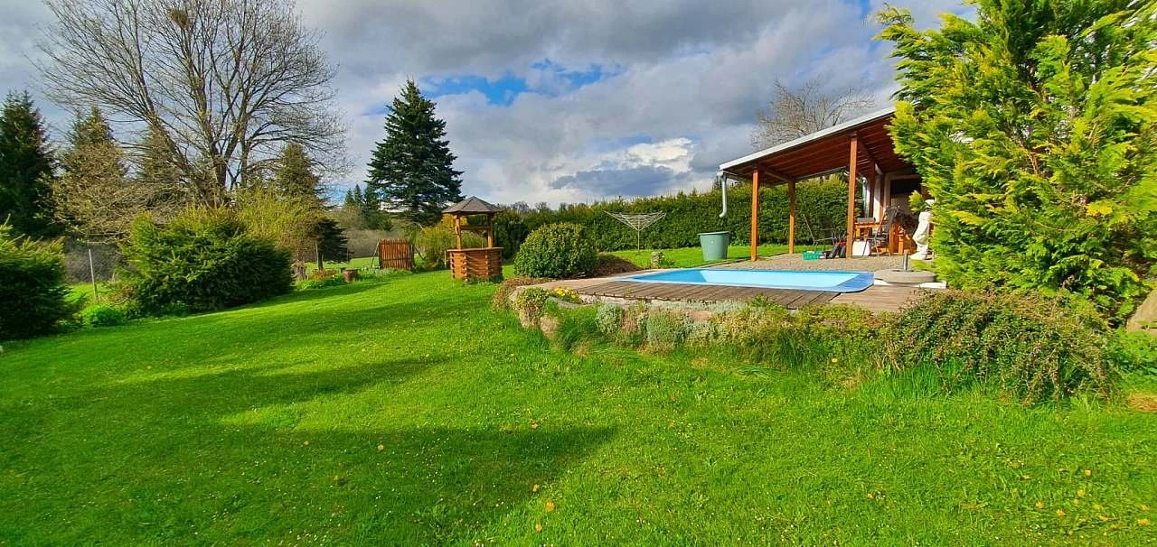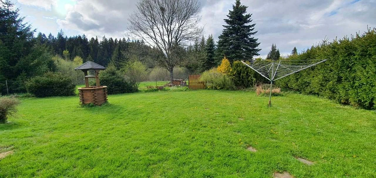 Okolí: oploceno, se zahradou, travnatá plocha, u lesa, parkování k dispozici.