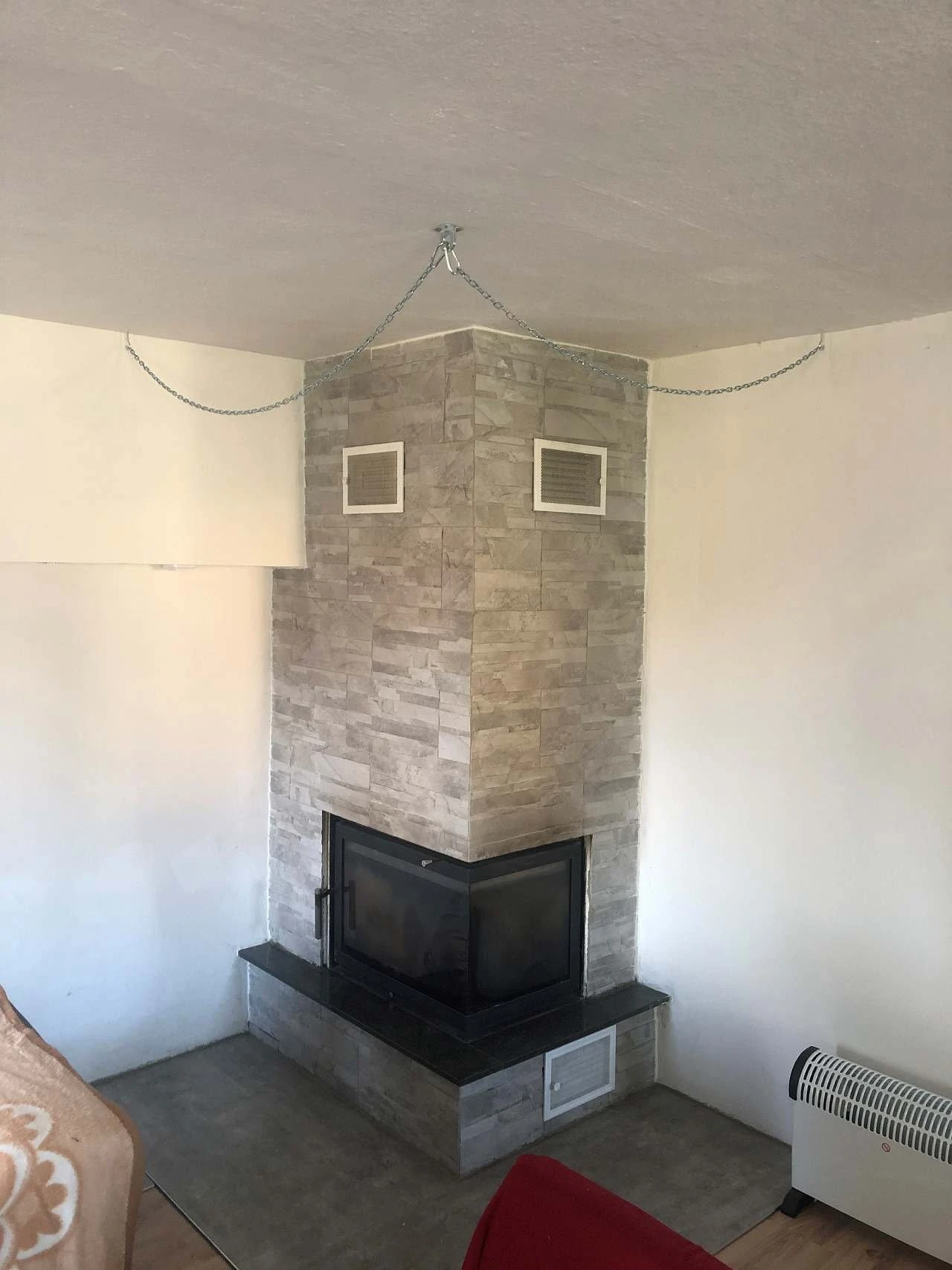 Vytápění chalupy je možné pomocí krbu, v přízemí je navíc elektrické podlahové topení a přímotopy, horní pokoje lze vytápět klimatizací.