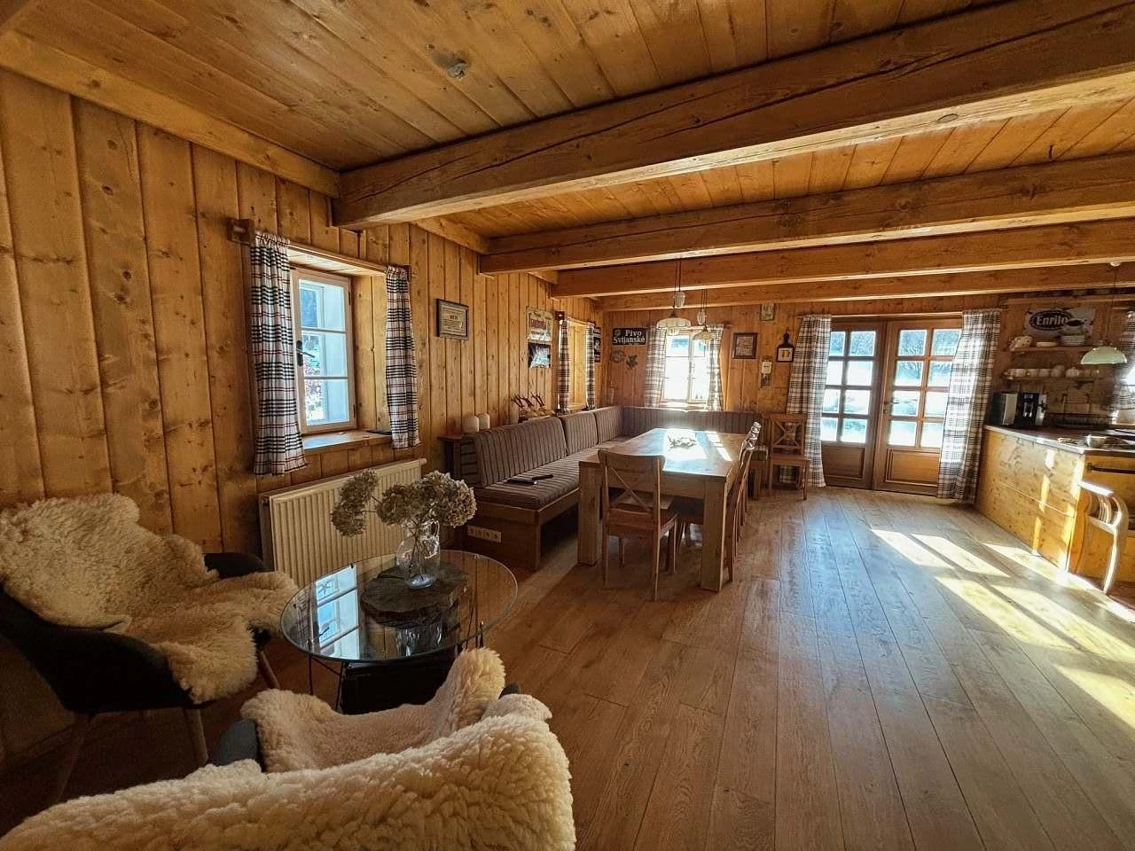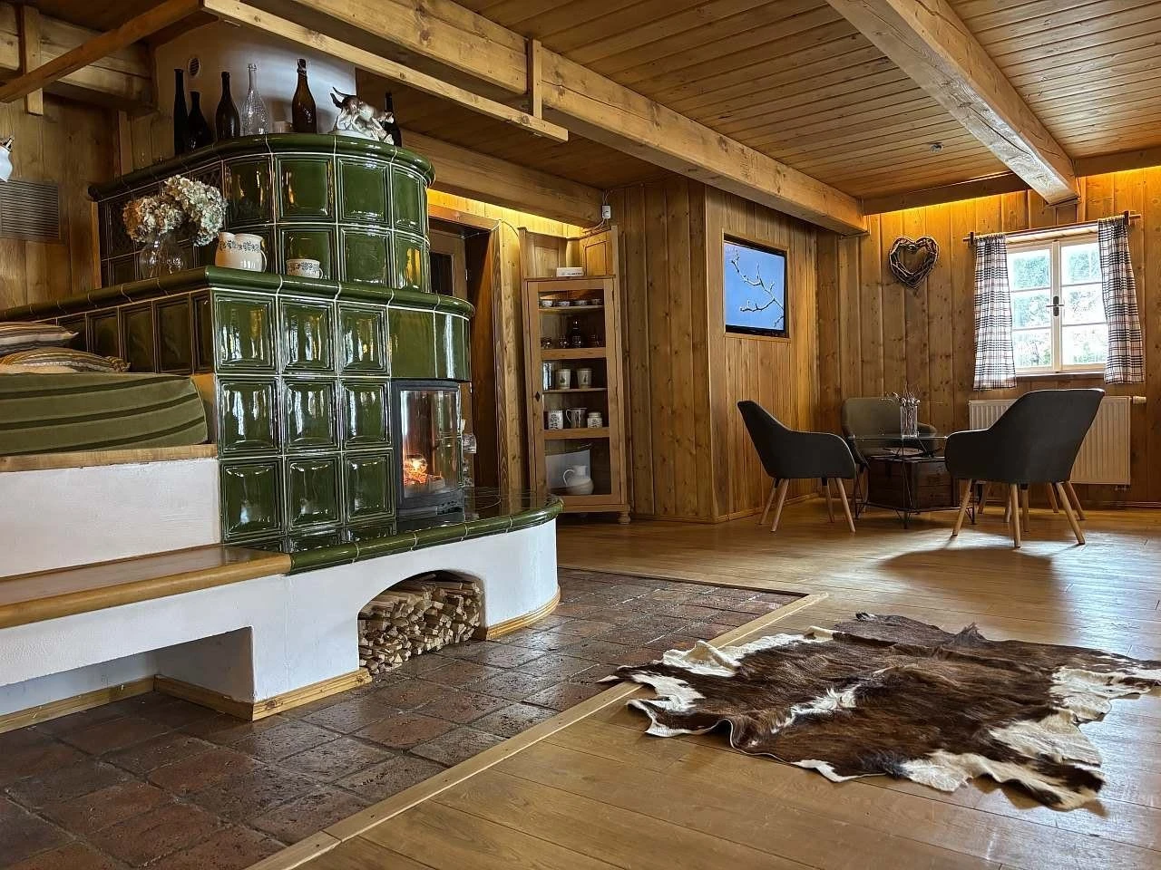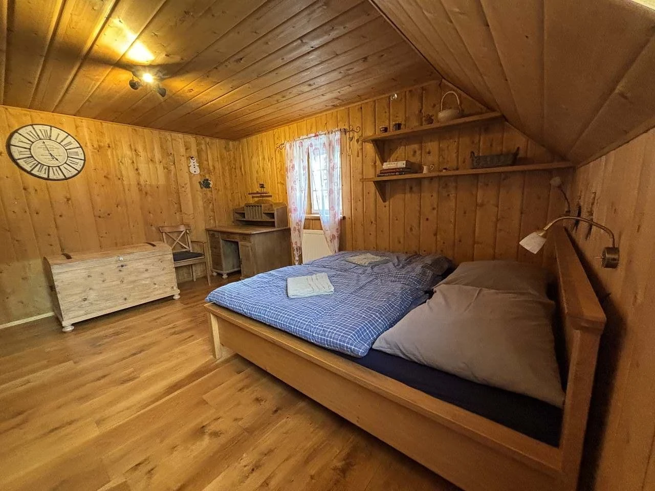 Objekt se pronajímá jako celek, nikoliv po jednotlivých pokojích. Součástí je plně vybavená kuchyň pro vlastní vaření, velká společenská místnost s pecí a zázemí pro pohodlný pobyt více osob. K dispozici je také venkovní posezení.