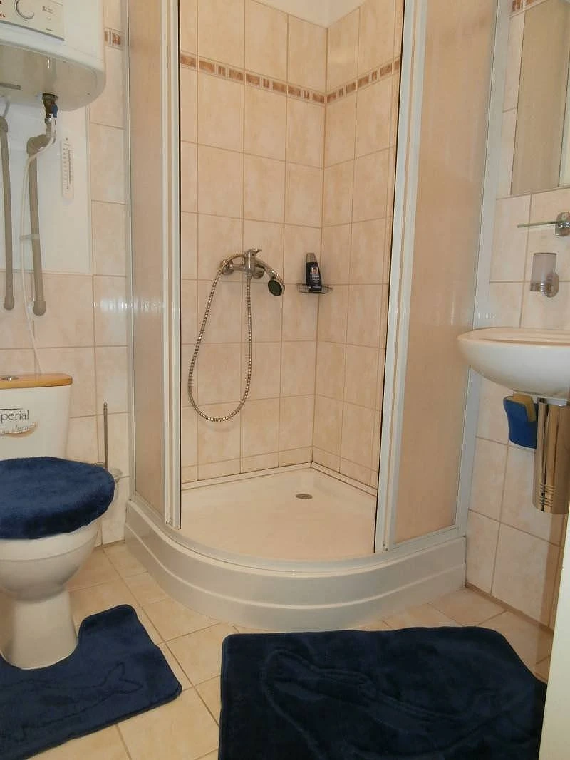 - Modrý apartmán: sprchový kout, umyvadlo, WC