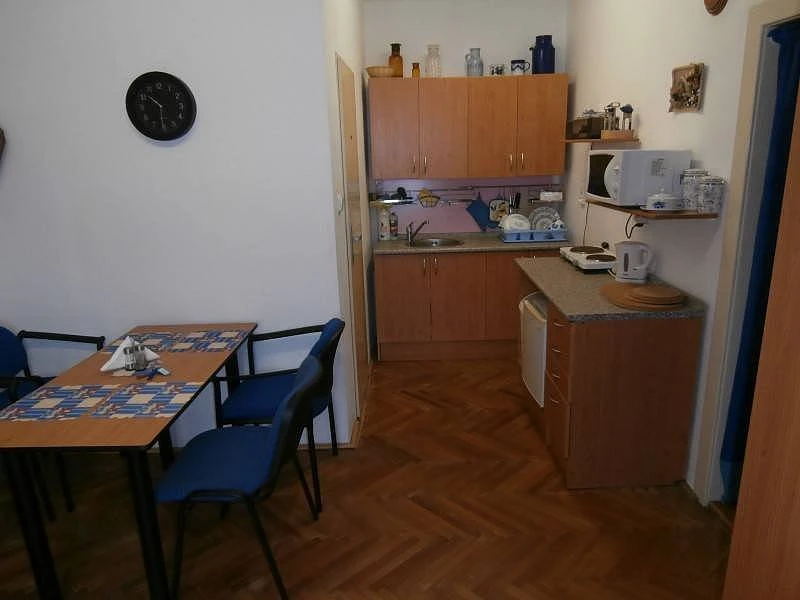 Kuchyňská linka s dřezem, jídelní stůl, nádobí, PB sporák (4 plotýnky) s elektrickou troubou, lednice, mikrovlnná trouba, rychlovarná konvice, topinkovač, samostatná spíž.