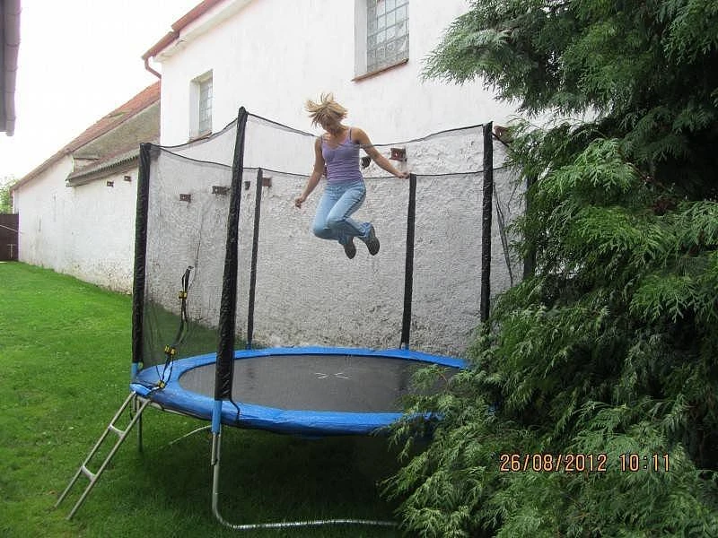 Pískoviště, houpačky, velká trampolína, badminton, petanque, míče, dětská postýlka, vanička, jídelní židlička, nočník.