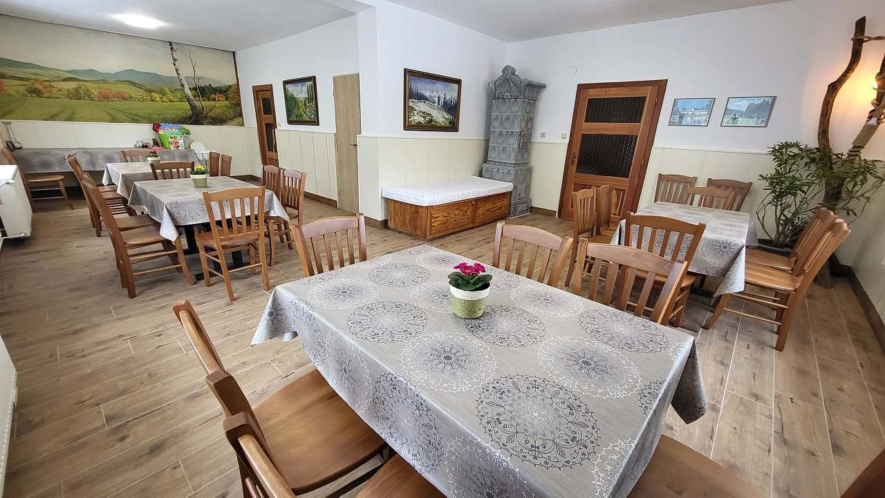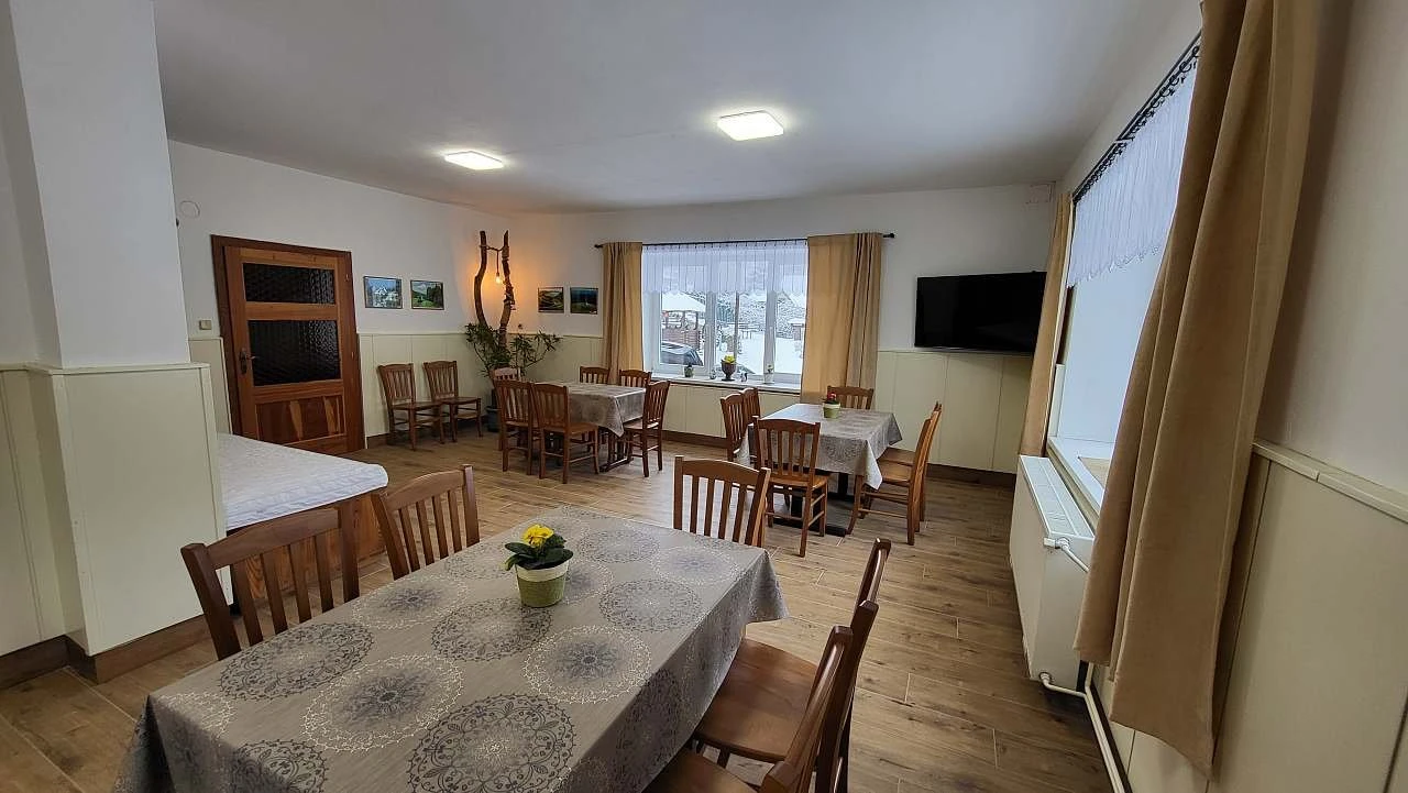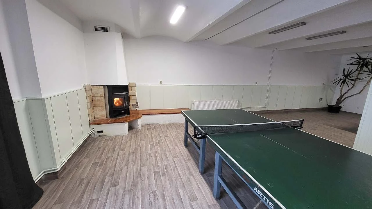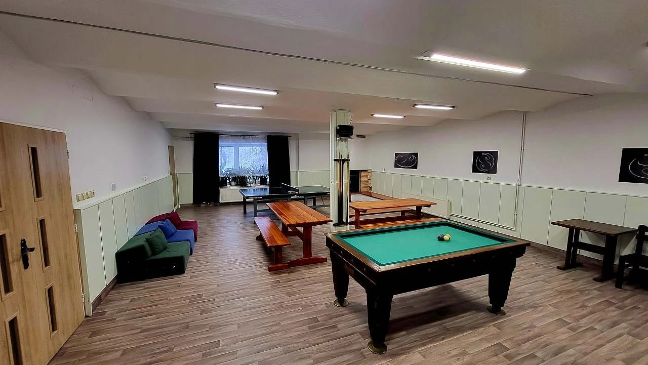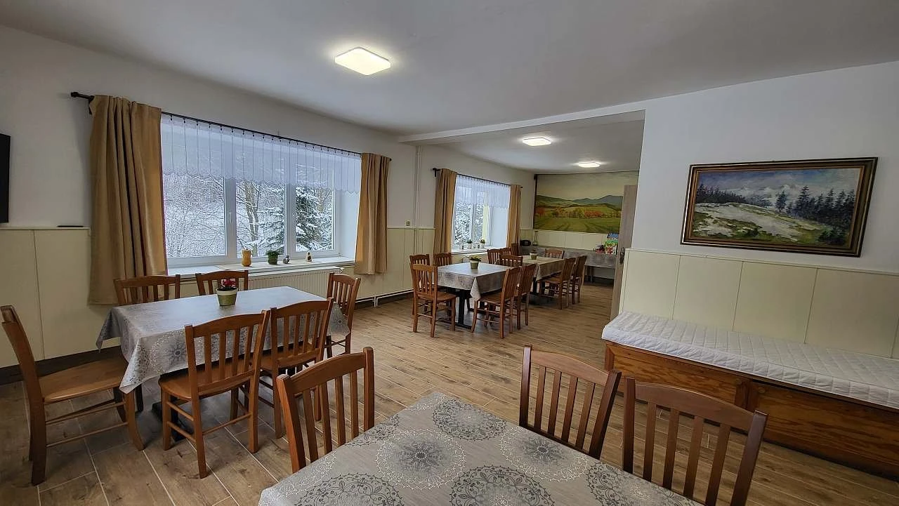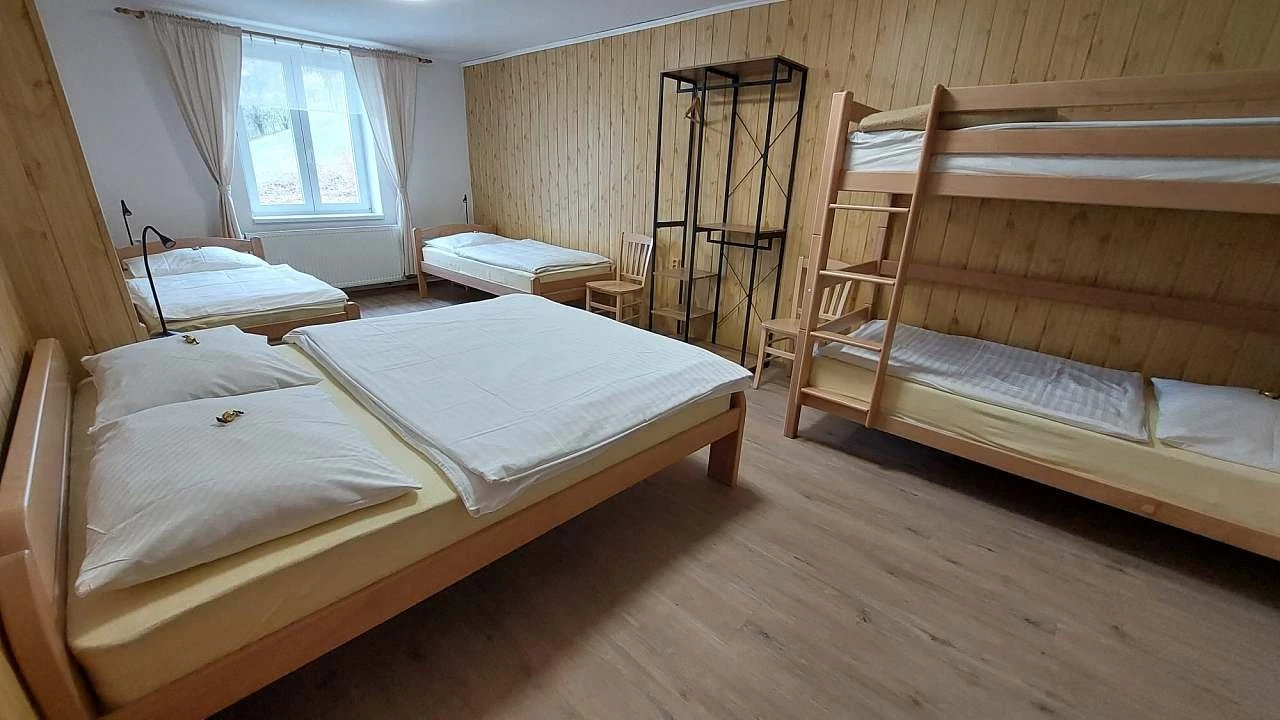 Ubytovací část se nachází v prvním patře a prošla rekonstrukcí v roce 2024. Každý pokoj má vlastní koupelnu se sprchou a toaletou. V přízemí je společné zázemí: plně vybavená kuchyně, jídelna, herna (kulečník, ping-pong), krbová kamna a toalety. Tento prostor byl modernizován na přelomu let 2024/2025 a je vhodný i pro větší skupiny (např. firemní akce nebo školení). K dispozici je také projektor s plátnem.
