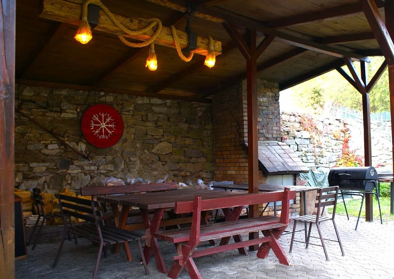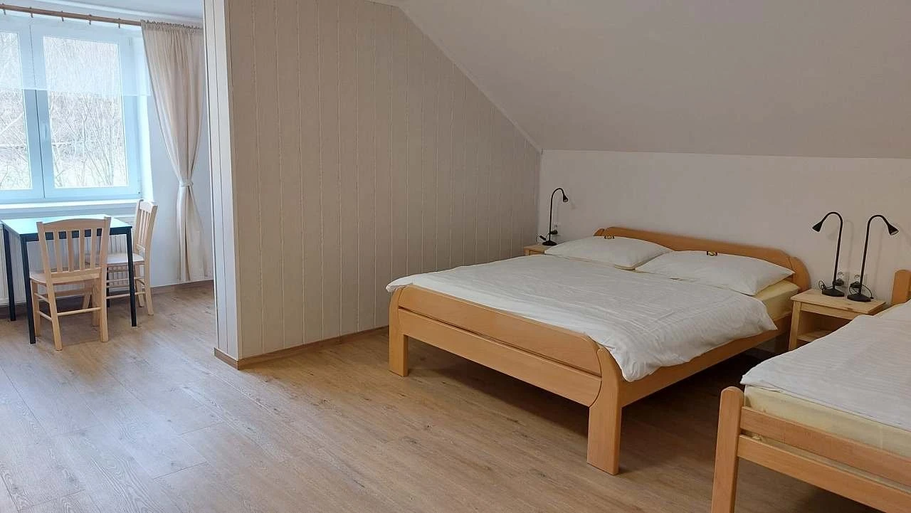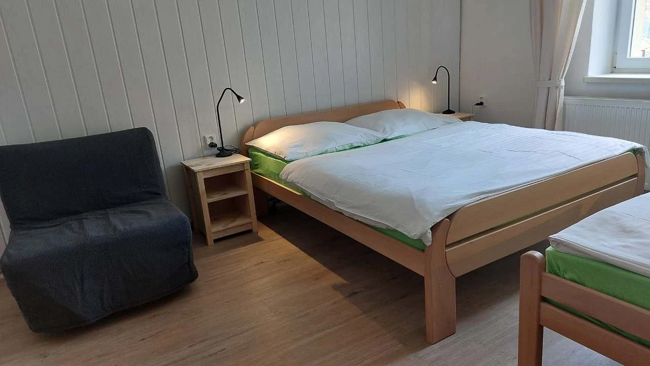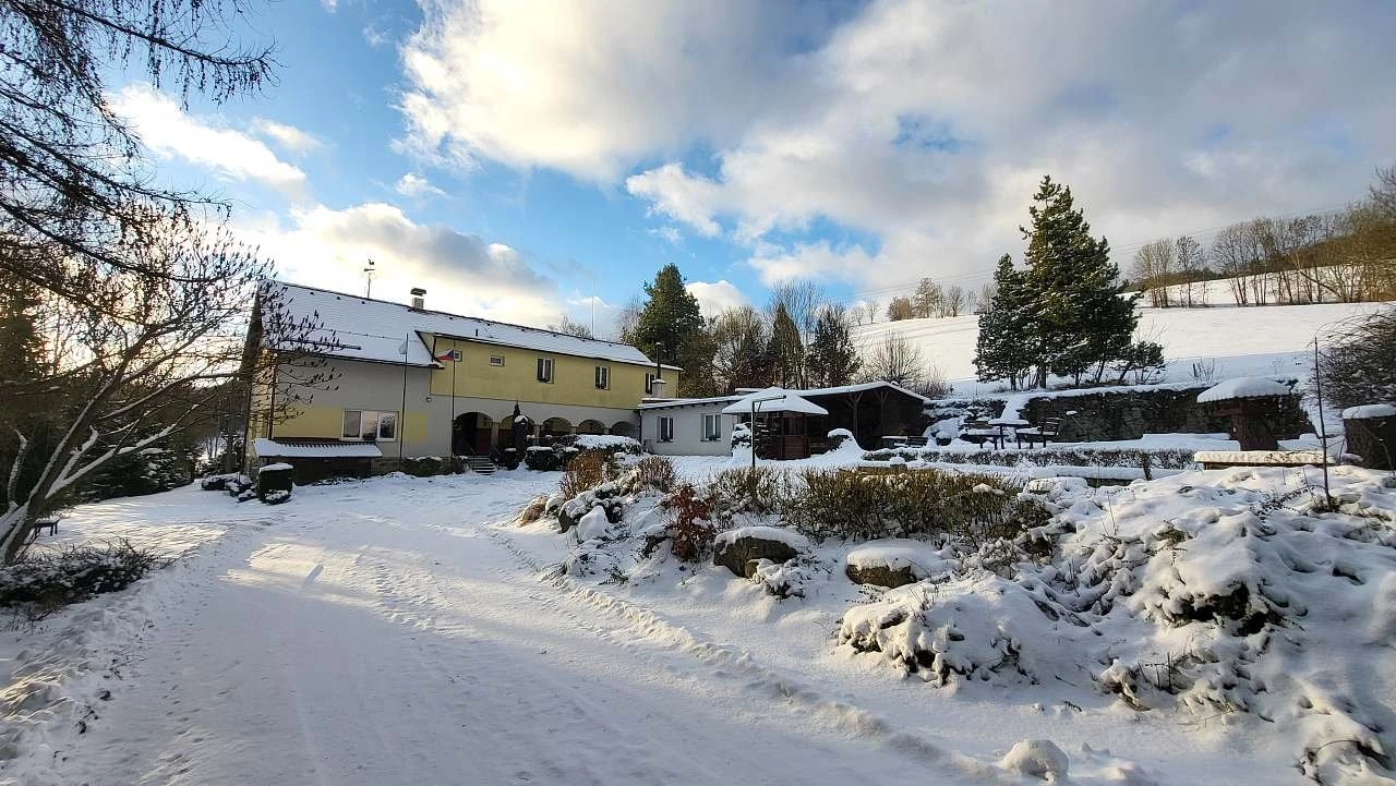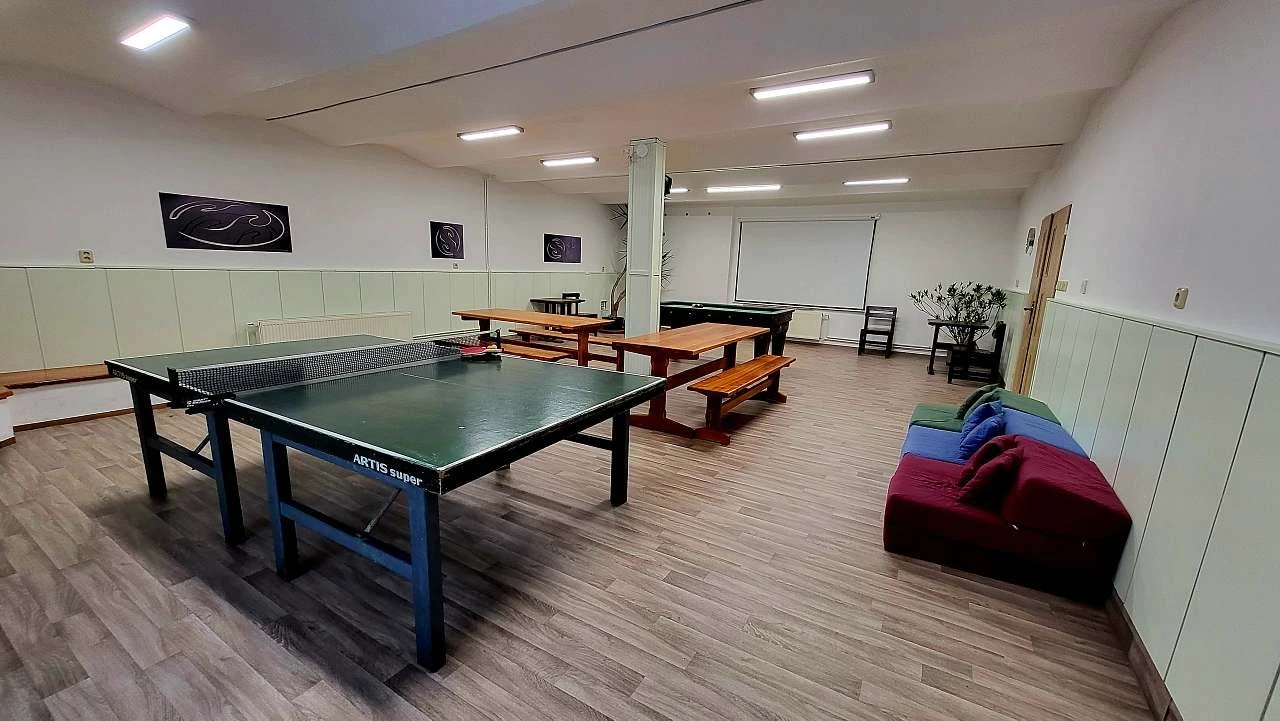 Ubytovací část se nachází v prvním patře a prošla rekonstrukcí v roce 2024. Každý pokoj má vlastní koupelnu se sprchou a toaletou. V přízemí je společné zázemí: plně vybavená kuchyně, jídelna, herna (kulečník, ping-pong), krbová kamna a toalety. Tento prostor byl modernizován na přelomu let 2024/2025 a je vhodný i pro větší skupiny (např. firemní akce nebo školení). K dispozici je také projektor s plátnem.