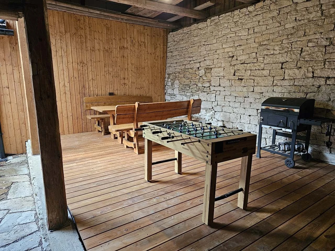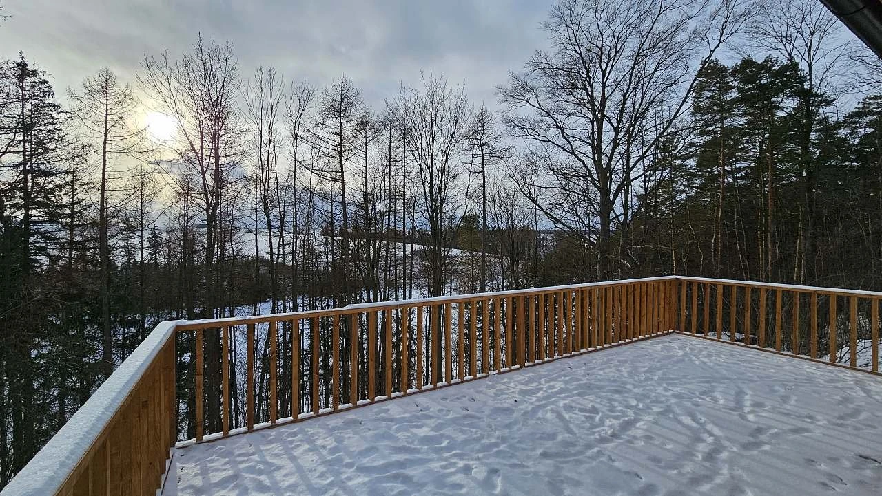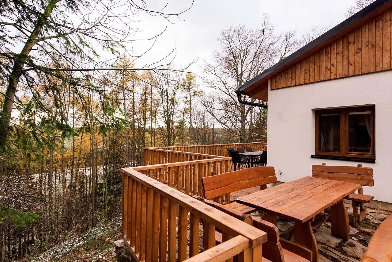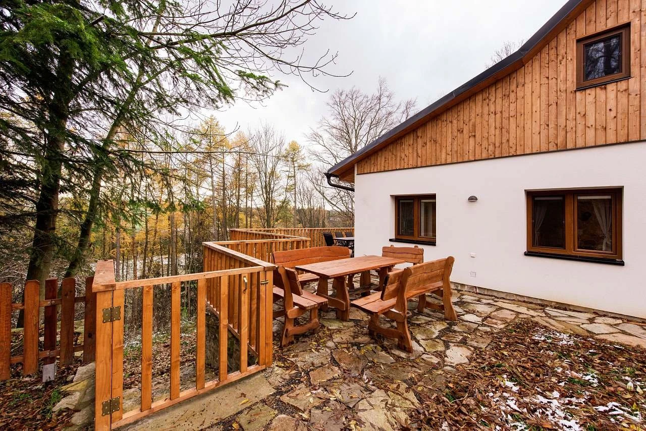Objekt je oplocený, nachází se na konci obce, což zajišťuje soukromí a klid. K dispozici jsou tři venkovní posezení: zastřešená terasa, venkovní posezení u dětského koutku a slunečná terasa s výhledem do lesa.