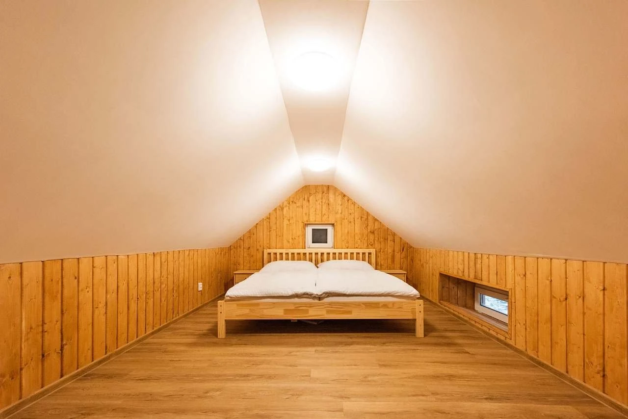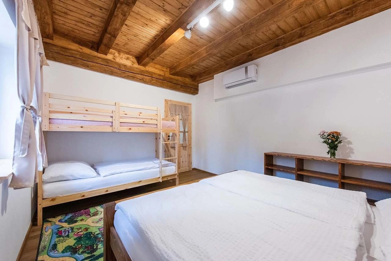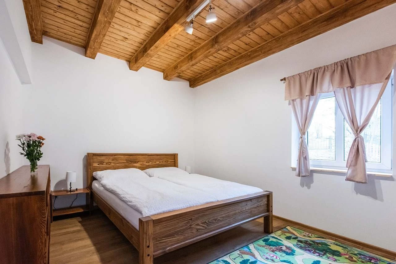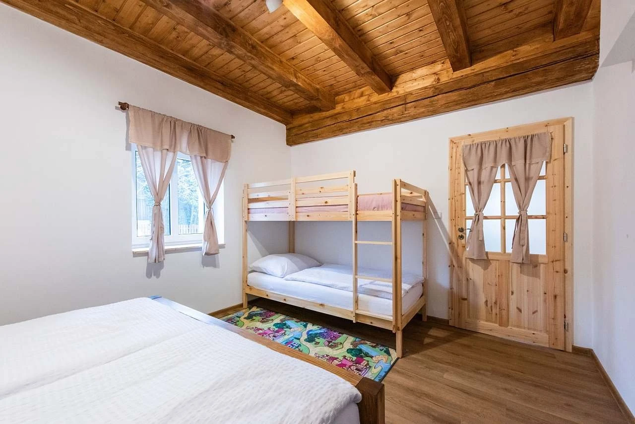 - Přízemí: prostorná ložnice s manželskou postelí a dvoupatrovou postelí