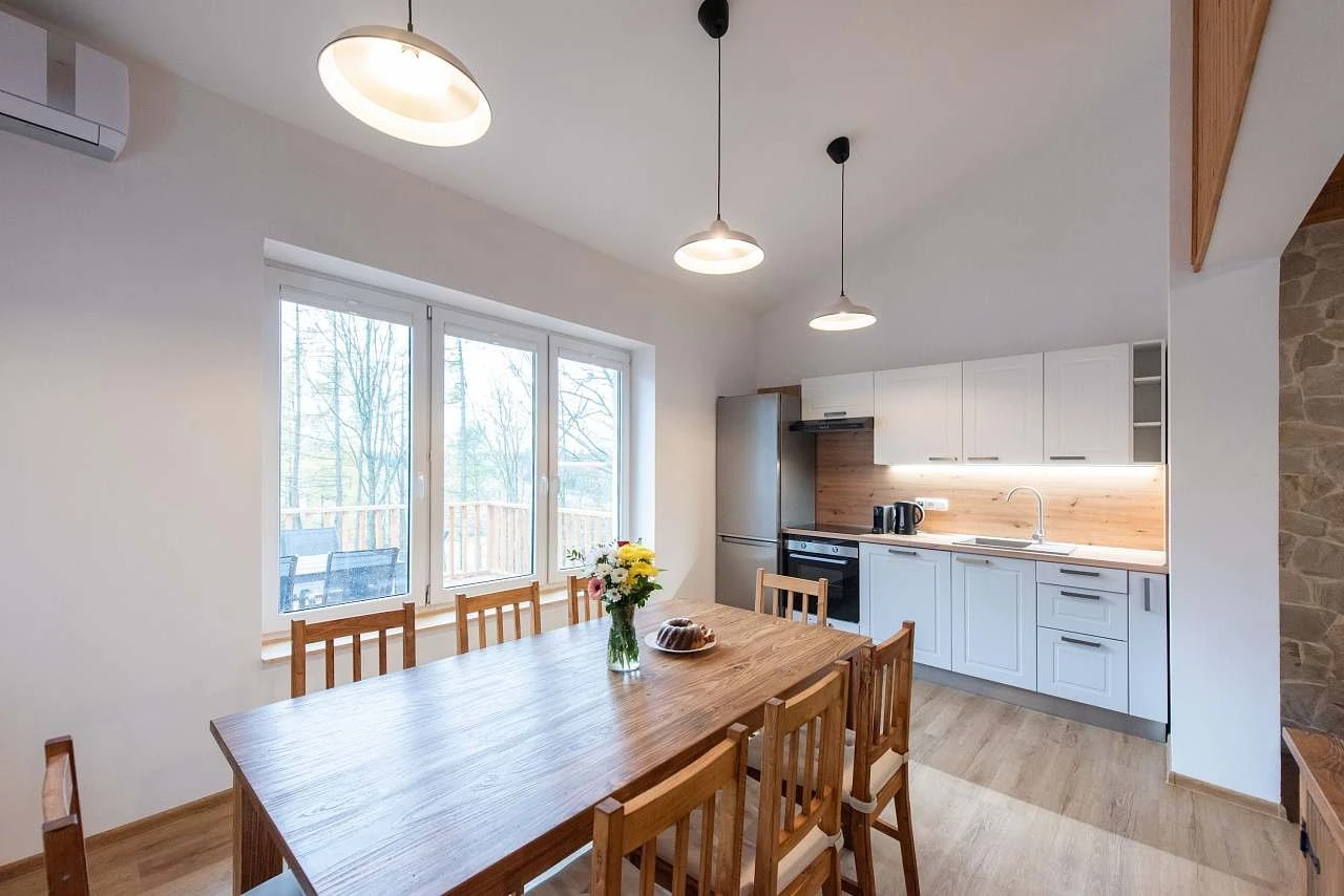 V přízemí se nachází centrální společenská místnost s kuchyní a jídelnou a prostorná ložnice s manželskou postelí a dvoupatrovou postelí. Všechny matrace jsou nové, kvalitní a velikosti 90 × 200 cm.